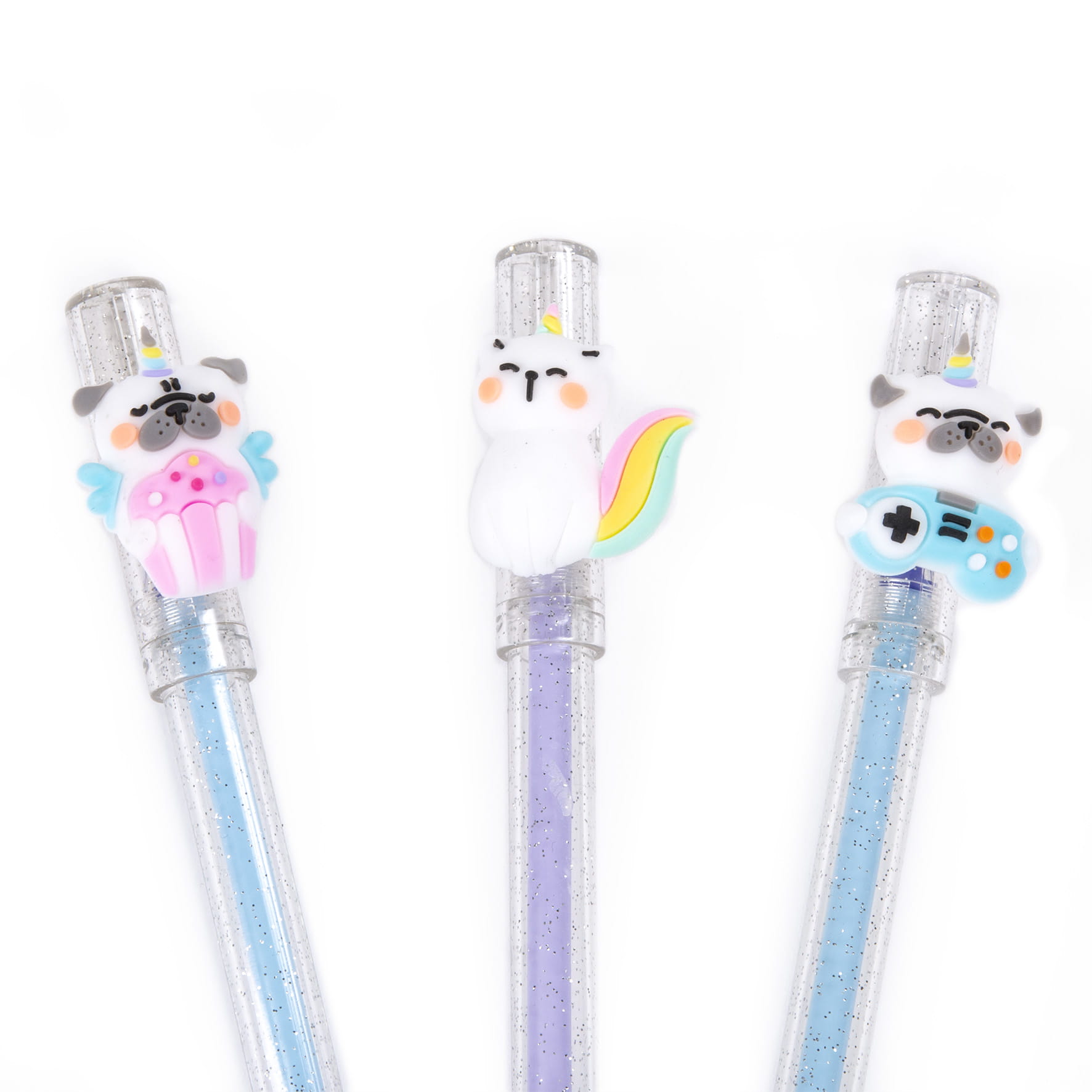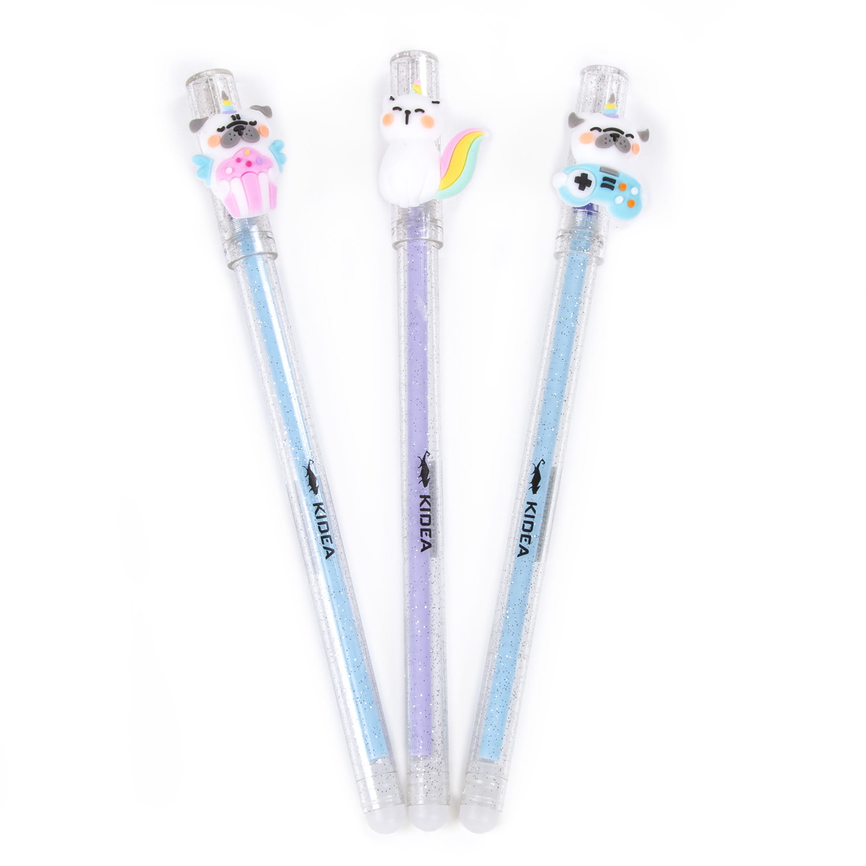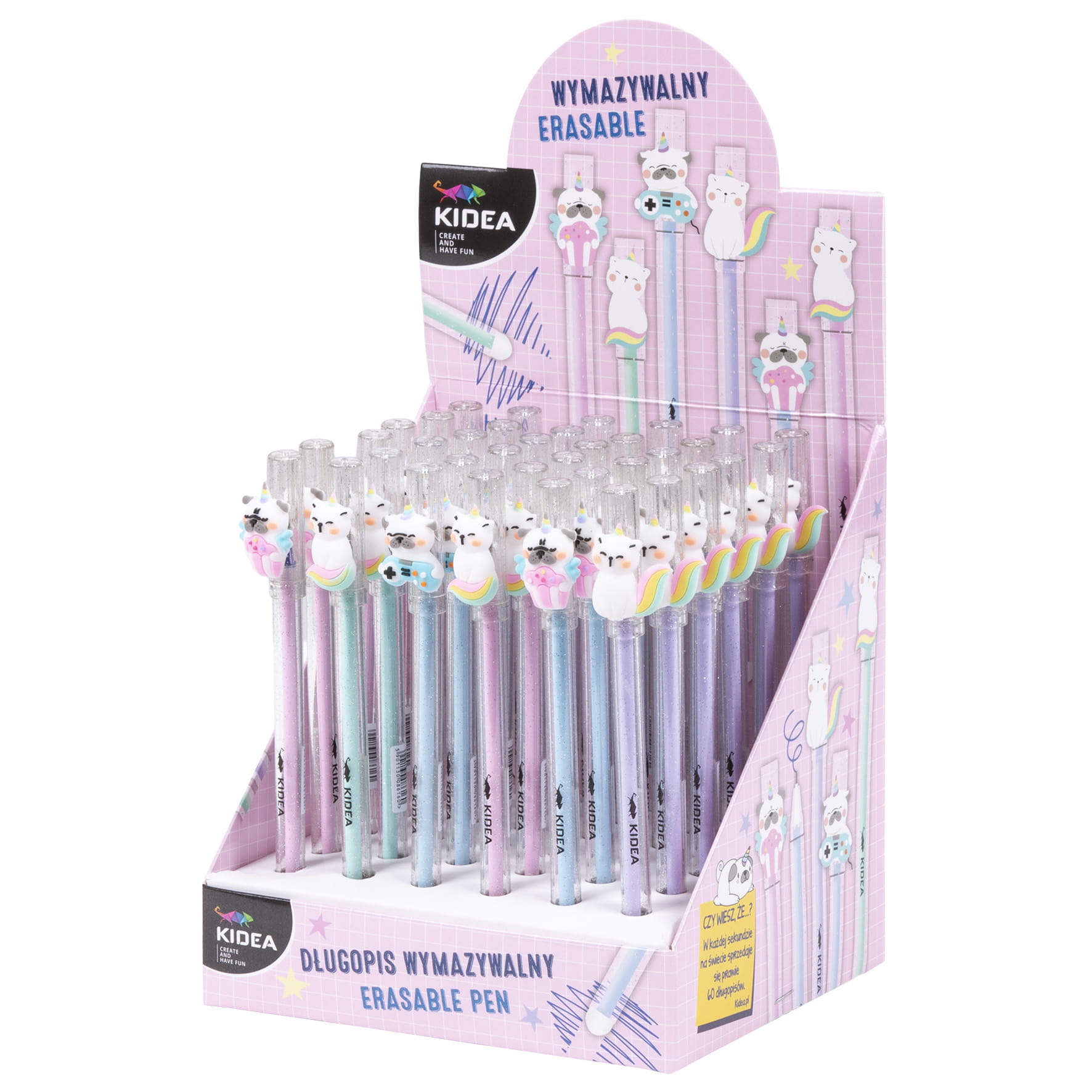Długopis wymazywalny z przezroczystym brokatowym korpusem oraz figurką w kształcie zwierzaka. Zatyczka długopisu ozdobiona słodkim motywem uatrakcyjnia produkt i sprawia, że dzieci czerpią ogromną radość z jego użytkowania. Do wyboru 4 wzory: piesek z gamepadem i rogiem jednorożca, piesek ze słodką babeczką, skrzydełkami i rogiem jednorożca oraz 2 wzory kotków z tęczowym ogonem i rogiem jednorożca. Długopis wymazywalny idealnie sprawdzi się w szkole, a dzięki gumce znajdującej się na końcu długopisu wymażemy każdy popełniony podczas pisania błąd. Precyzyjna końcówka sprawia, że pisanie nim to czysta przyjemność. Wkład niebieski 0,7 wymienny.