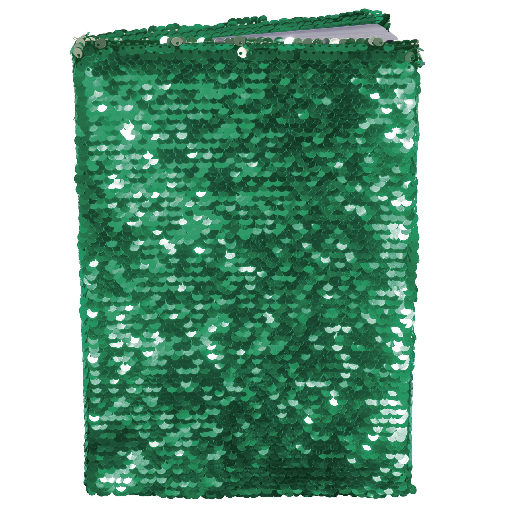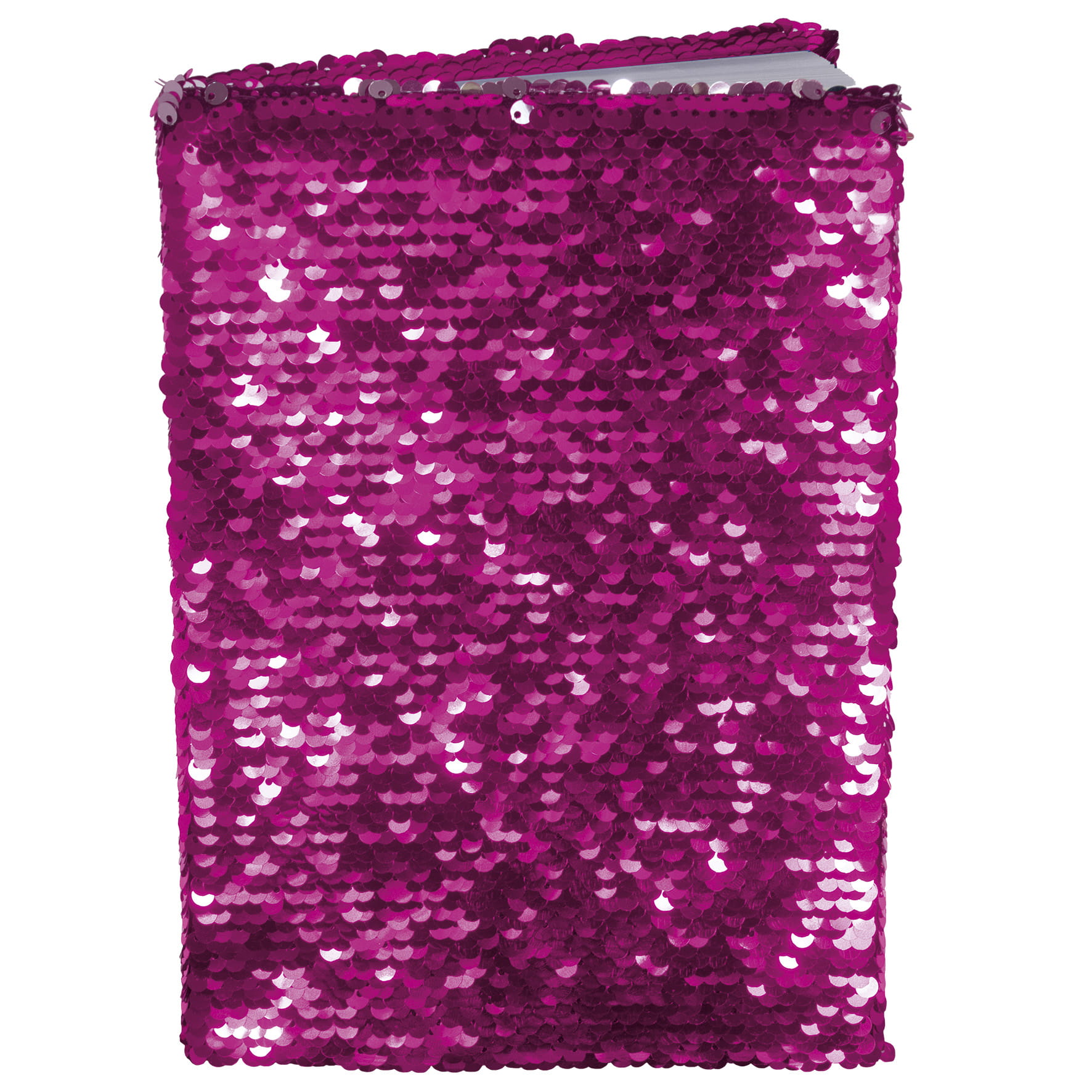 Notes w formacie A5, okładka ozdobna wykonana jest ze sztywnej tektury, zdobionej dwukolorowymi cekinami. Ulkład cekinów umożliwia zmianę ich położenia co daje bardzo ciekawe efekty. Karteczki w notesie w kolorze białym z nadrukowanymi kropeczkami co ułatwia pisanie w linii prostej. Notes zawiera 80 kartek o gramaturze 80g/m². Notesy dostępne są w trzech kolorach: niebieskim, malinowym, zielonym.