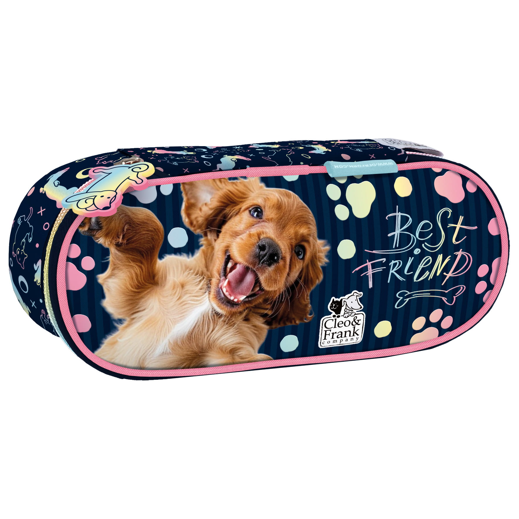 Jednokomorowy usztywniany piórnik zapinany na zamek z ozdobną zawieszką, którego wnętrze całkowicie wykończone jest podszewką.