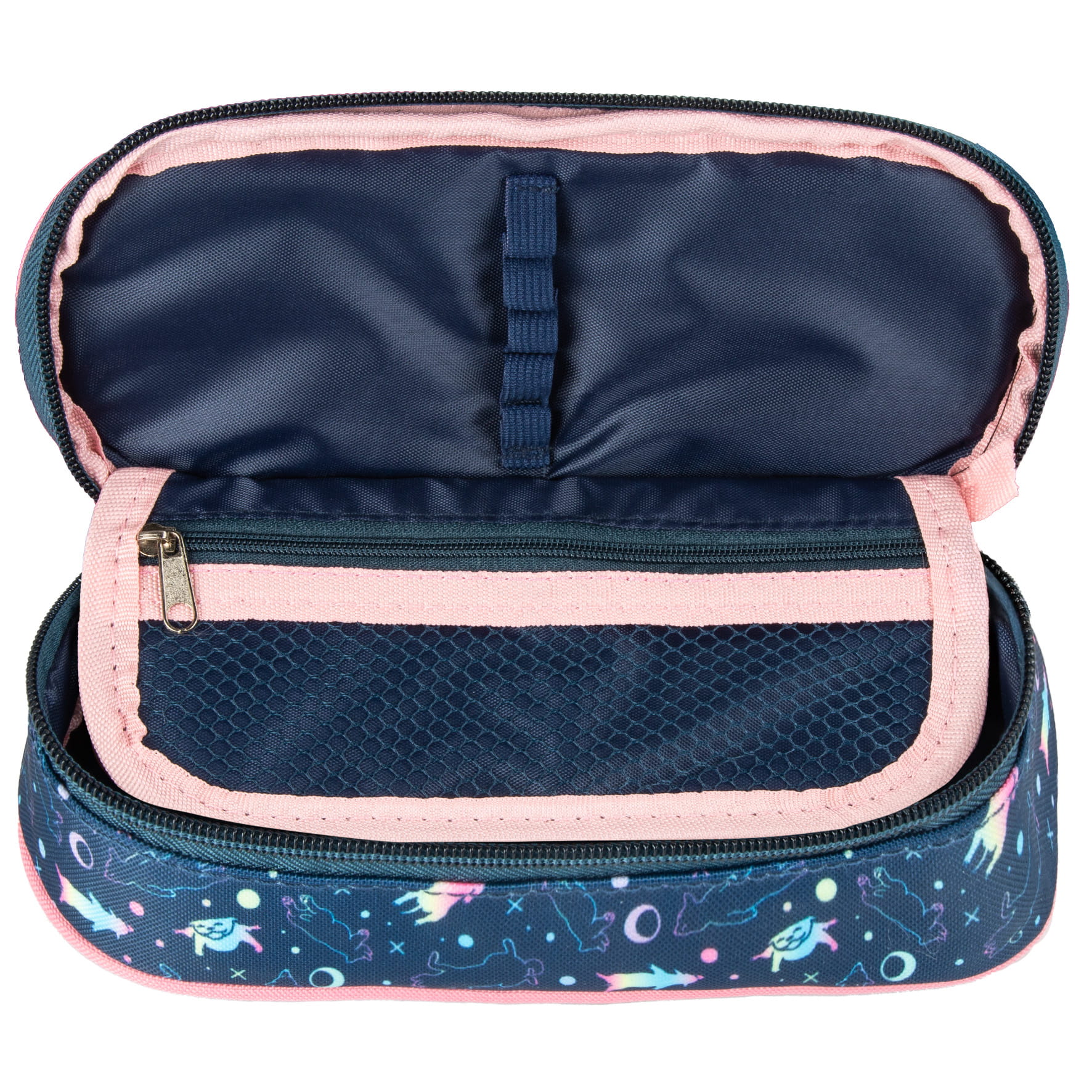 Wewnętrzna klapka posiada gumkę na 5 sztuk przyborów do pisania, dodatkowo w piórniku znajduje się klapka z gumką na 4 sztuki przyborów oraz kieszonką z siateczki zapinaną na zamek.