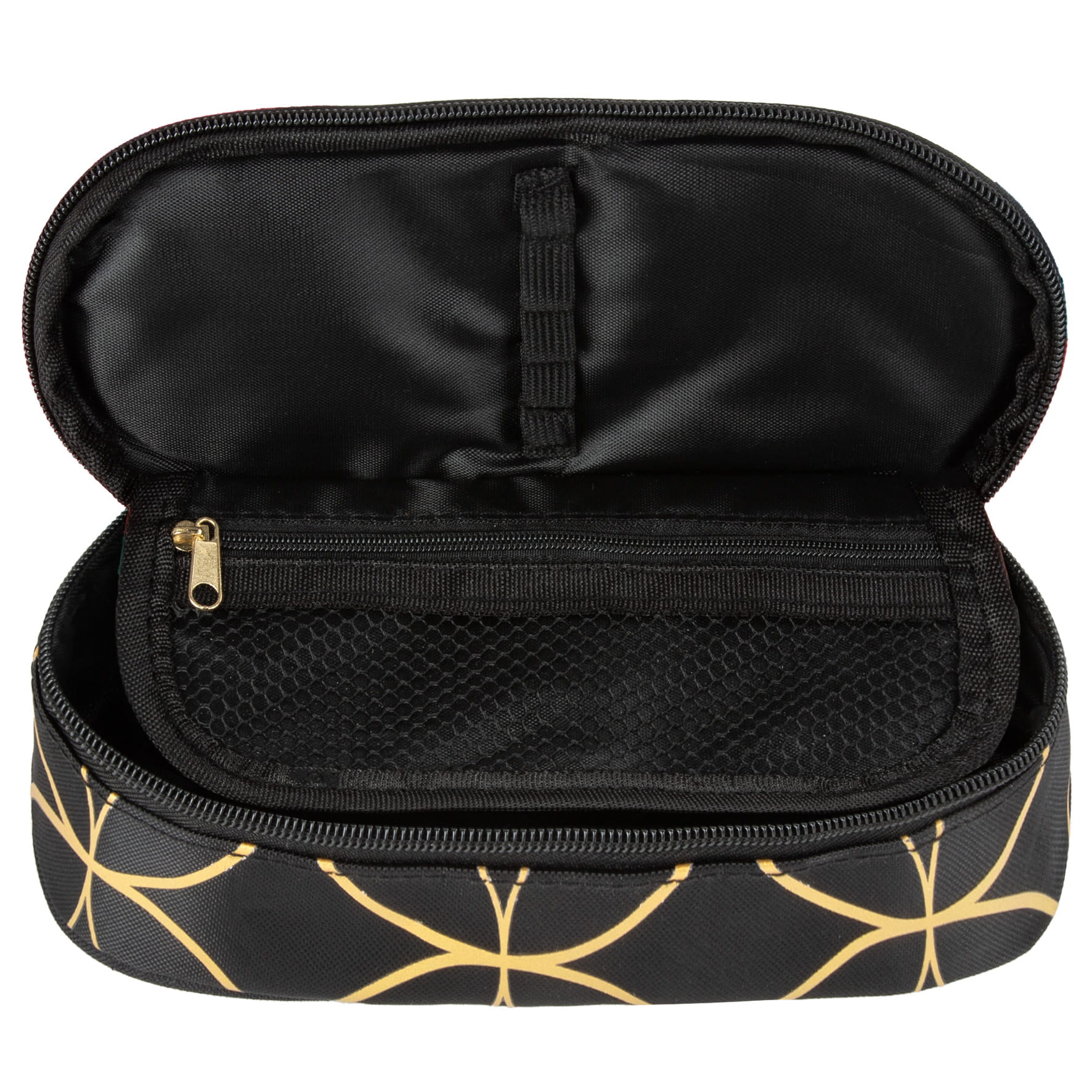 Wewnętrzna klapka posiada gumkę na 5 sztuk przyborów do pisania, dodatkowo w piórniku znajduje się klapka z gumką na 4 sztuki przyborów oraz kieszonką z siateczki zapinaną na zamek.