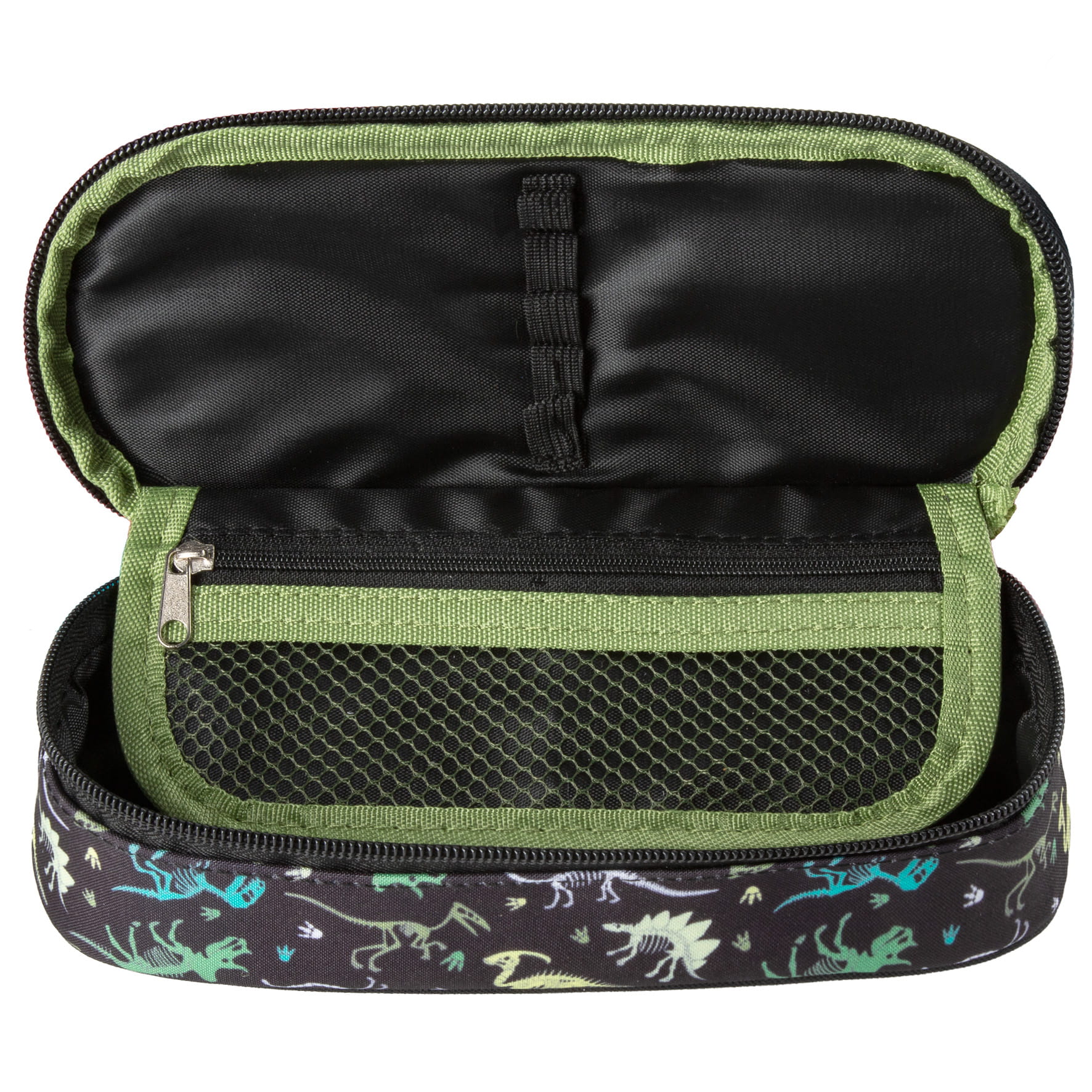 Wewnętrzna klapka posiada gumkę na 5 sztuk przyborów do pisania, dodatkowo w piórniku znajduje się klapka z gumką na 4 sztuki przyborów oraz kieszonką z siateczki zapinaną na zamek.
