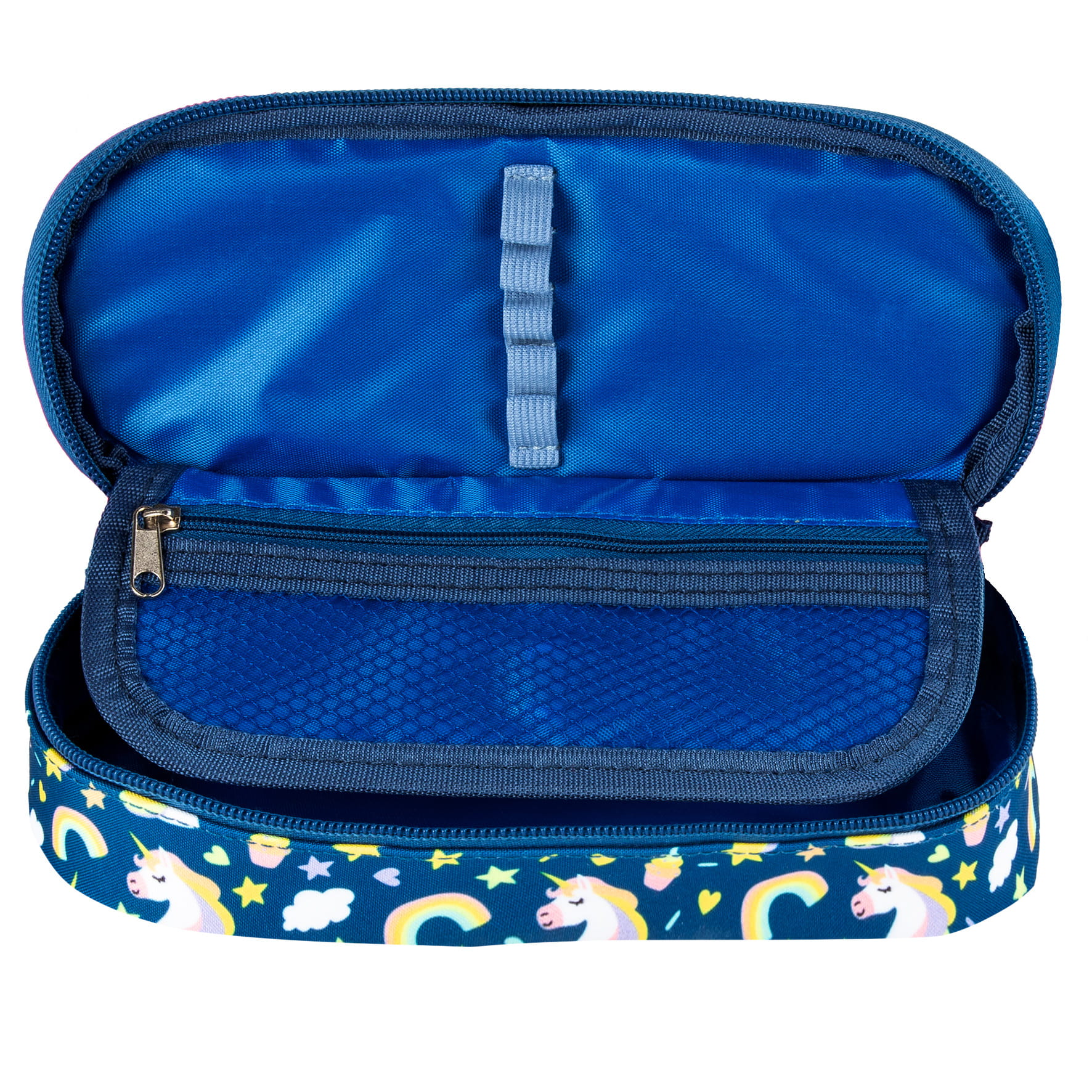 Wewnętrzna klapka posiada gumkę na 5 sztuk przyborów do pisania, dodatkowo w piórniku znajduje się klapka z gumką na 4 sztuki przyborów oraz kieszonką z siateczki zapinaną na zamek.
