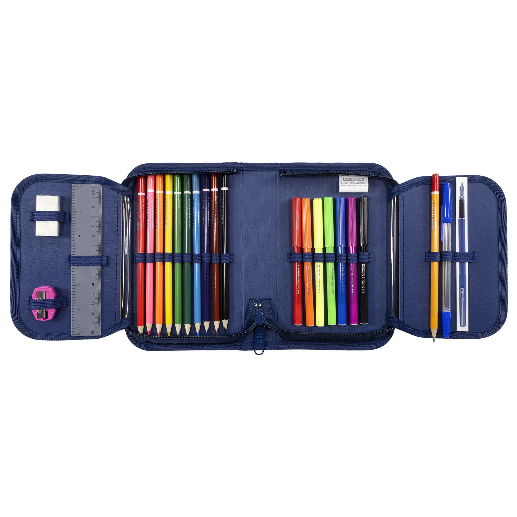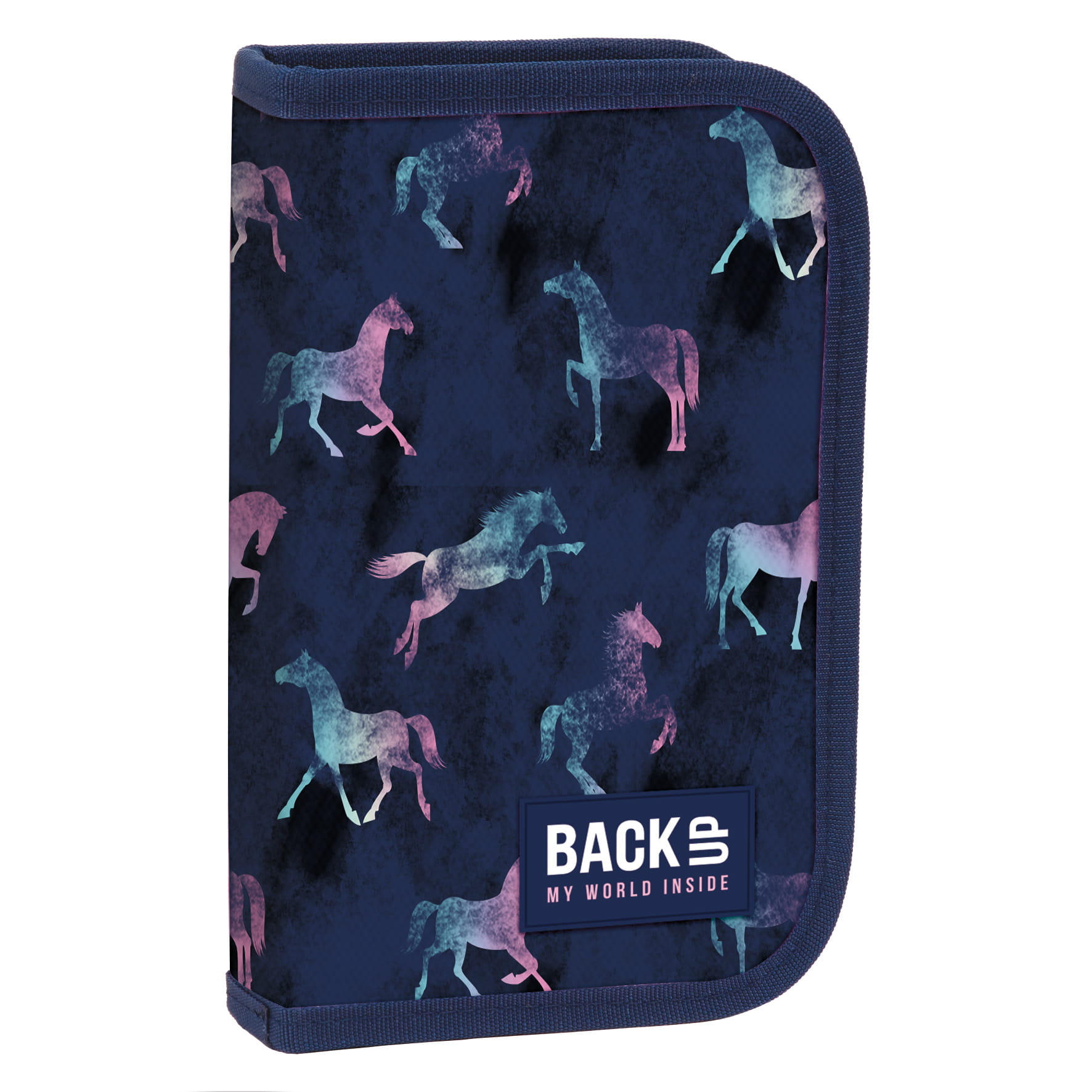 Nie wszystko musi być takie oczywiste i dosłowne. W końcu miłośniczki koni to dziewczyny pełne pasji i marzeń. Dlatego Backup stworzył dla Was wzór w odcieniach turkusu i różu na granatowym tle. Ombre, przetarcia i głęboki granat, czy może być piękniej? Zdecydowanie każda fanka jazdy konnej pokocha ten piórnik od pierwszego wejrzenia! Jednokomorowy piórnik BackUP z wyposażeniem posiada: