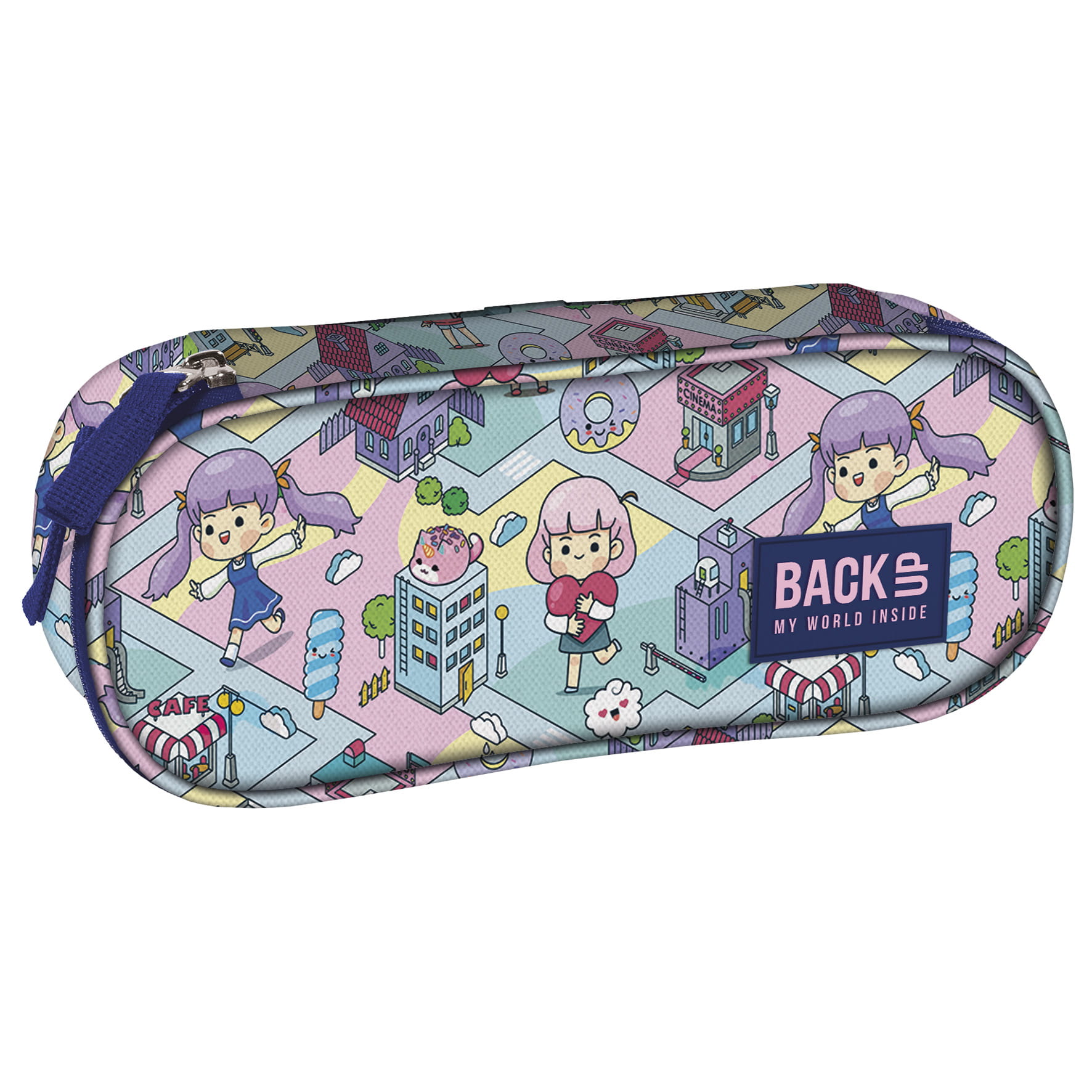 Pastelowy świat gry przeniesiony prosto na piórnik BackUP! Barwne postacie przemierzają miniaturową, zabawną krainę, napotykając na swojej drodze słodkie donuty, kolorowe lody i urocze zwierzaki. To w połączeniu z granatowymi detalami tworzy wyjątkową, dynamiczną kompozycję. Piórnik z kolekcji Doll Game stworzony został z myślą o najmłodszych fanach słodkiego stylu - kawaii. Jednokomorowy piórnik BackUP posiada: