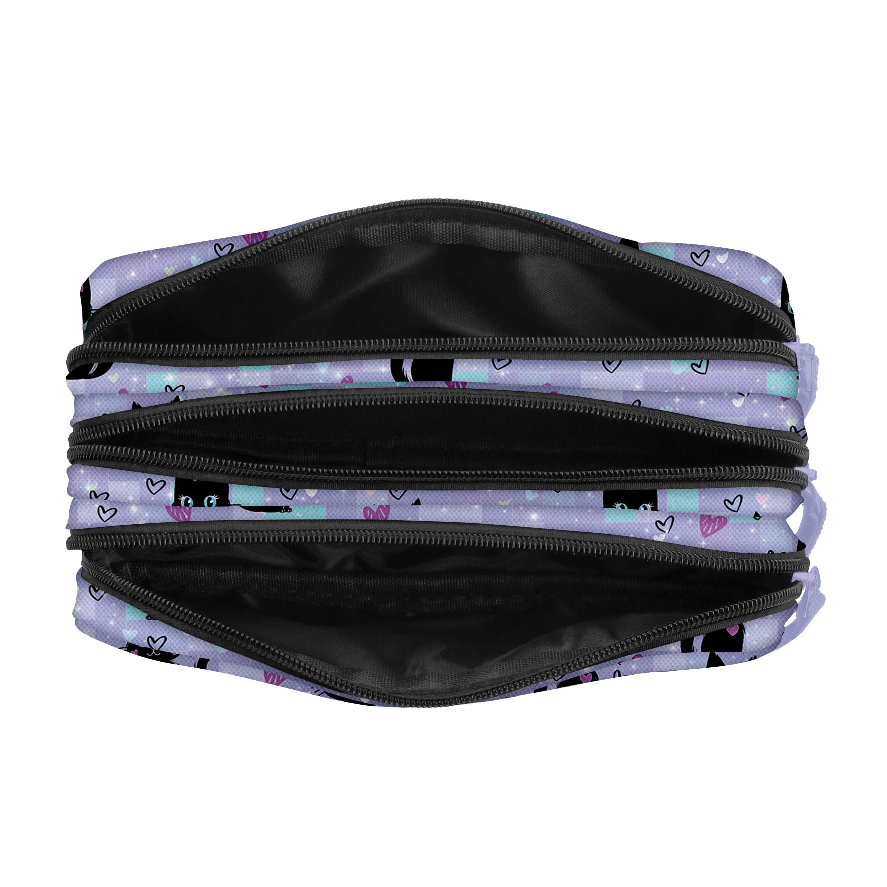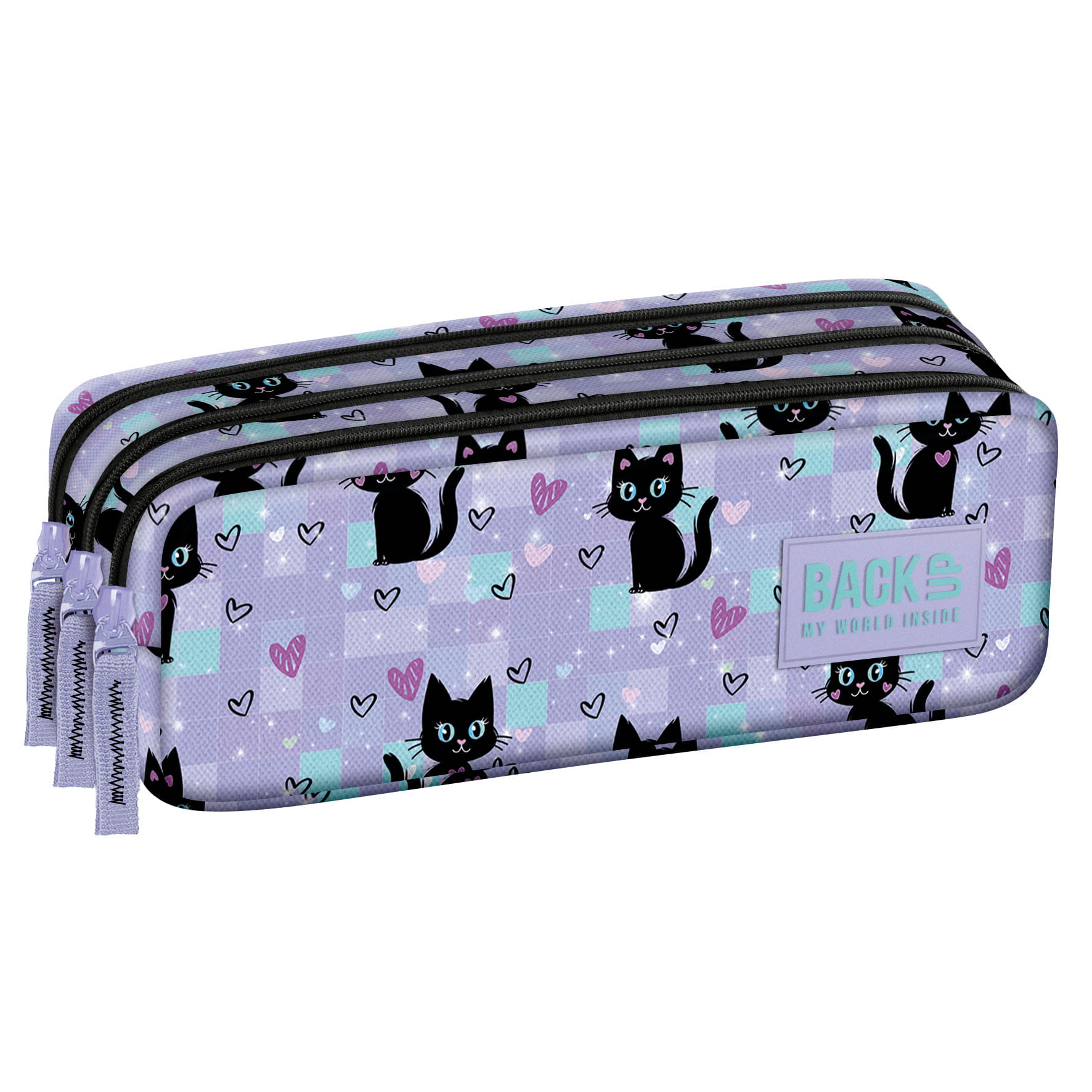 Magiczne koty, pełne czaru i tajemniczości. Hipnotyzują swoimi dużymi oczami. Wokół nich unosi się blask, a serduszka dodają delikatności. Fiolet doskonale współgra z ich niepowtarzalnymi, turkusowymi oczami. Ten piórnik to połączenie prawdziwej magii i uroku. Idealny dla osób, które kochają oryginalne akcenty w swojej codziennej stylizacji.