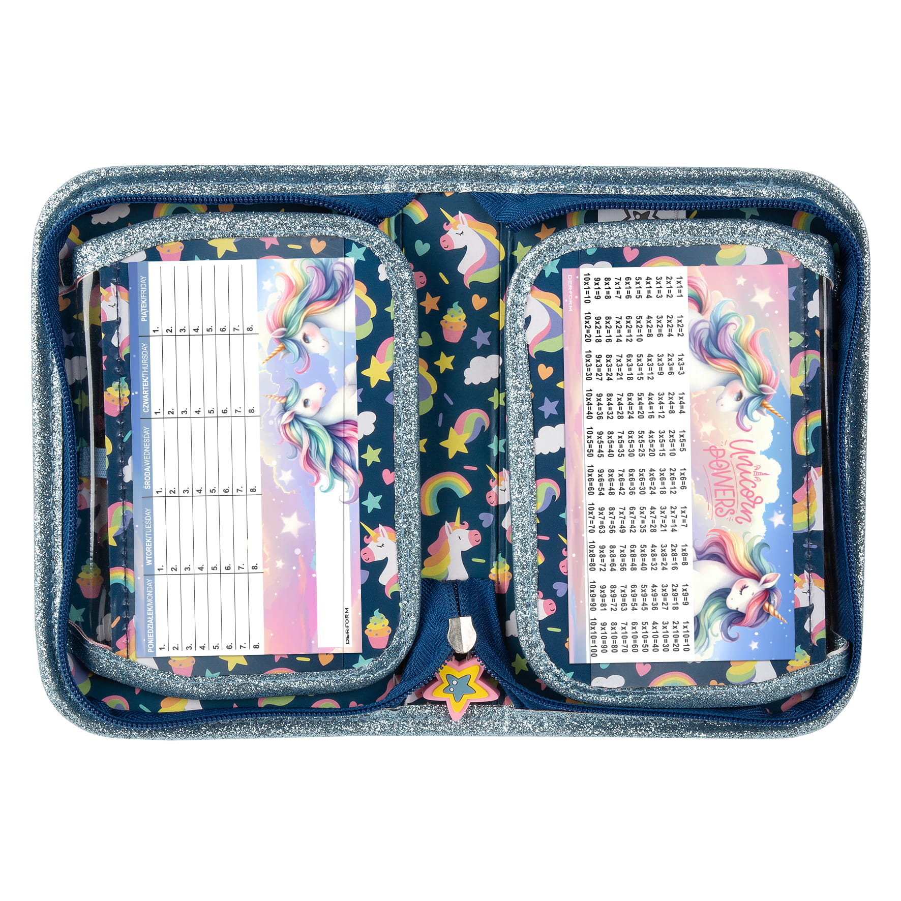 Piórnik jednokomorowy z wyposażeniem, zapinany na zamek błyskawiczny zakończony ozdobnym suwakiem. Wewnątrz znajdują się dwie dodatkowe klapki. Piórnik posiada nadruk ozdobny nie tylko na zewnątrz, ale także na wybranych elementach wyposażenia. W skład wyposażenia wchodzi: 10 kredek ołówkowych, 7 pisaków, linijka 15cm, długopis, ołówek, temperówka, gumka do mazania. Dodatkowo w piórniku znajduje się tabliczka mnożenia oraz plan lekcji.