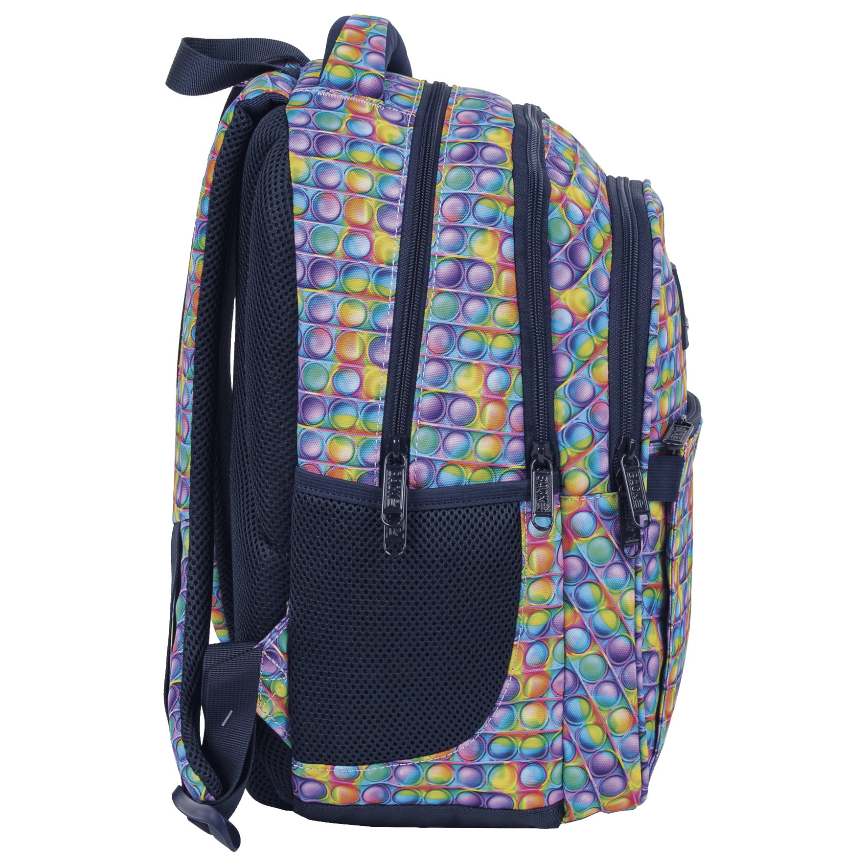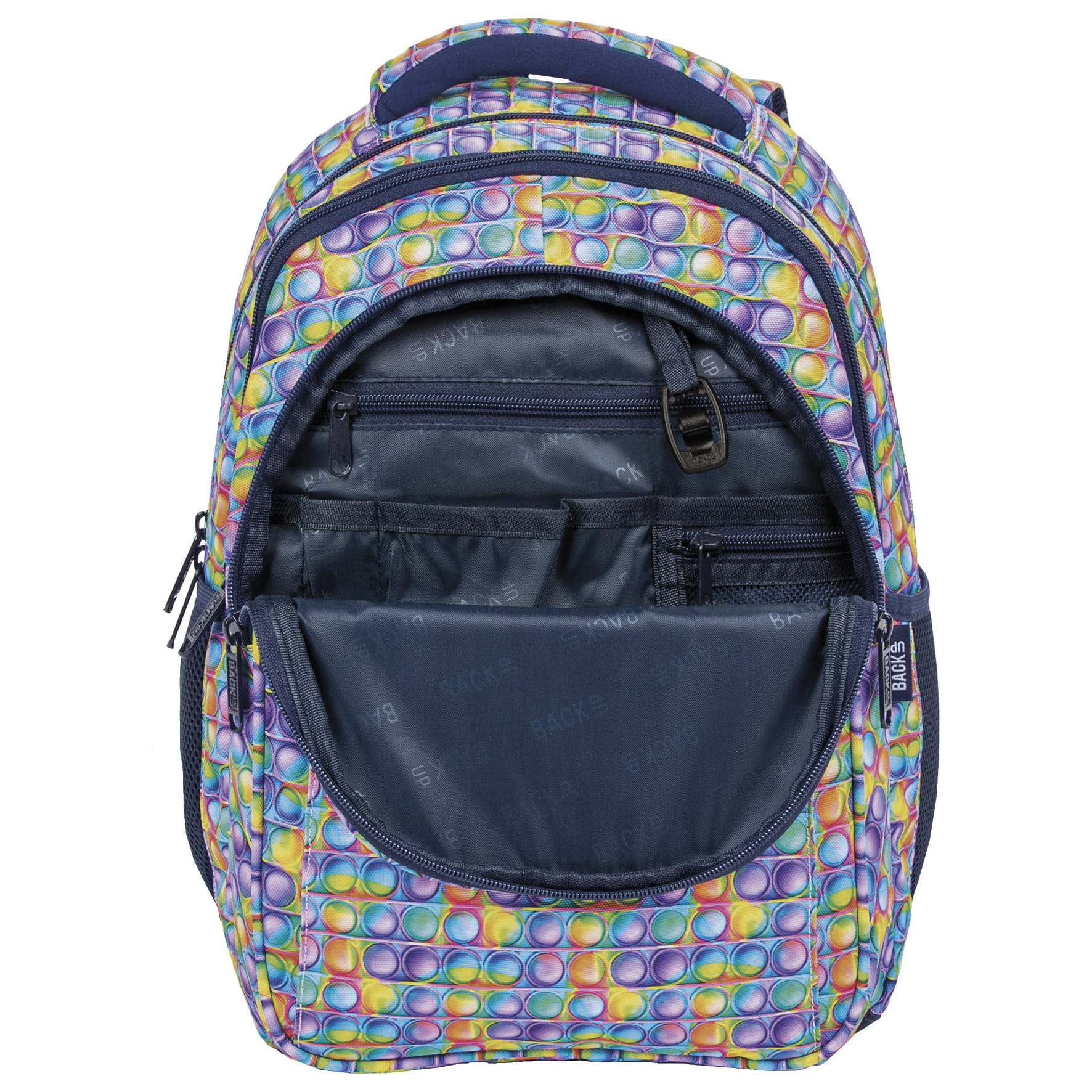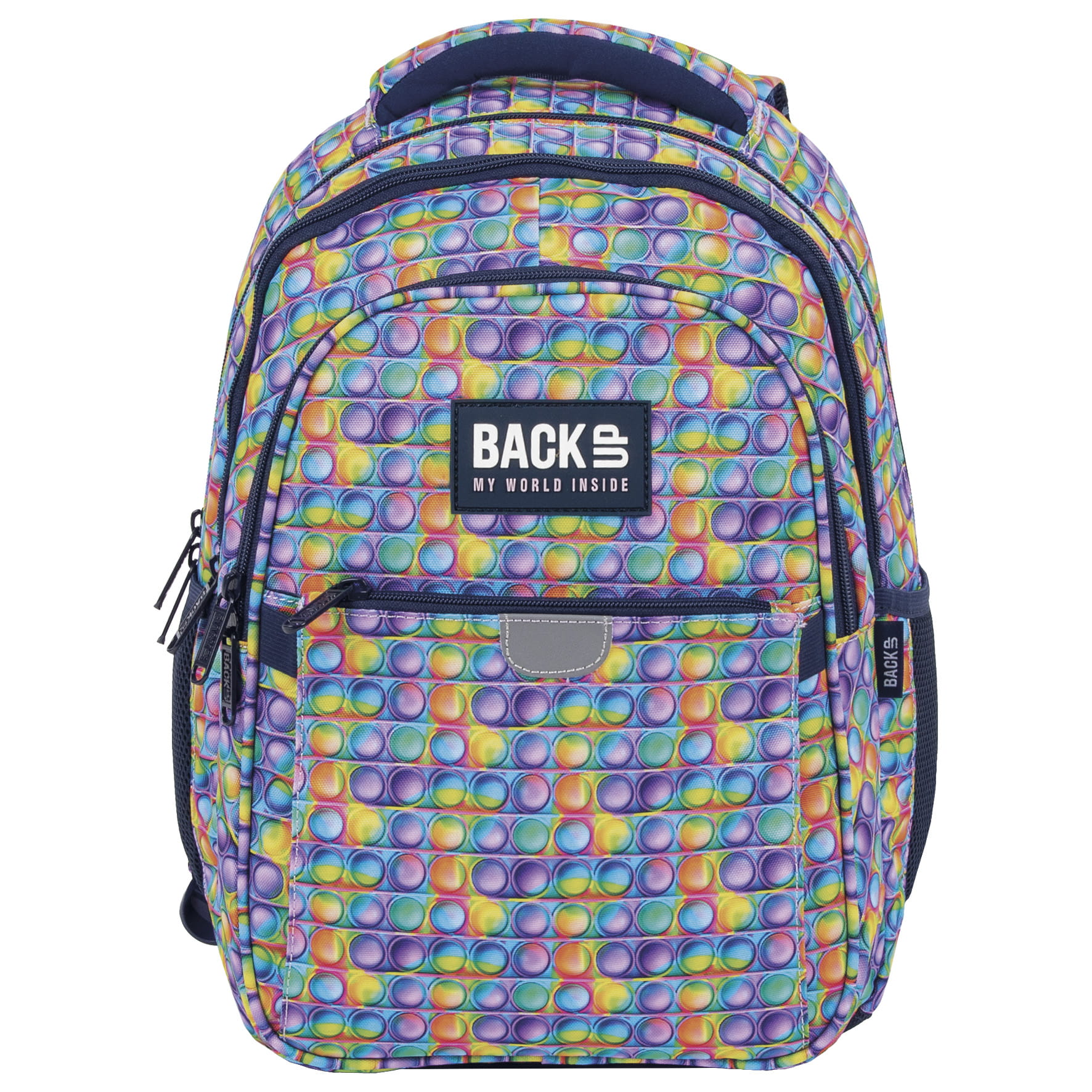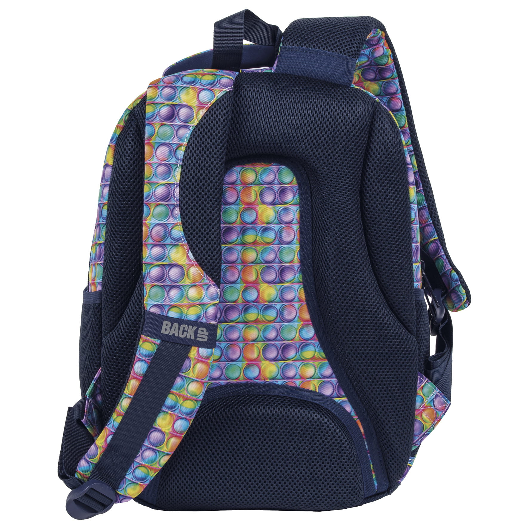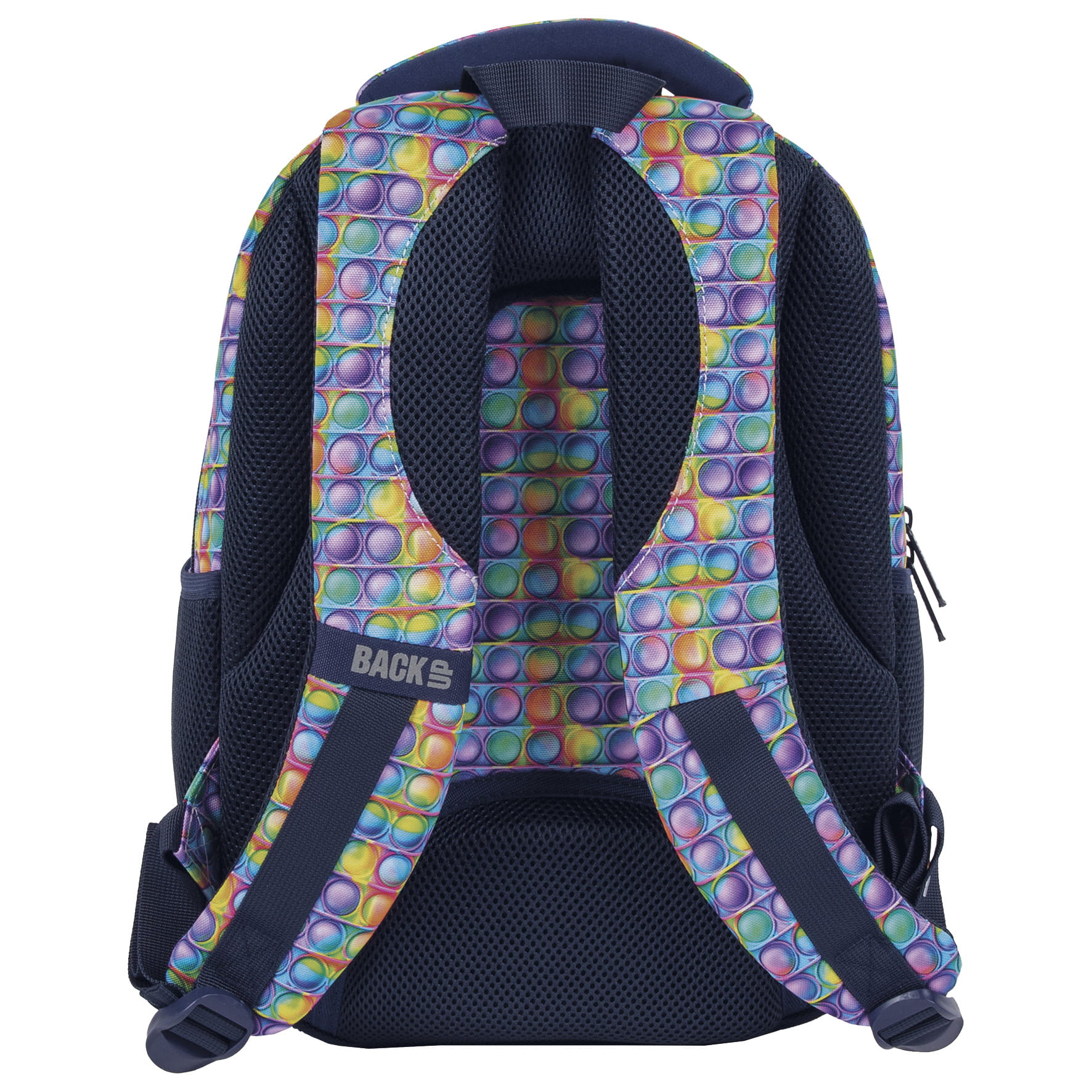 Pop it, czyli kolorowy, bąbelkowy fidget toy, robiący furorę, zawitał również na szkolne korytarze! Intensywne odcienie fioletu, zieleni, czerwieni, błękitu i żółci w połączeniu z modnym motywem bąbelków tworzą idealny plecak dla pierwszoklasisty. Jego rozmiar dopasowany został do drobnej postury dziecka, a zwariowane kolory dodadzą odwagi świeżo upieczonym uczniom, robiąc furorę wśród rówieśników. Plecak BackUP posiada: