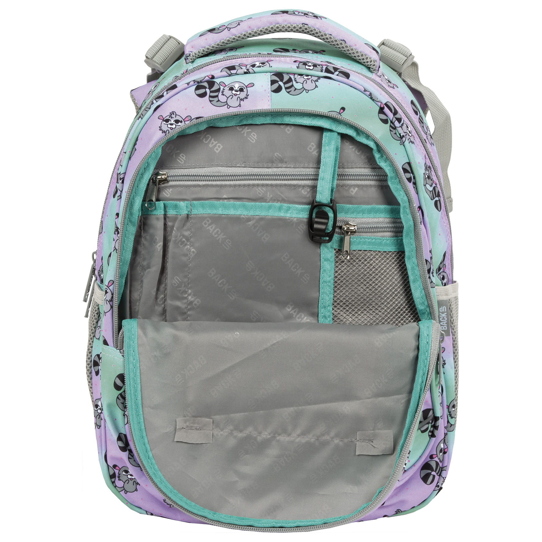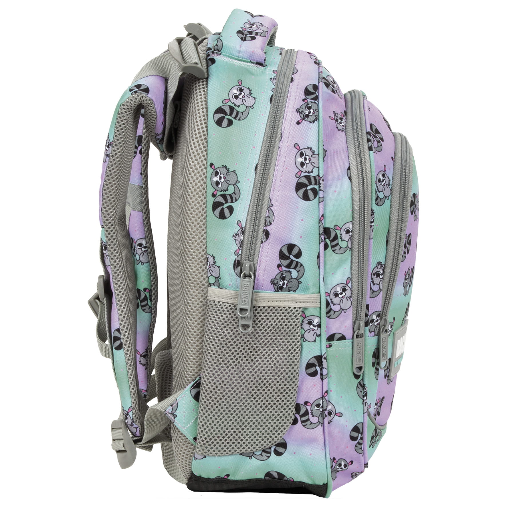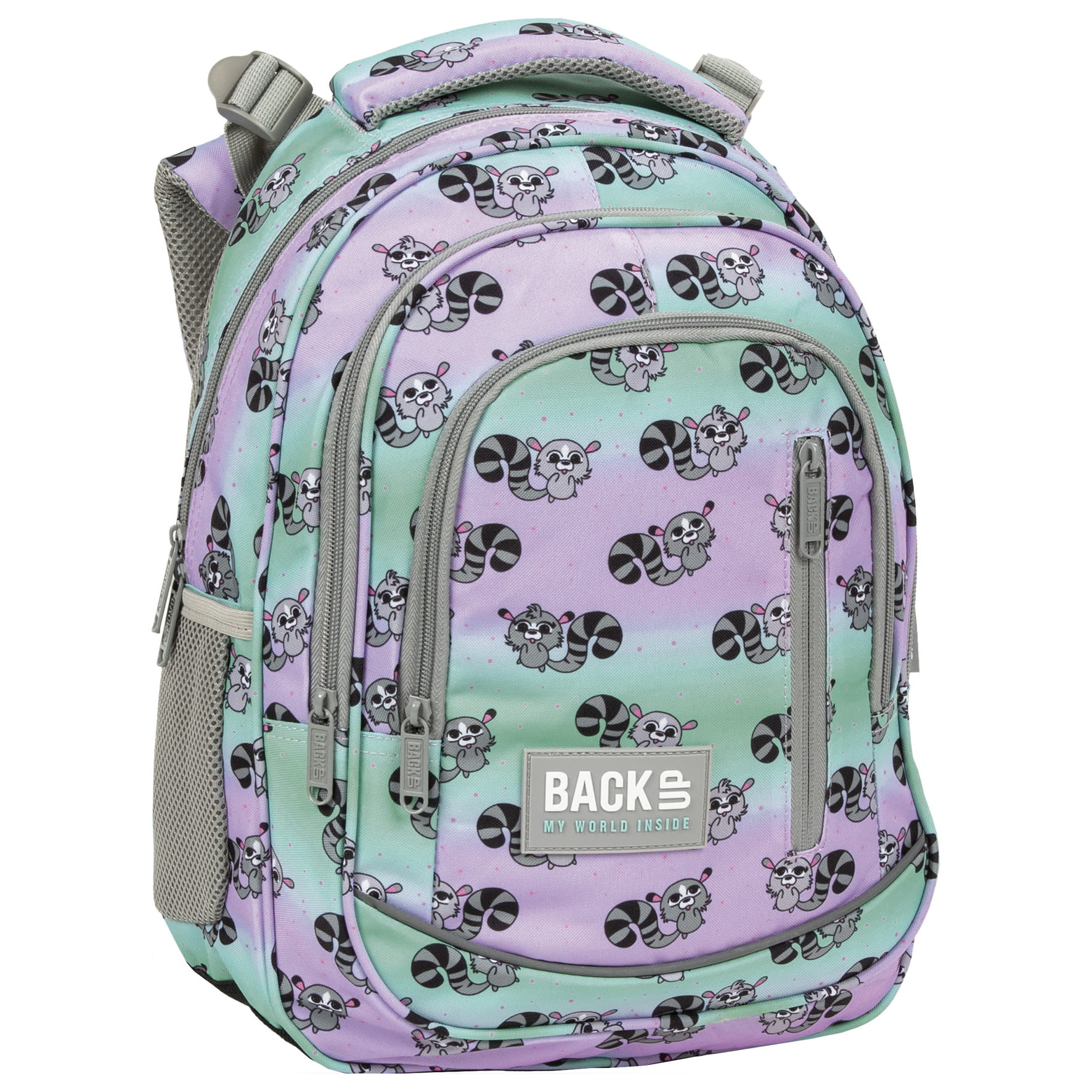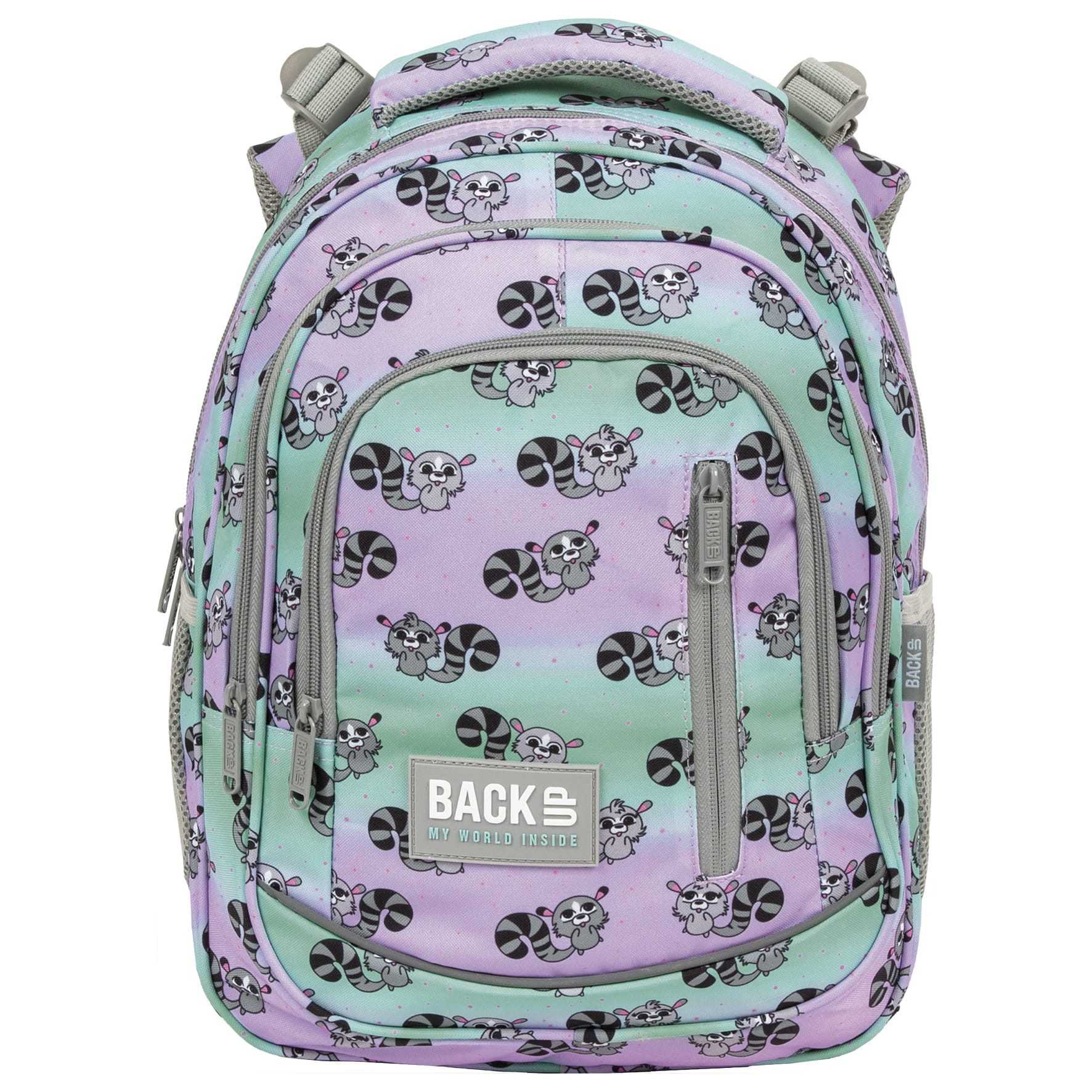 Niekwestionowany król Madagaskaru zagościł na plecaku BackUP! Sympatyczne lemury o biało-czarnych ogonach skaczą po materiale, wywołując uśmiech na twarzy i dodając energii. Nic dziwnego, że w towarzystwie pastelowego ombre z barw fioletu i turkusu tworzą tak urokliwą kompozycję. Tak wesołe towarzystwo w połączeniu z dopasowanym do drobnych rozmiarów dziecka rozmiarem, tworzy idealny plecak dla pierwszoklasisty. Plecak BackUP posiada: