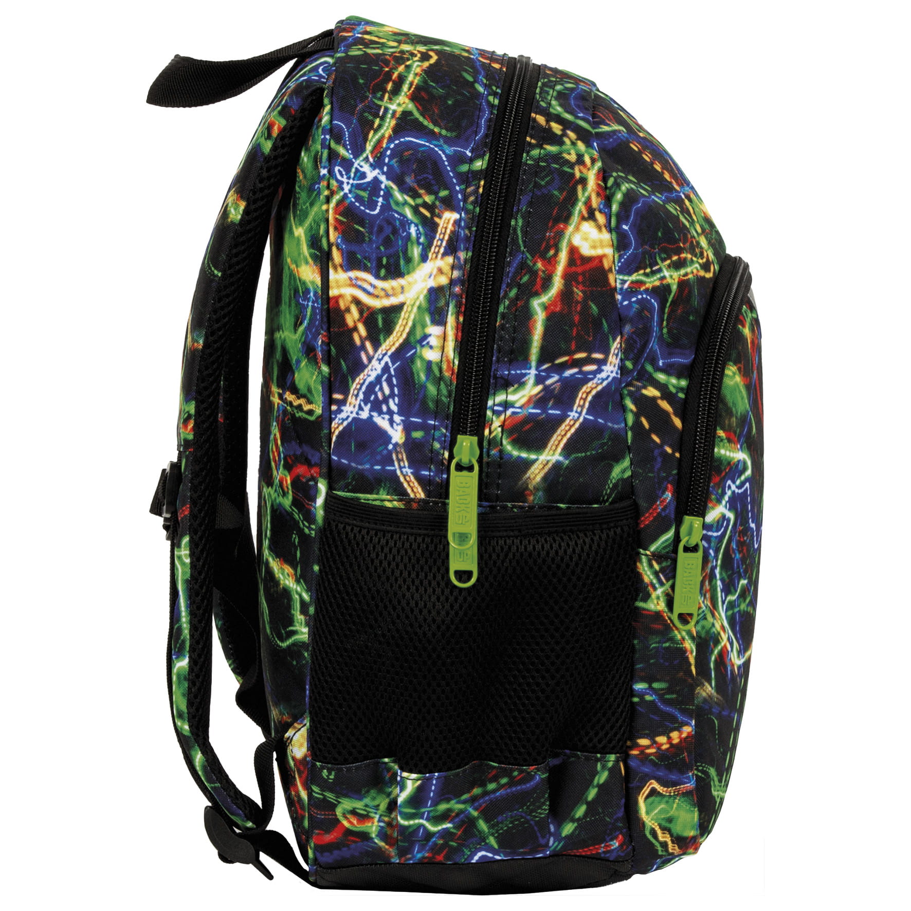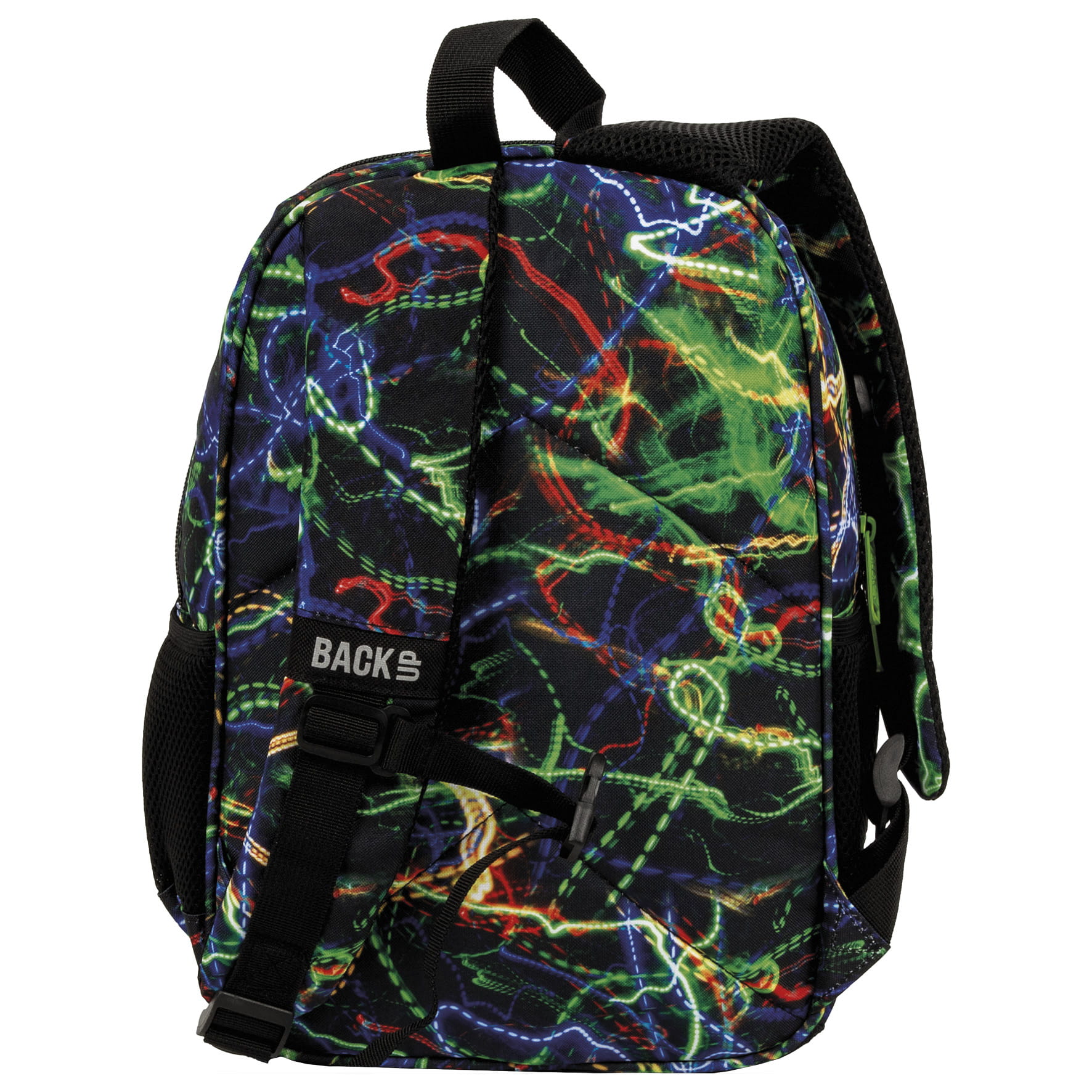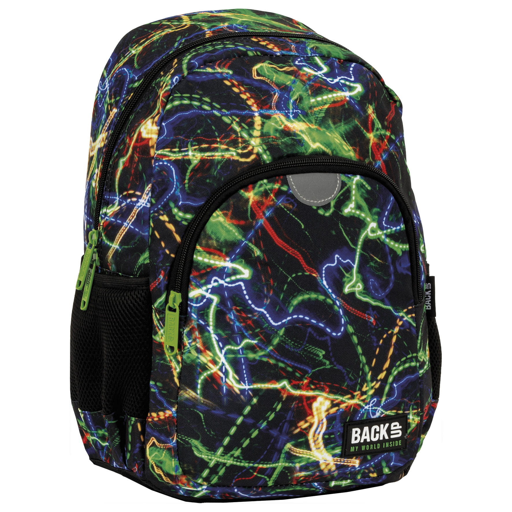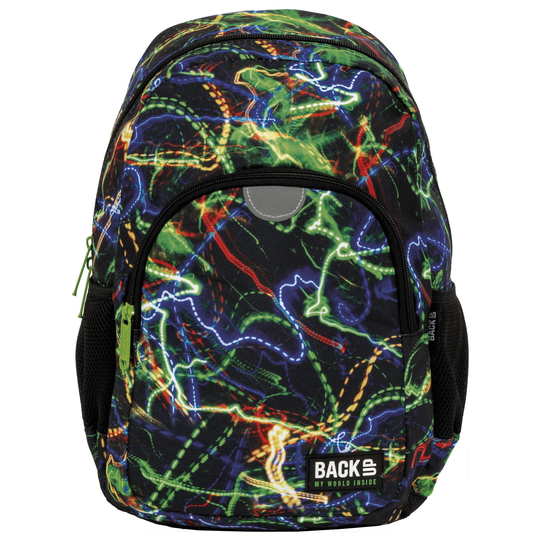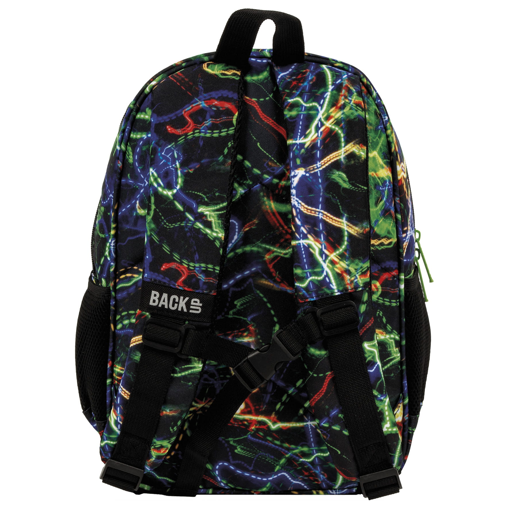 Pulsujące światła neonów tańczące w szalonym rytmie. Kolekcja Lights to wirujące połączenie żywych kolorów zieleni, czerwieni i granatu na kontrastującym czarnym tle materiału. Przepełniony energią, zawrotną szybkością, dynamiką i pasją, to plecak dla chłopca, który nie boi się wyzwań, pokonując je z pędkością światła. Dzięki rozmiarom dopasowanym do drobnej postury dziecka, to idealny plecak do przedszkola lub zerówki Plecak BackUP posiada: