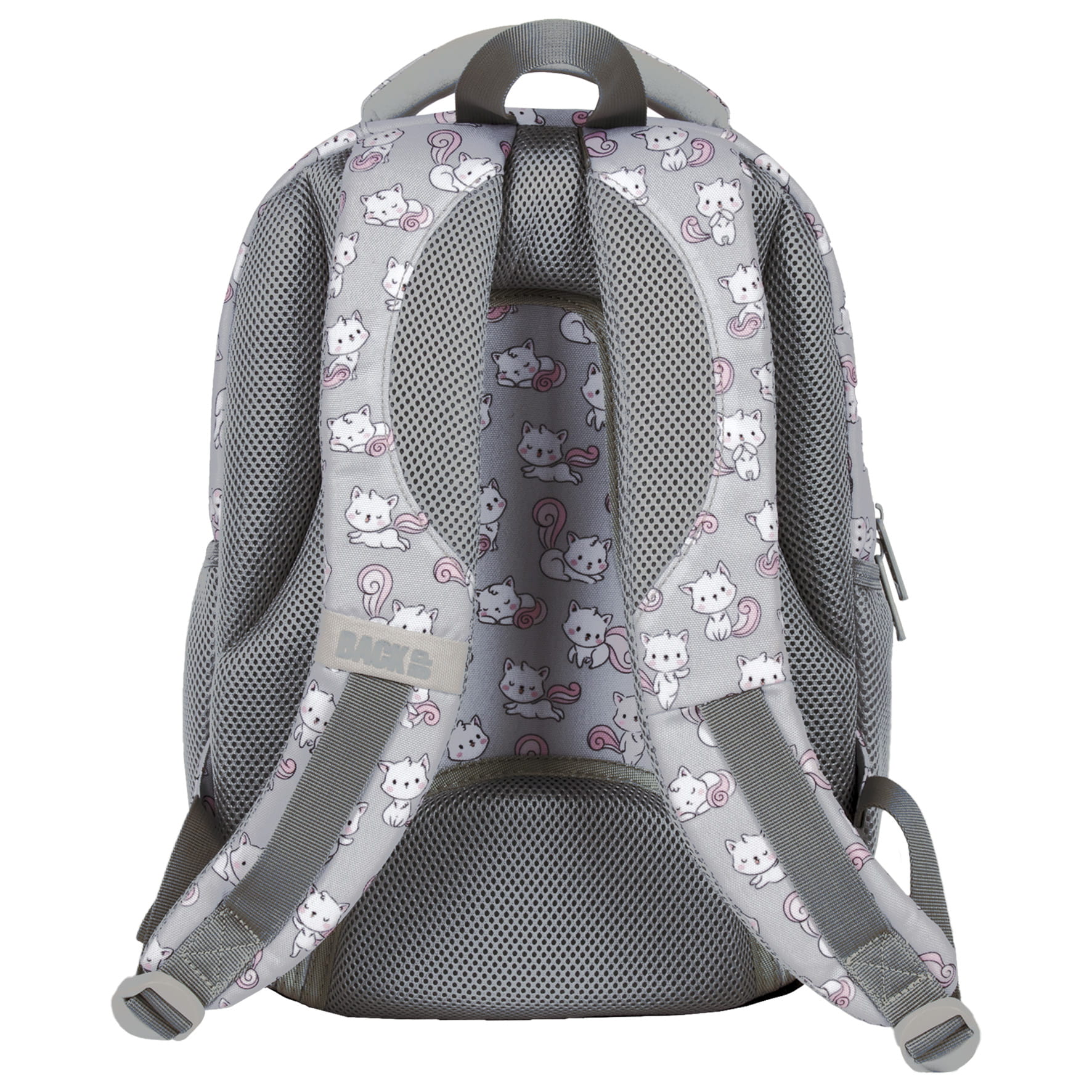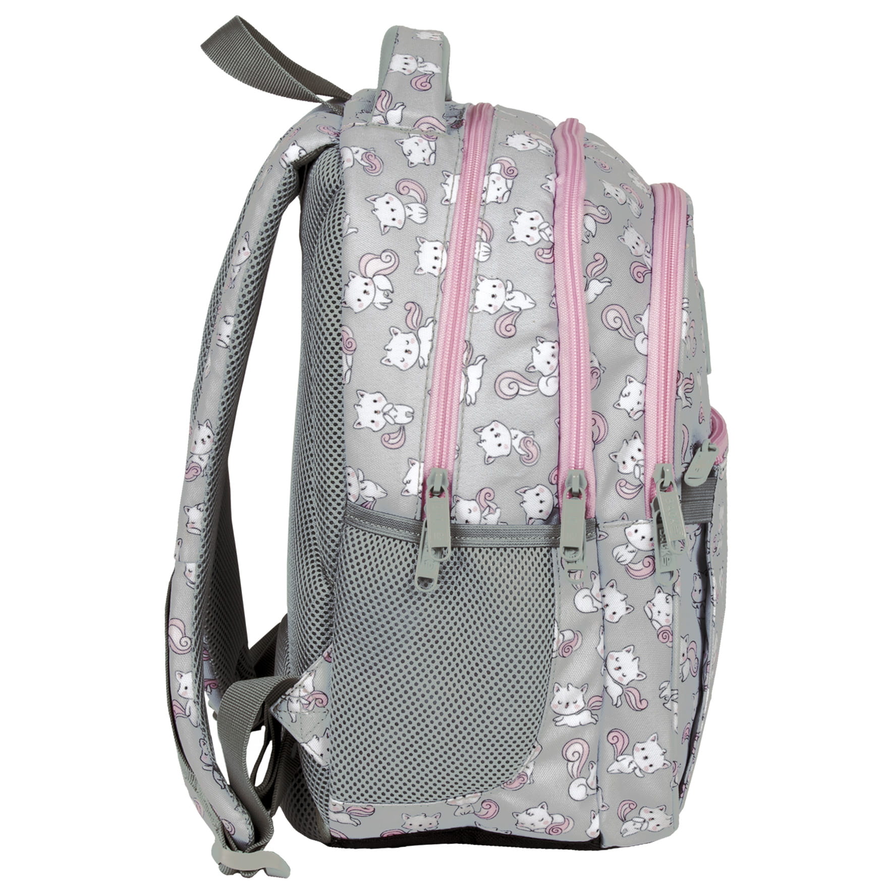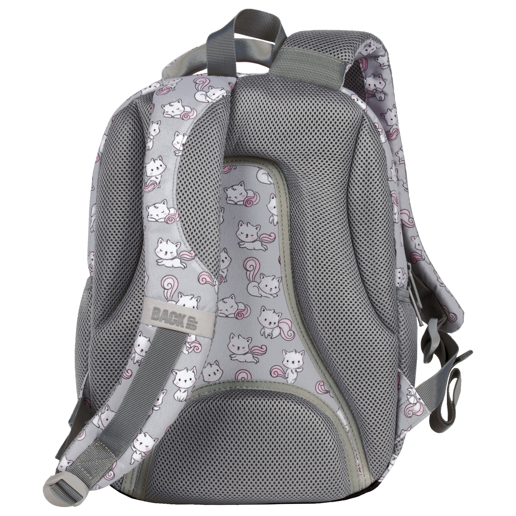 Białe kotki rozpoczęły swoje psoty, majestetycznie poruszając puszystymi, różowymi ogonkami. Skaczące, tańczące i śpiące zwierzaki dodają szaremu materiałowi plecaka dziewczęcego uroku. Różowe zamki dopełniają całości. Z tymi milusińskimi futrzakami każdy dzień w szkole staje się piękniejszy. Dzięki rozmiarom dopasowanym do drobnej postury dziecka, to idealny plecak dla pierwszoklasisty.