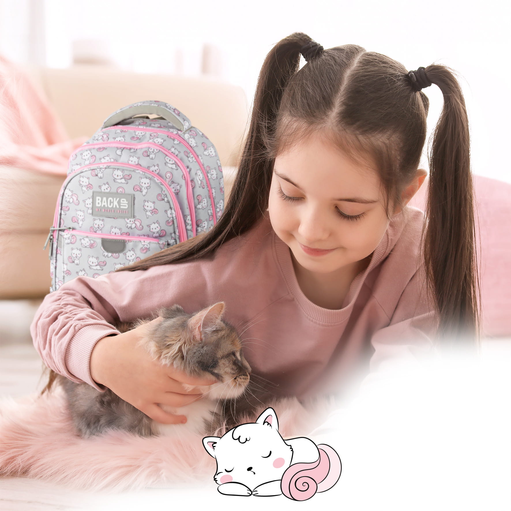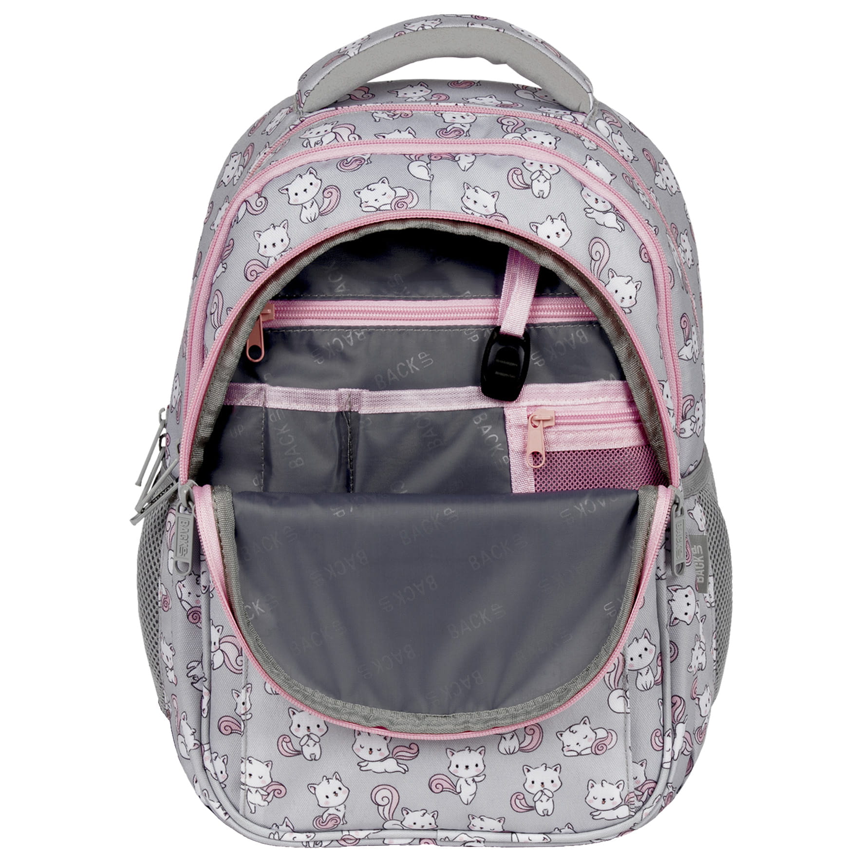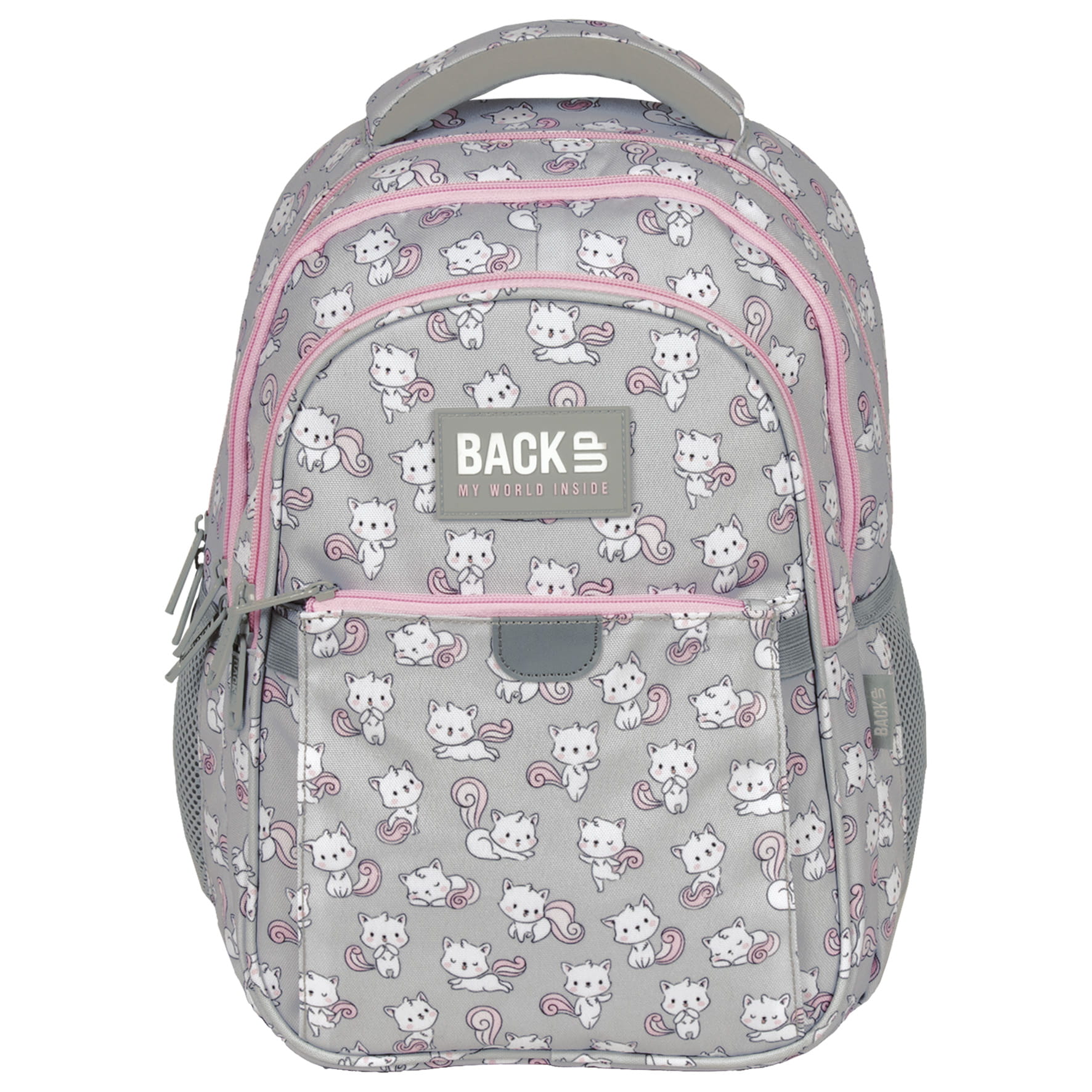 Białe kotki rozpoczęły swoje psoty, majestetycznie poruszając puszystymi, różowymi ogonkami. Skaczące, tańczące i śpiące zwierzaki dodają szaremu materiałowi plecaka dziewczęcego uroku. Różowe zamki dopełniają całości. Z tymi milusińskimi futrzakami każdy dzień w szkole staje się piękniejszy. Dzięki rozmiarom dopasowanym do drobnej postury dziecka, to idealny plecak dla pierwszoklasisty.