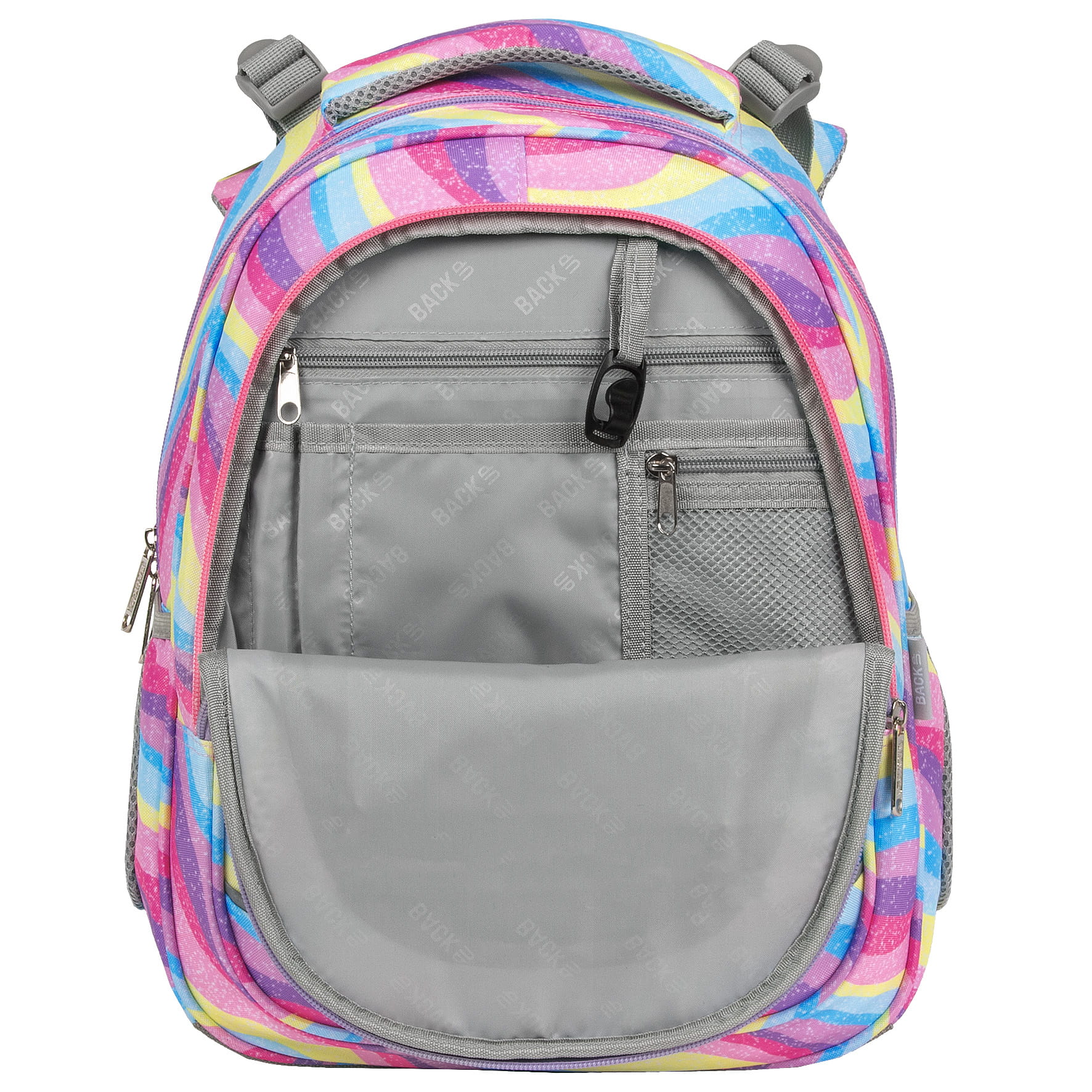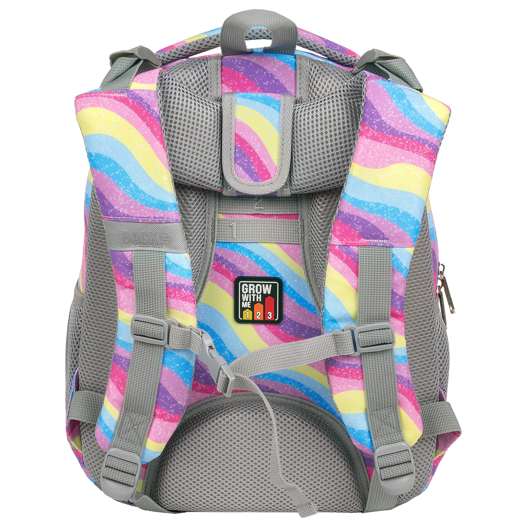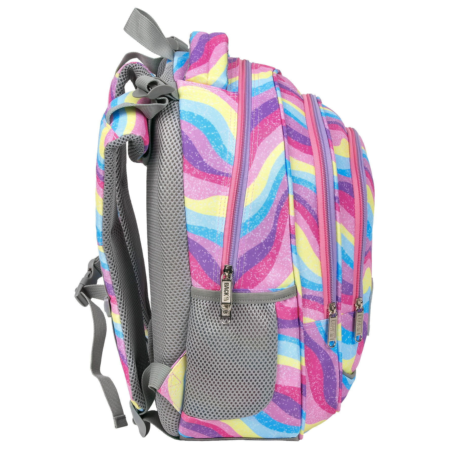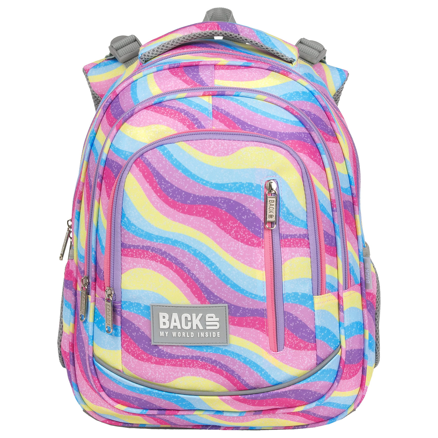 Eksplozja kolorów, która przepływa falami barw błekitu, różu, fioletu i żółci. A wszystko to zwieńczone posypką z brokatu! To plecak dla dziewczynki, która nie boi się wyrażać swego indywidualnego, barwnego stylu. Inspirowany stylem Y2K, pełen energii plecak szkolny idealnie uzupełniają dwukolorowe, różowo-fioletowe zamki. Dzięki rozmiarom dopasowanym do drobnej postury dziecka, to idealny plecak dla pierwszoklasisty.