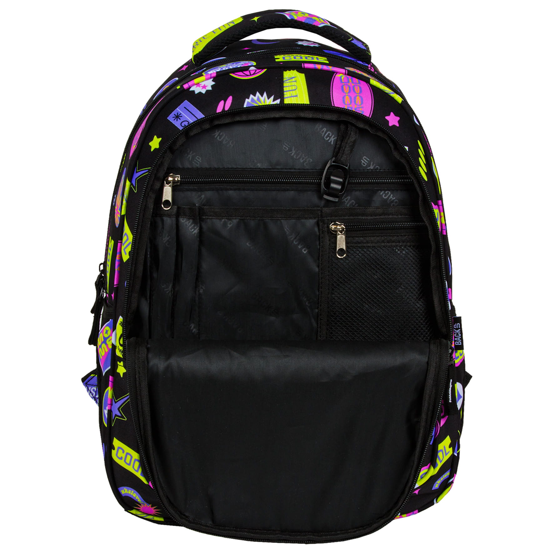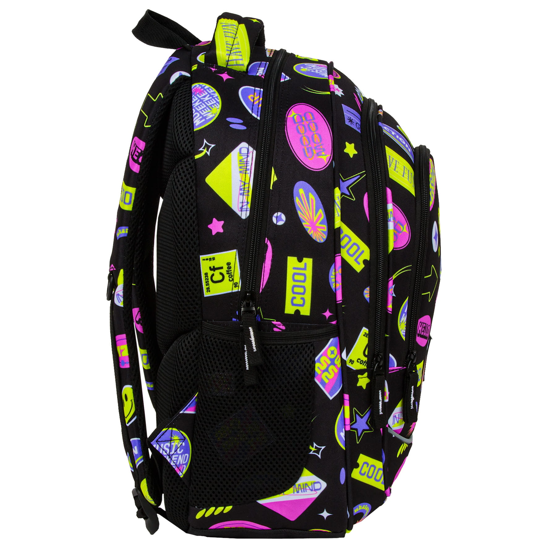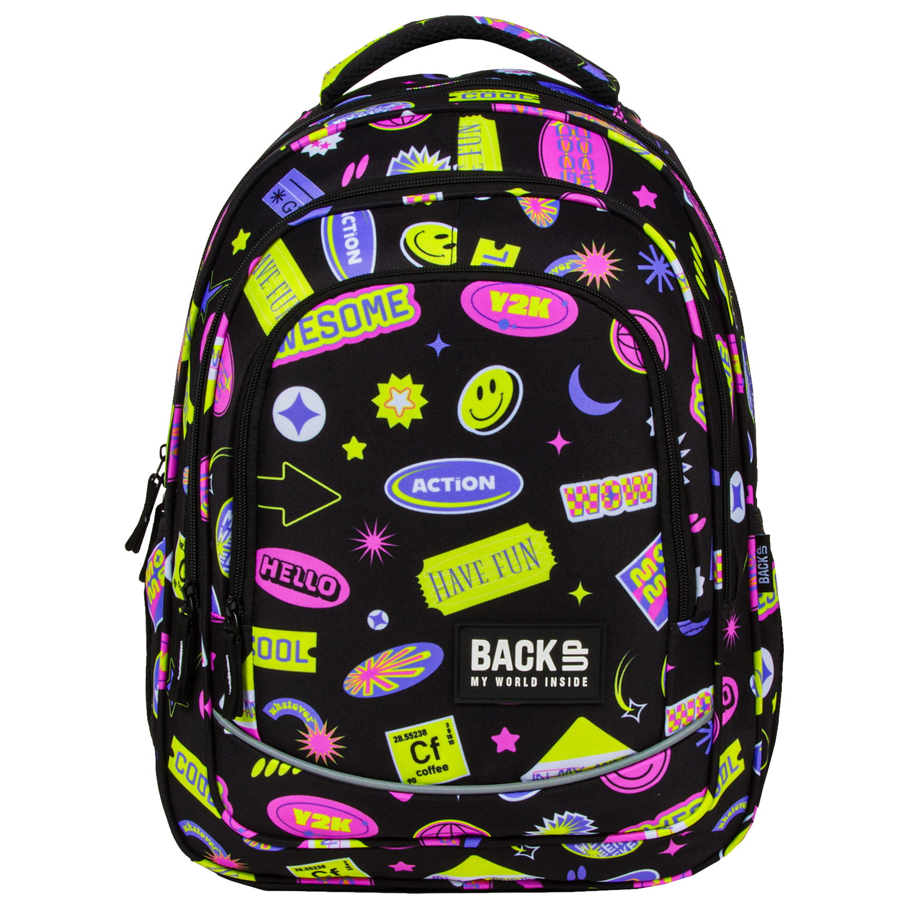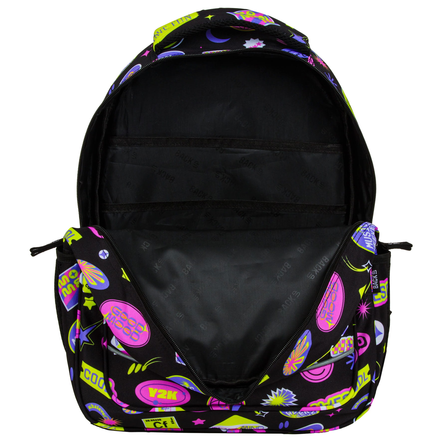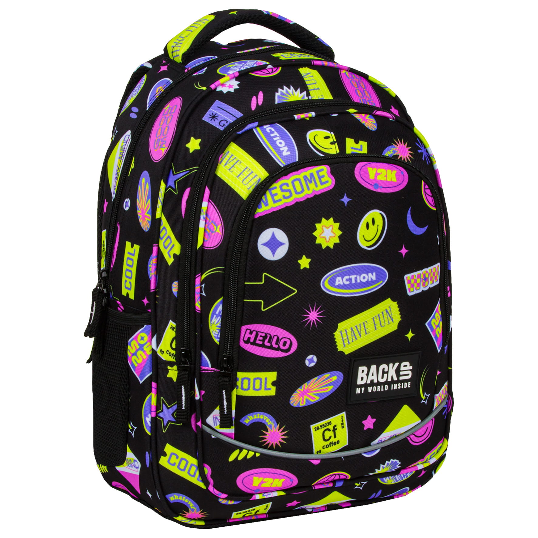 Lata 2000 powracają w wielkim stylu! Kolorowe wlepki, ekspresyjne hasła, uśmiechnięte emotki, krata i gwiazdki - to właśnie esencja przełomu wieku i marzenie każdej nastolatki. Ten plecak szkolny to idealne połączenie najmodnieszych kolorów sezonu: czerni z odcieniami fioletu, różu i żółci. Ten plecak dziecięcy to wspomnienie wczesnych lat 2000 w świeżym, inspirującym stylu.