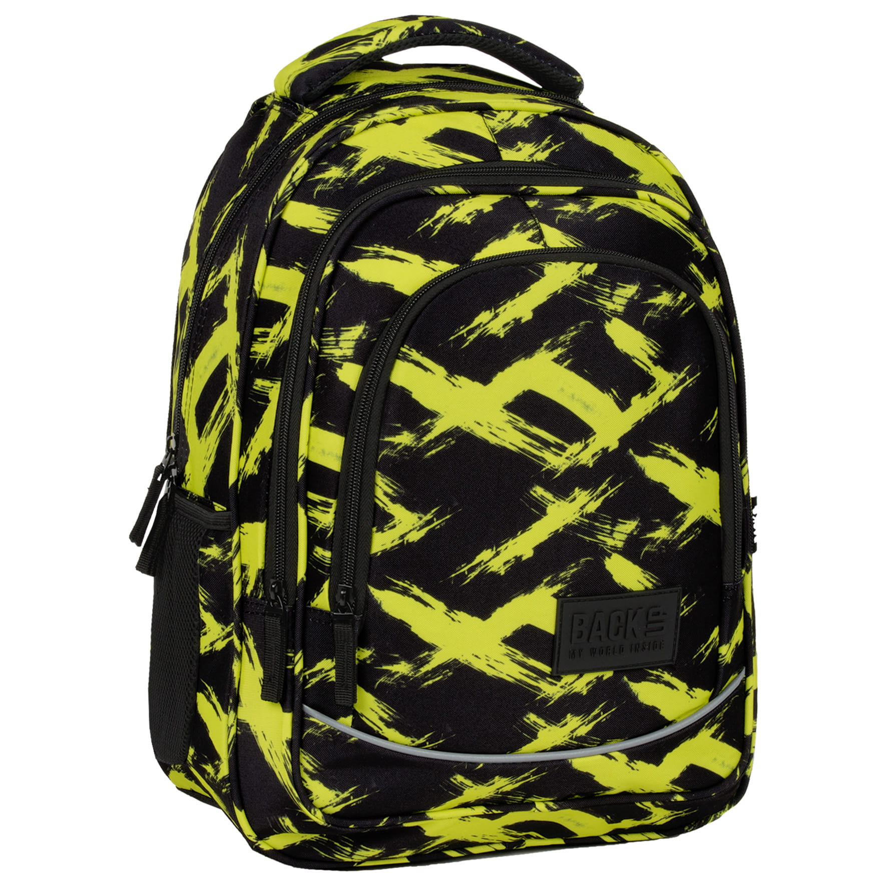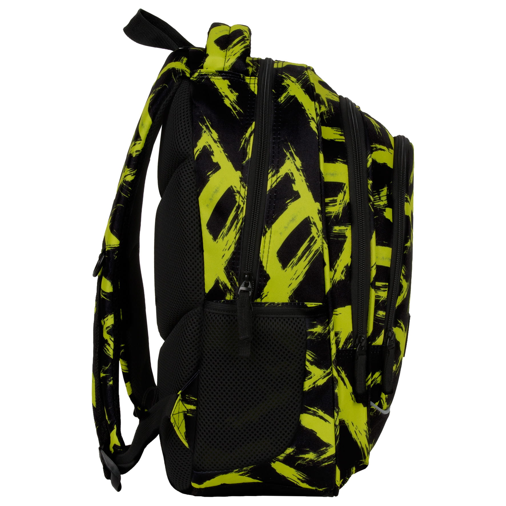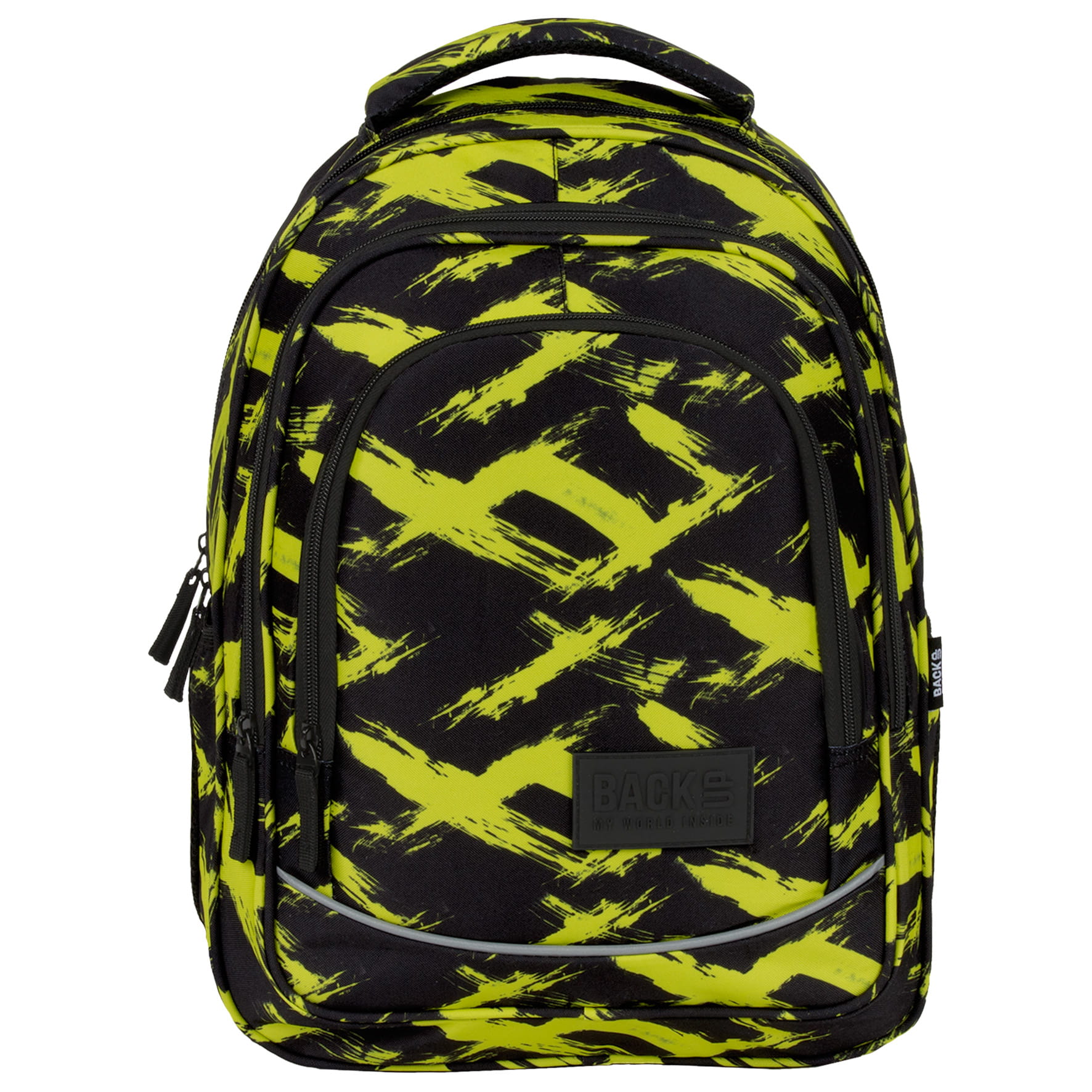 Intensywne neonowe barwy zdobią czarny materiał plecaka, na myśl przywodząc energiczne pociągnięcia pędzla. Artystyczny i asymetryczny rozkład neonowo-zielonych pasm nadaje chłopięcego charakteru. Dynamiczny i wyrazisty plecak młodzieżowy wyróżni się na szkolnym korytarzu i dopełni każdą basicową stylizację odrobiną mocnych barw.