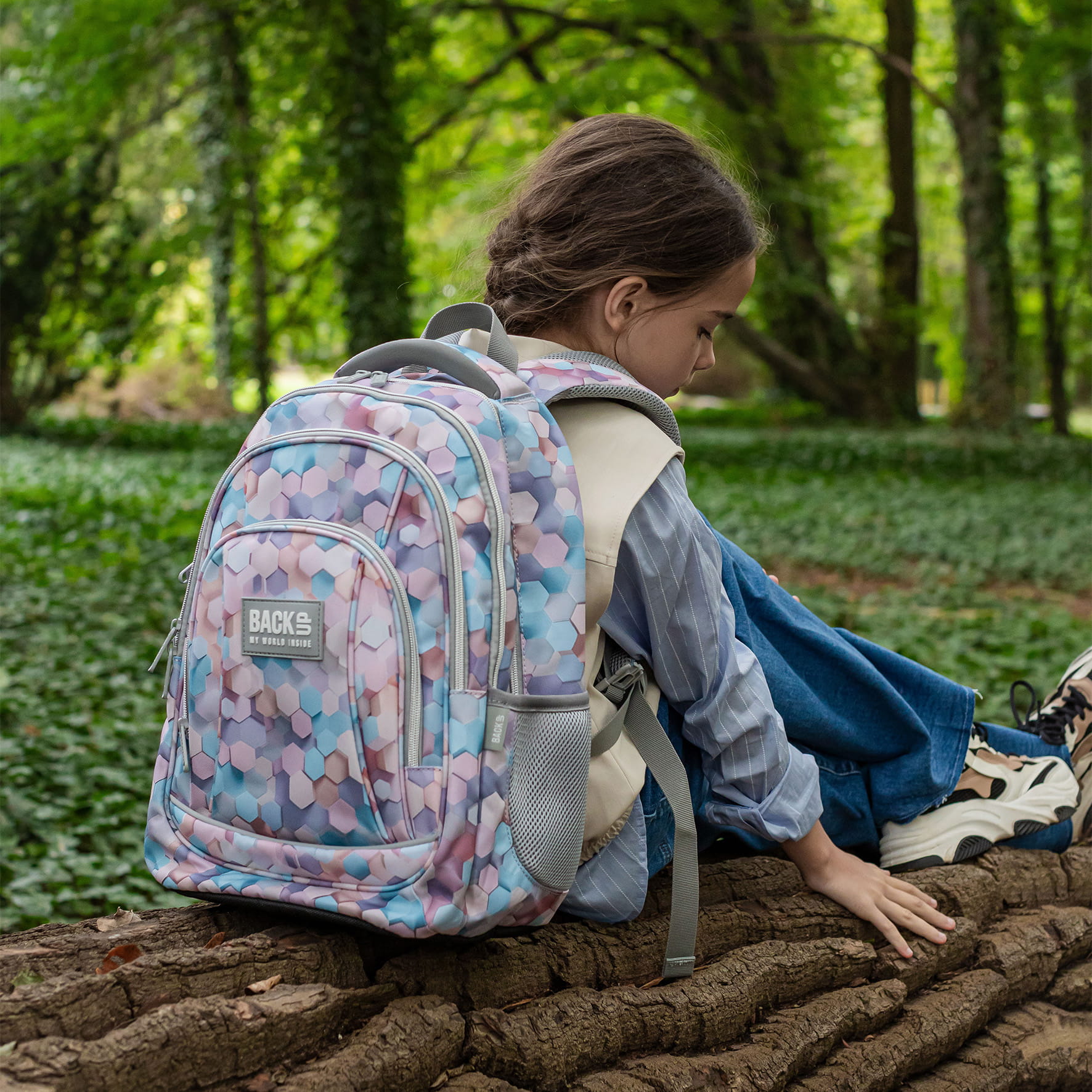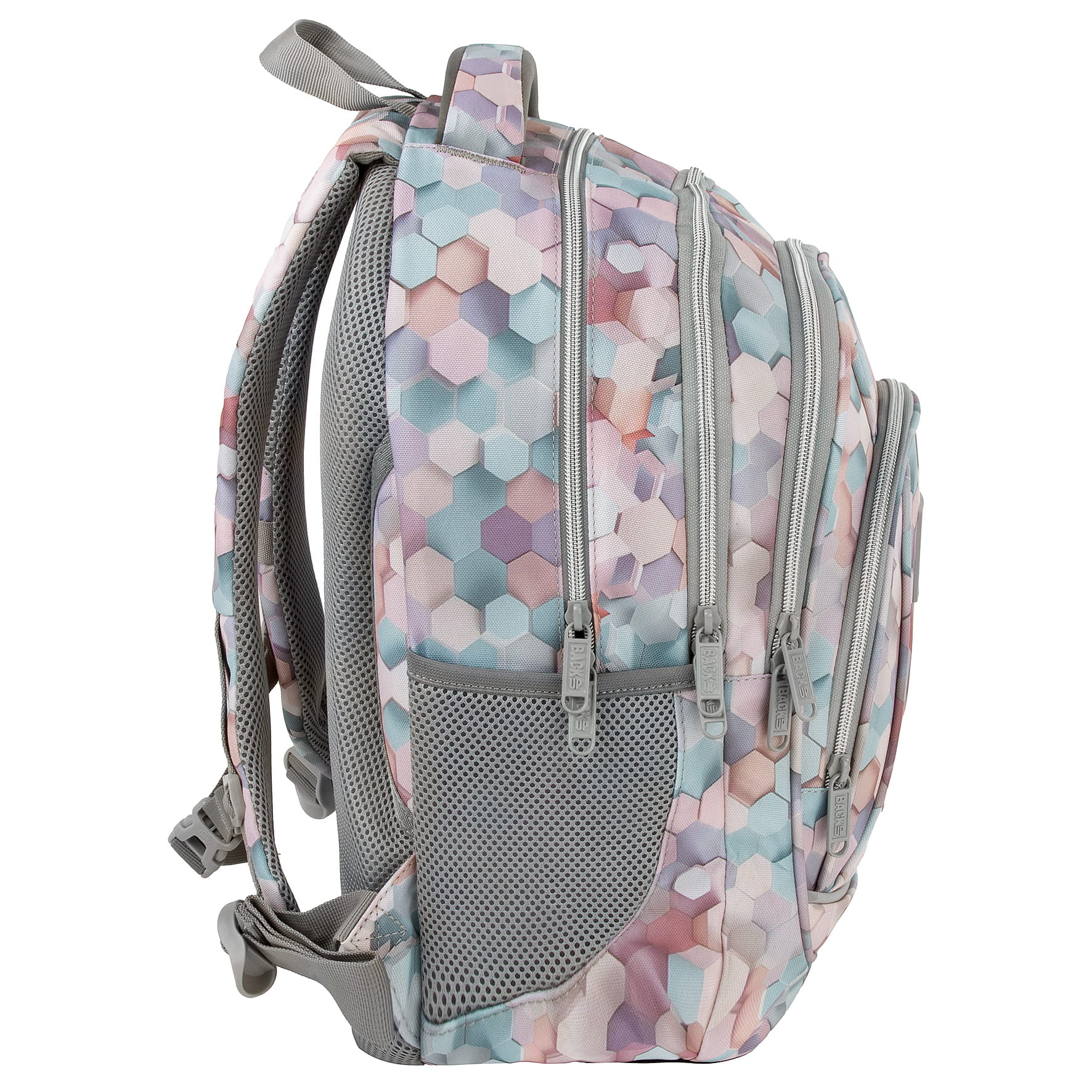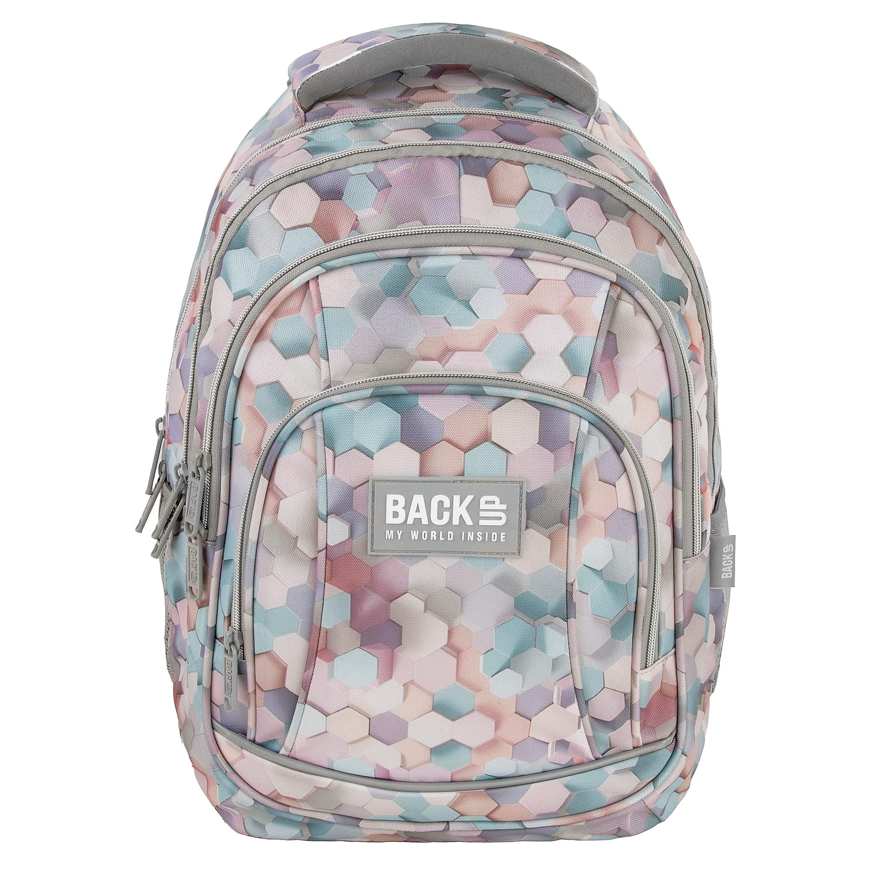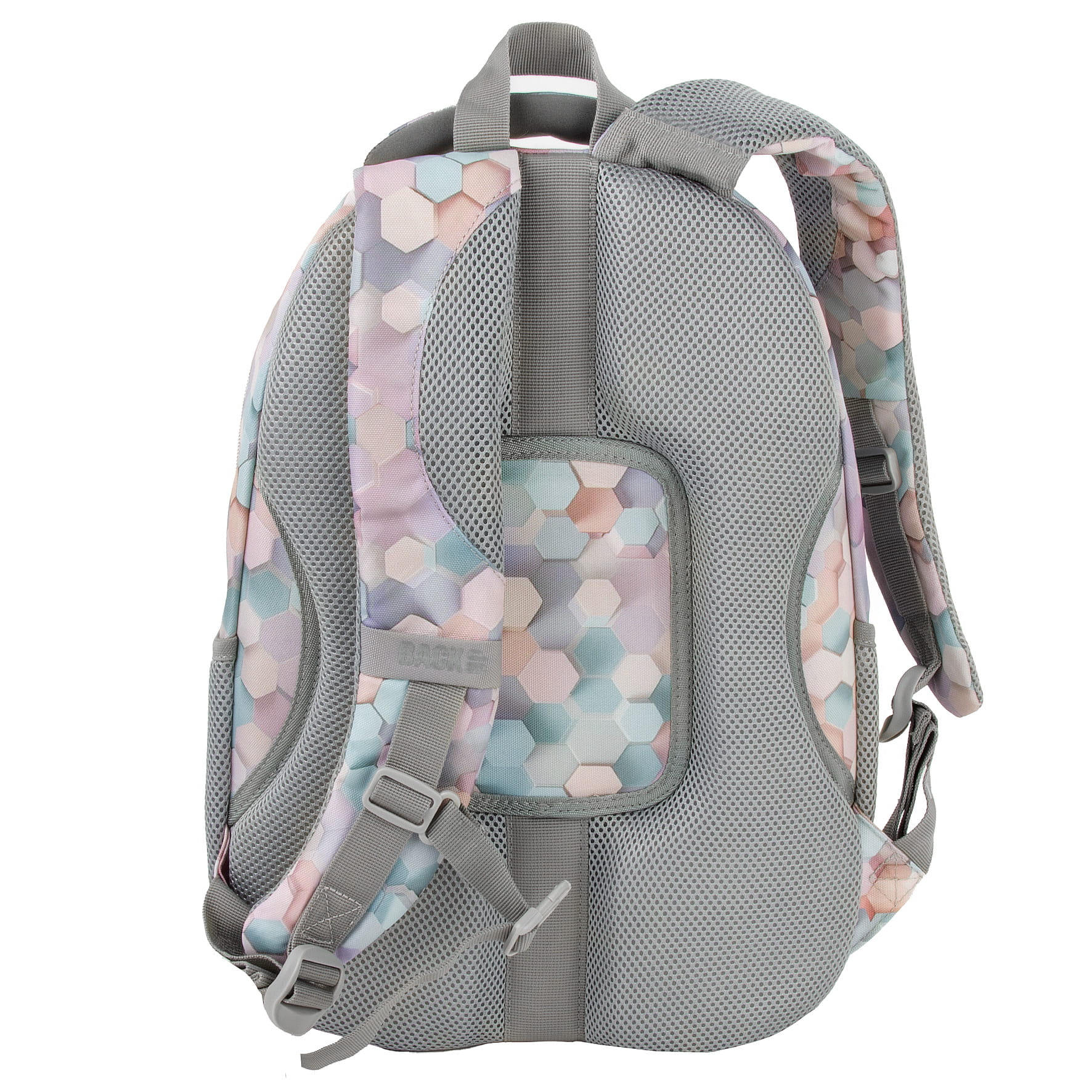 Wzór stworzony przy użyciu AI, dzięki czemu jest absolutnie niepowtarzalny i unikatowy. Zachwyca motywem sześciokątów, które tańczą niczym kolorowe plastry miodu. Tworzą one piękny efekt fal 3D, odbijając i zatapiając się w harmonijnych kompozycjach. Plecak utrzymany jest w naturalnych odcieniach błękitu, z dodatkiem brązu, delikatnego różu i beżu. Motyw sześciokątów doskonale współgra ze światłem, które subtelnie je podkreśla, nadając całości wyjątkowy charakter.