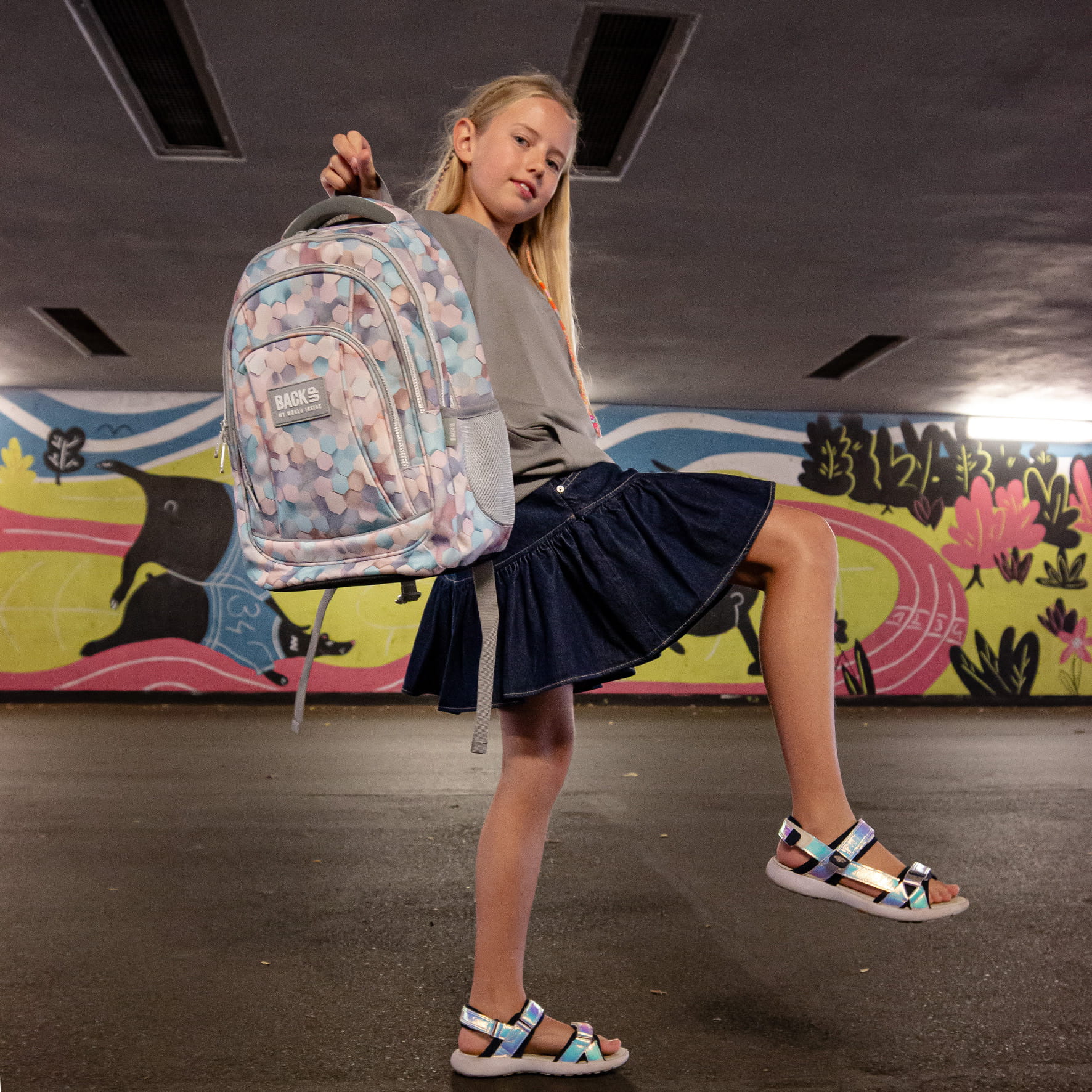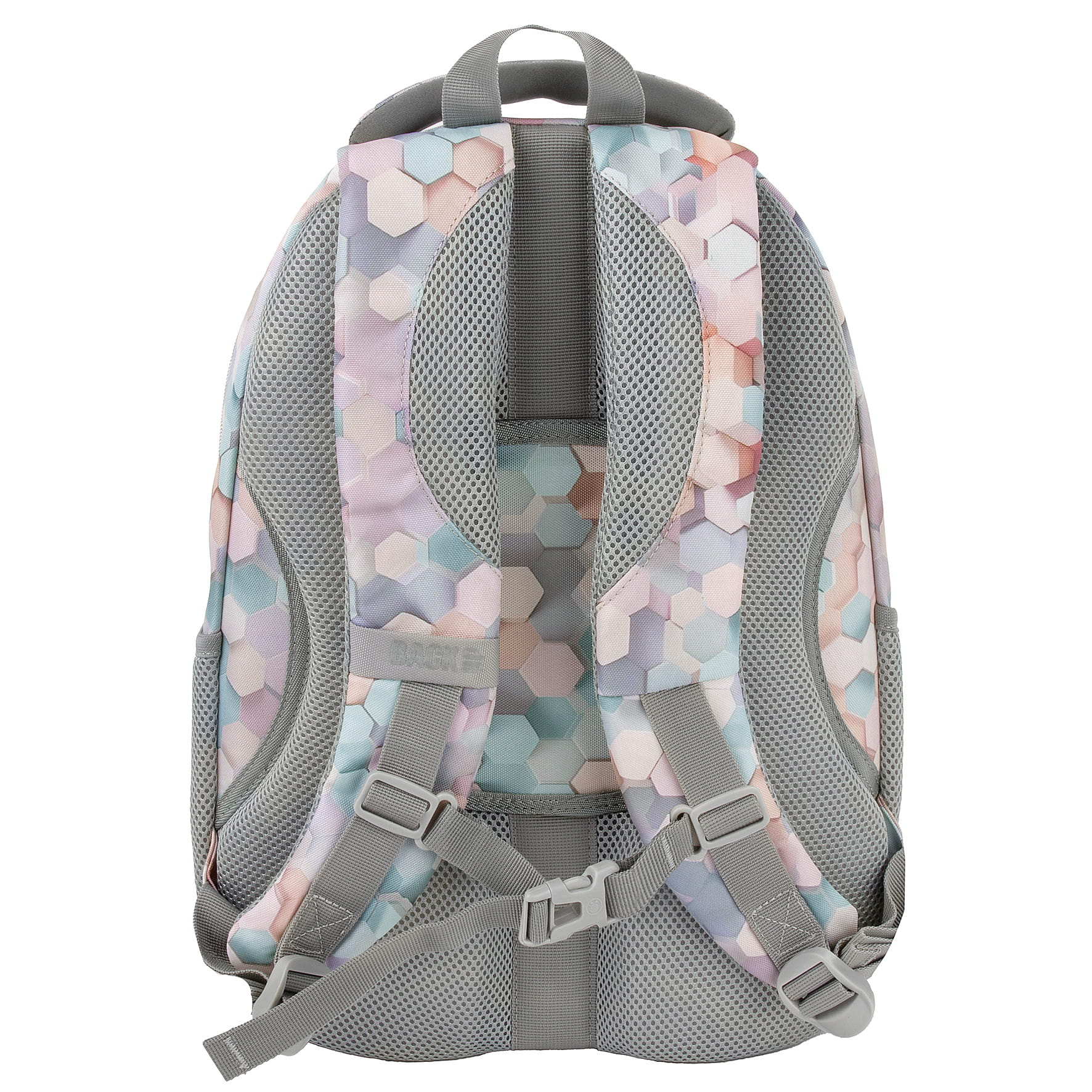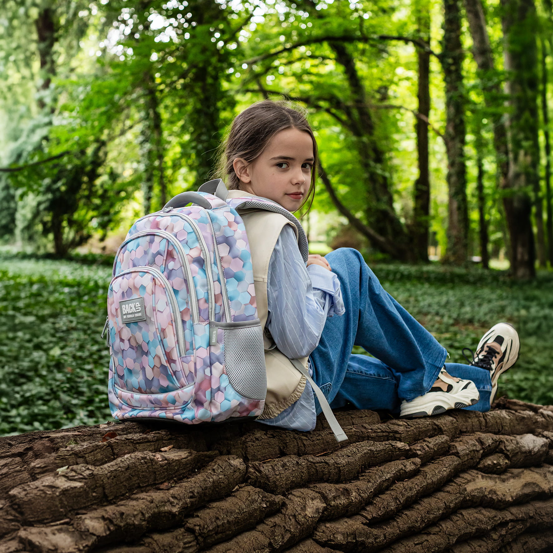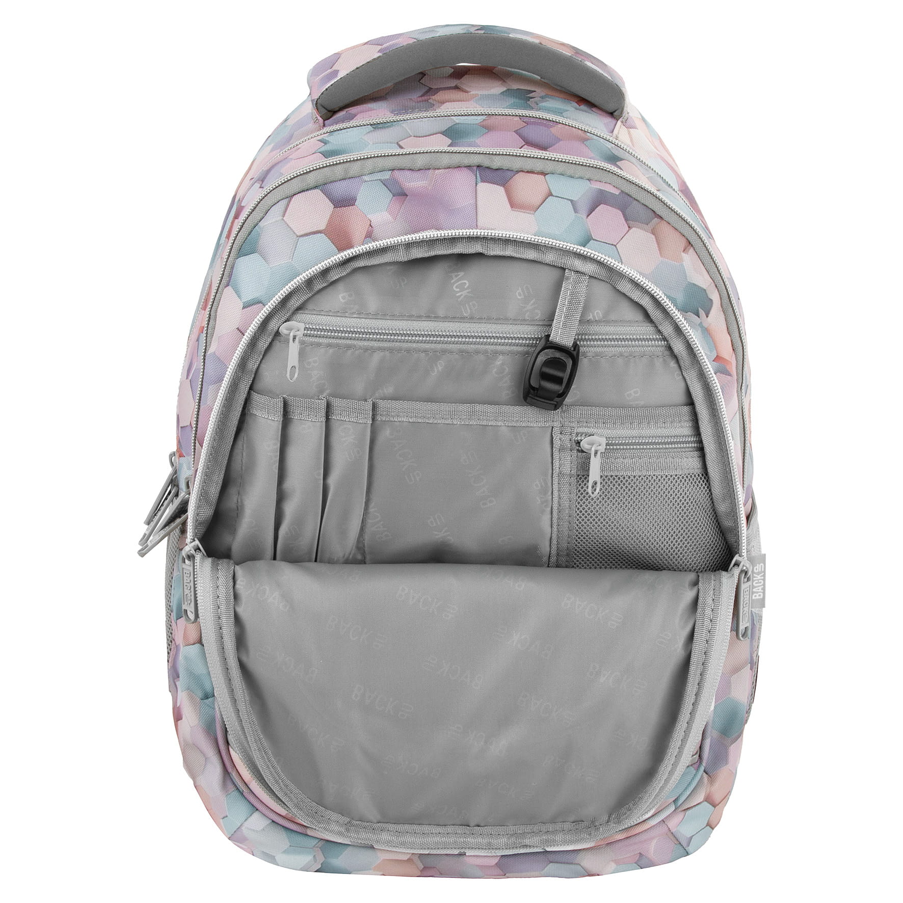 Wzór stworzony przy użyciu AI, dzięki czemu jest absolutnie niepowtarzalny i unikatowy. Zachwyca motywem sześciokątów, które tańczą niczym kolorowe plastry miodu. Tworzą one piękny efekt fal 3D, odbijając i zatapiając się w harmonijnych kompozycjach. Plecak utrzymany jest w naturalnych odcieniach błękitu, z dodatkiem brązu, delikatnego różu i beżu. Motyw sześciokątów doskonale współgra ze światłem, które subtelnie je podkreśla, nadając całości wyjątkowy charakter.
