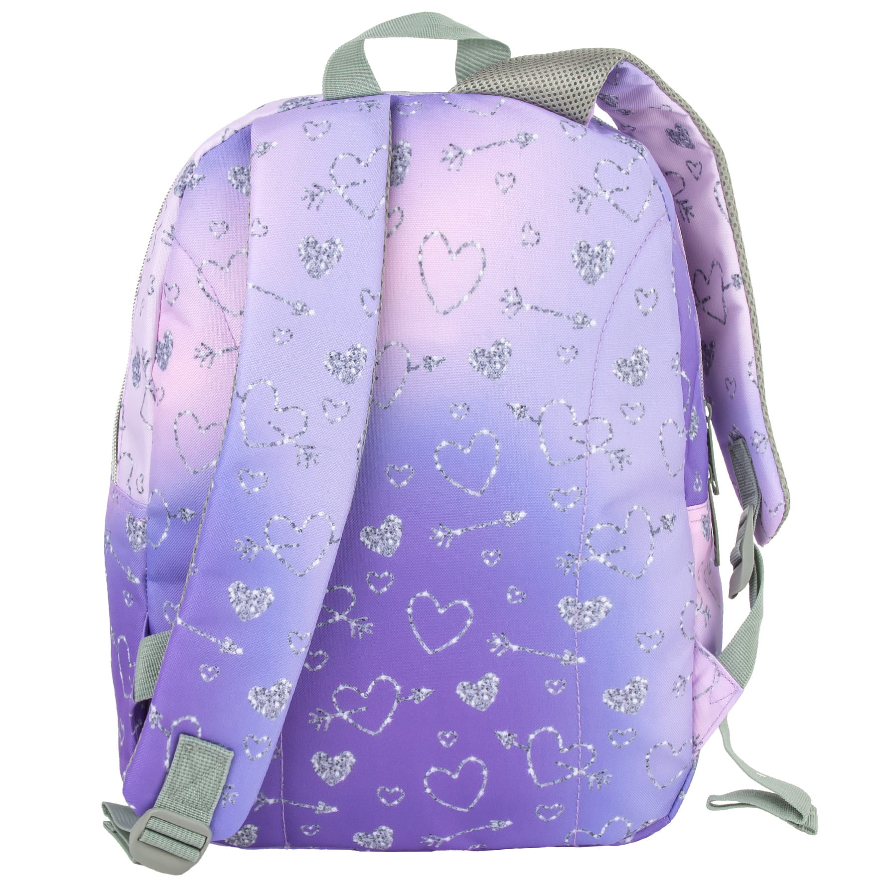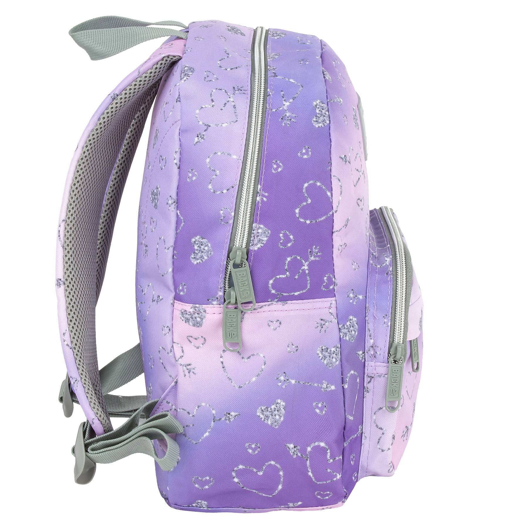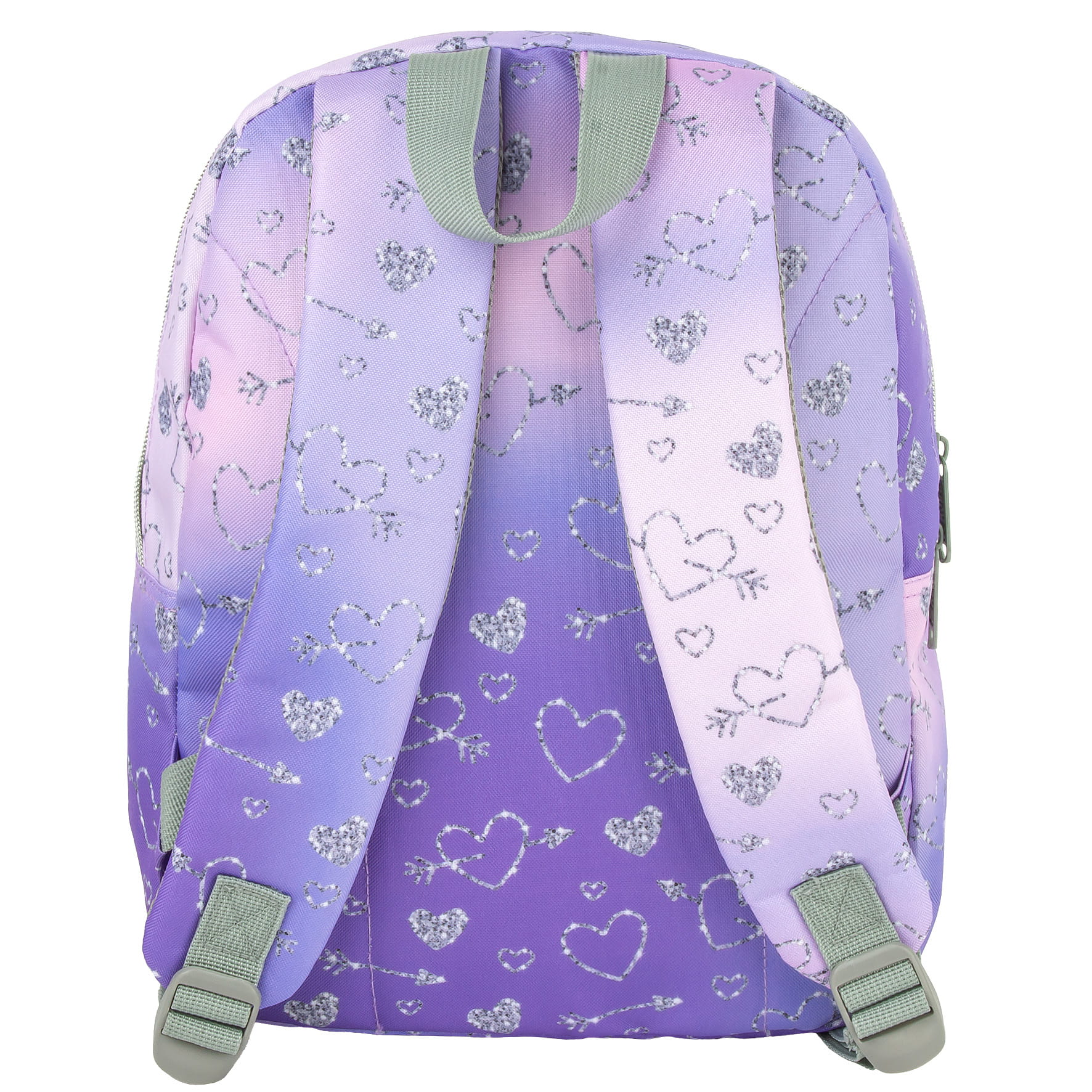 Delikatne fioletowe i różowe odcienie, które płynnie przechodzą jeden w drugi, tworząc efektowny gradient kolorów. Na tle tych pięknych barw migoczą srebrne, świecące serduszka. To połączenie nowoczesnego designu, romantyzmu i energii. Całość uzupełniają szare akcenty. Dzięki rozmiarom dopasowanym do drobnej postury dziecka, to idealny pierwszy plecak do przedszkola i zerówki. Sprawdzi się świetnie jako plecak turystyczny.