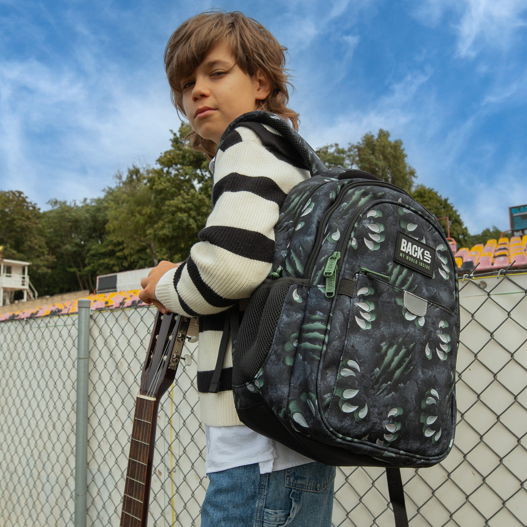 REX - wypuść bestię! Wyróżnij się z tłumu niepowtarzalnym wzorem inspirowanym śladami pazurów miejskiego drapieżnika. Agresywne rozdarcia, ultra dynamiczny design i kontrastowe kolory - czarna noc przełamana energetyczną zielenią. Dzięki rozmiarom dopasowanym do drobnej postury dziecka, to idealny plecak dla pierwszoklasisty.