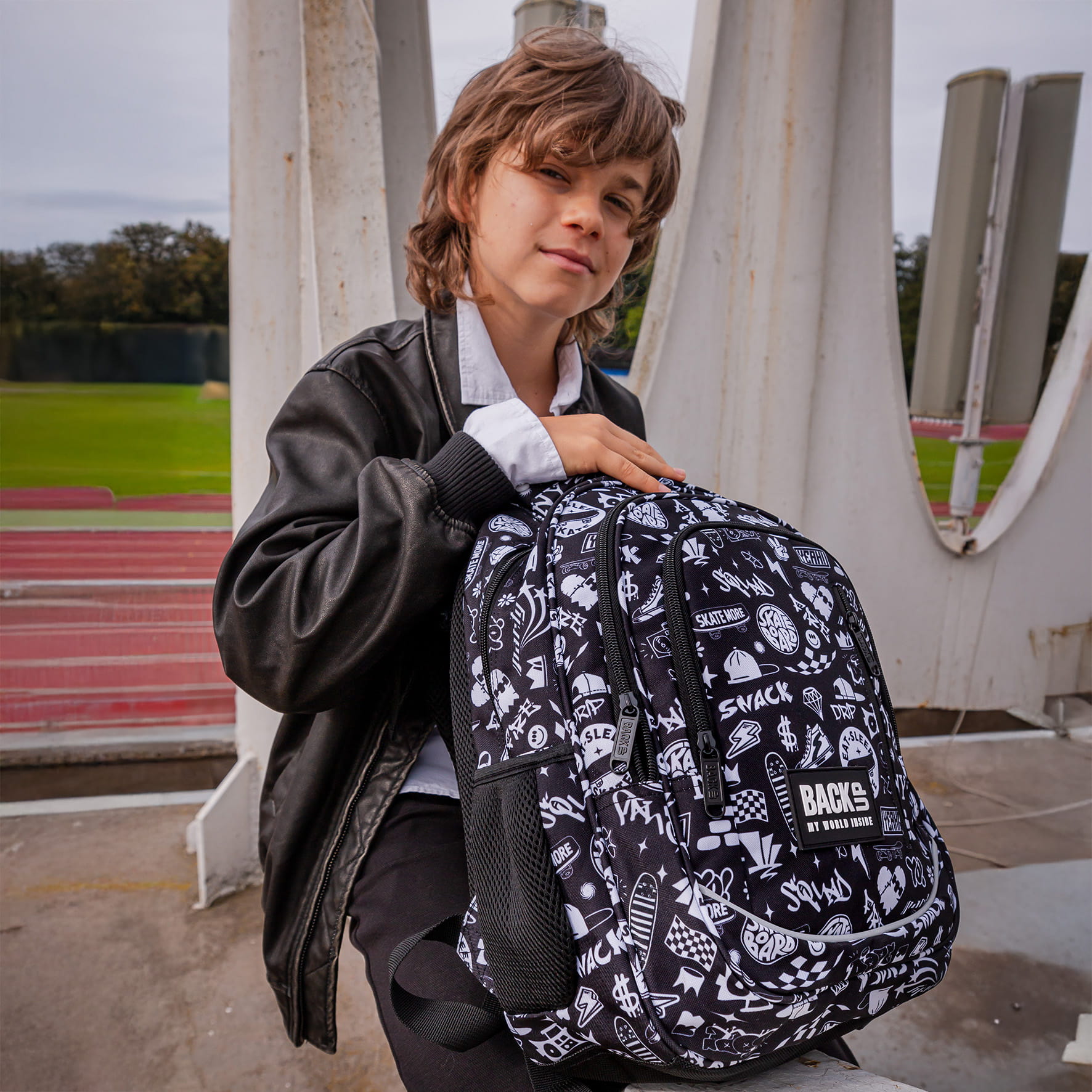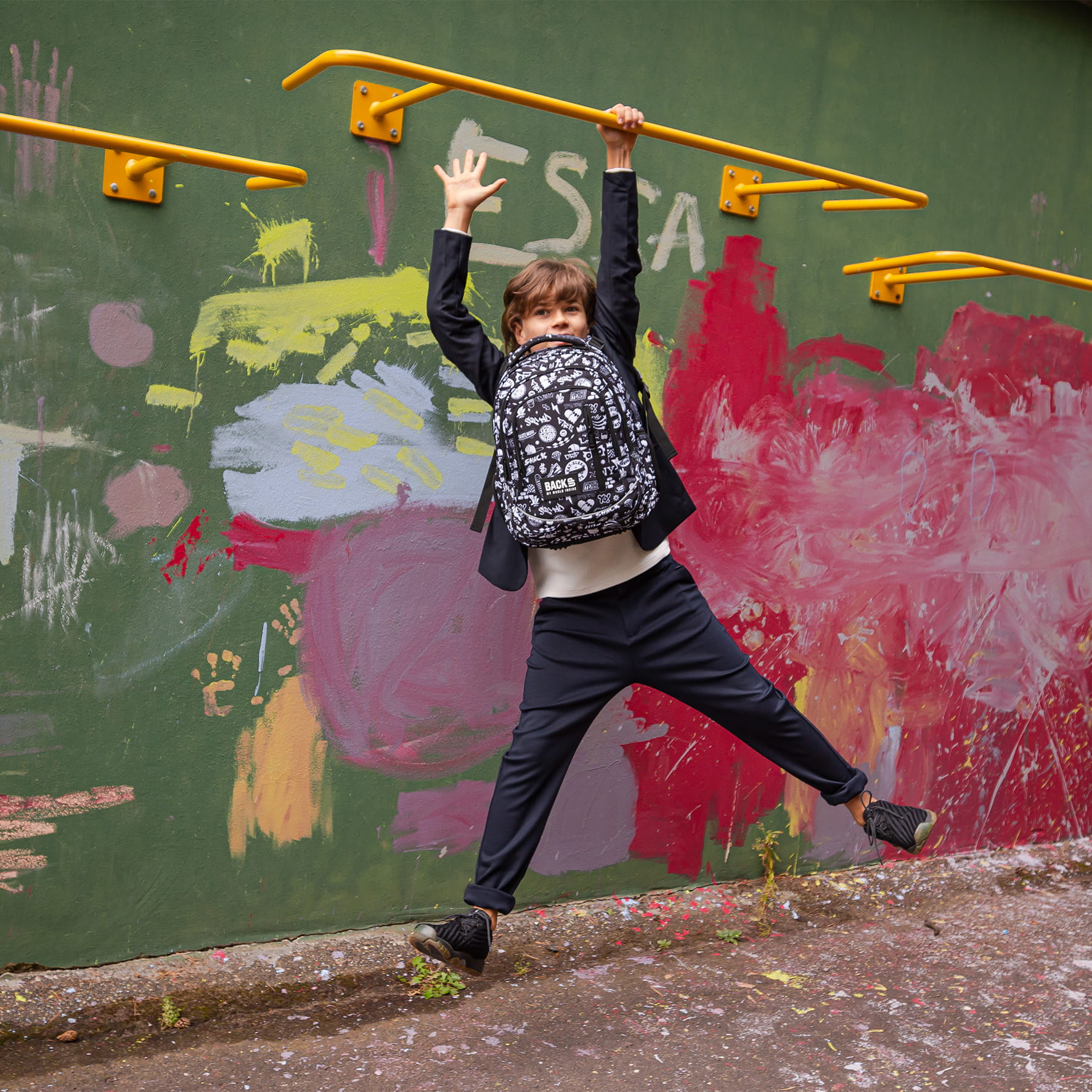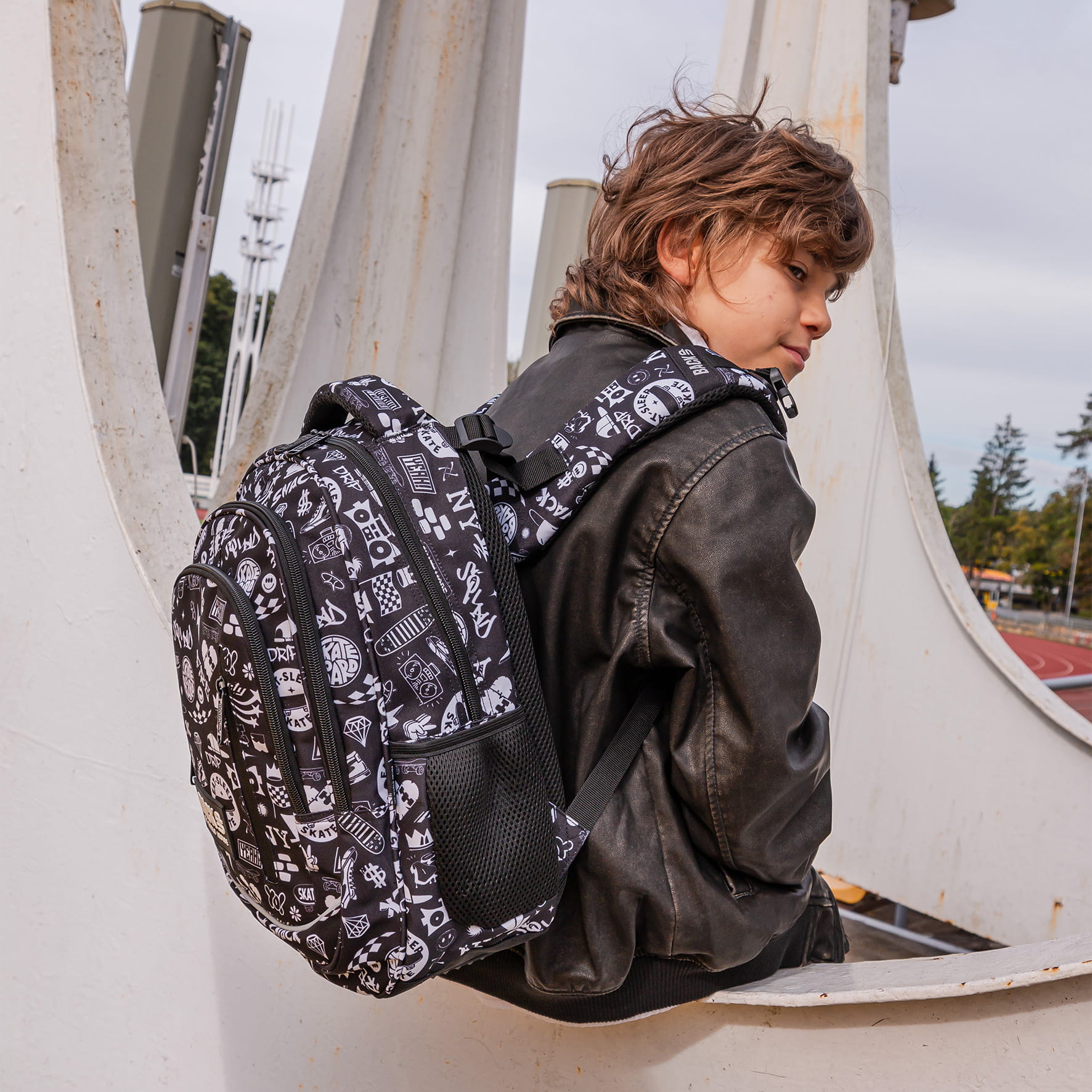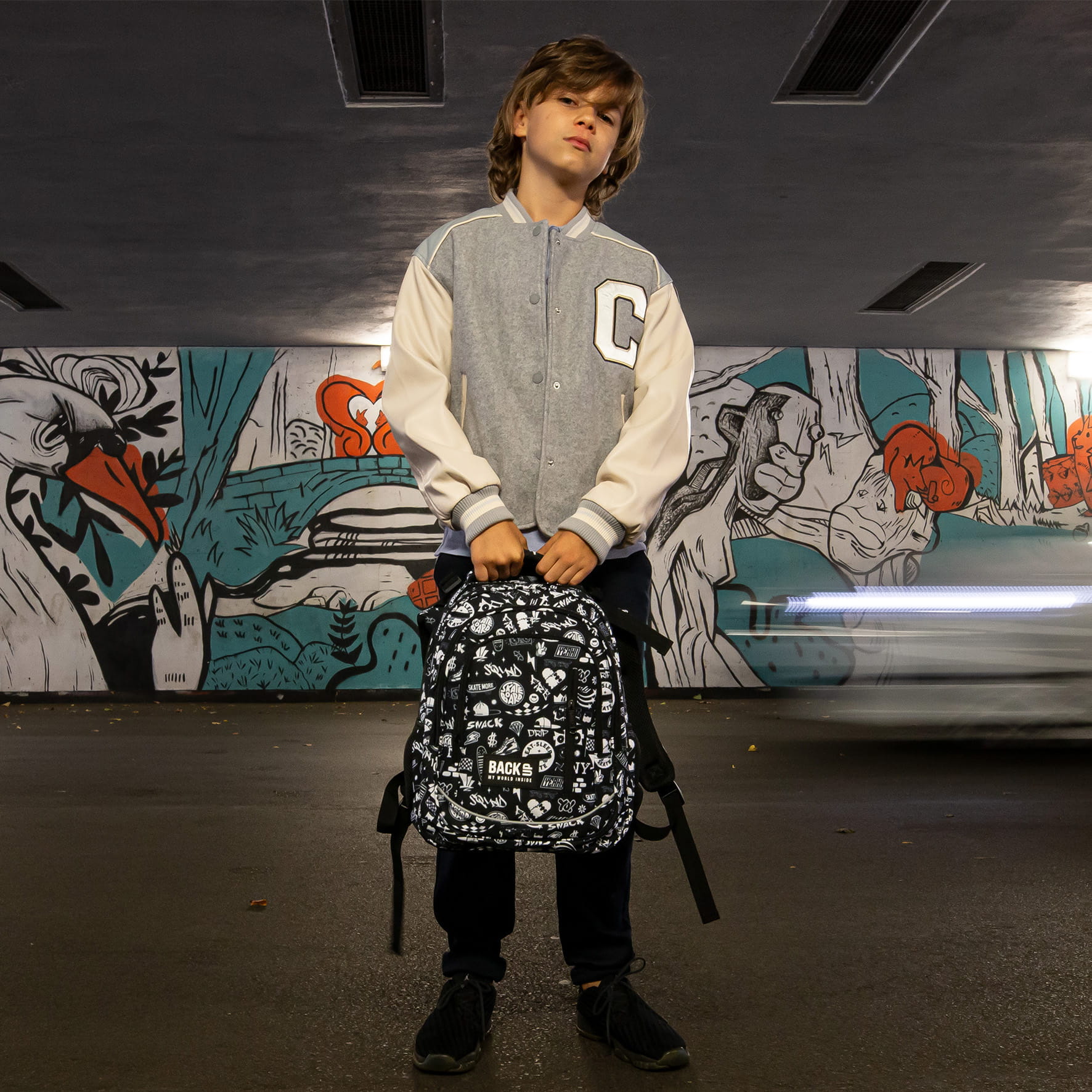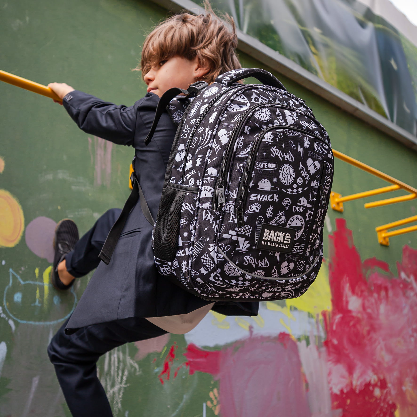 Zaprojektowany w nowoczesnym, miejskim charakterze. Z pewnością spodoba się młodym osobom ceniącym streetwearową estetykę. Mocny kontrast między tłem a grafikami sprawia, że wzór jest wyrazisty i przyciągający wzrok, jednocześnie pozostając uniwersalnym. Dzięki rozmiarom dopasowanym do drobnej postury dziecka, to idealny plecak dla pierwszoklasisty. Regulacja wysokości szelek – „grow with me” – zapewnia możliwość dostosowania plecaka do rosnącego ciała dziecka, co sprawia, że będzie służył przez długi czas.