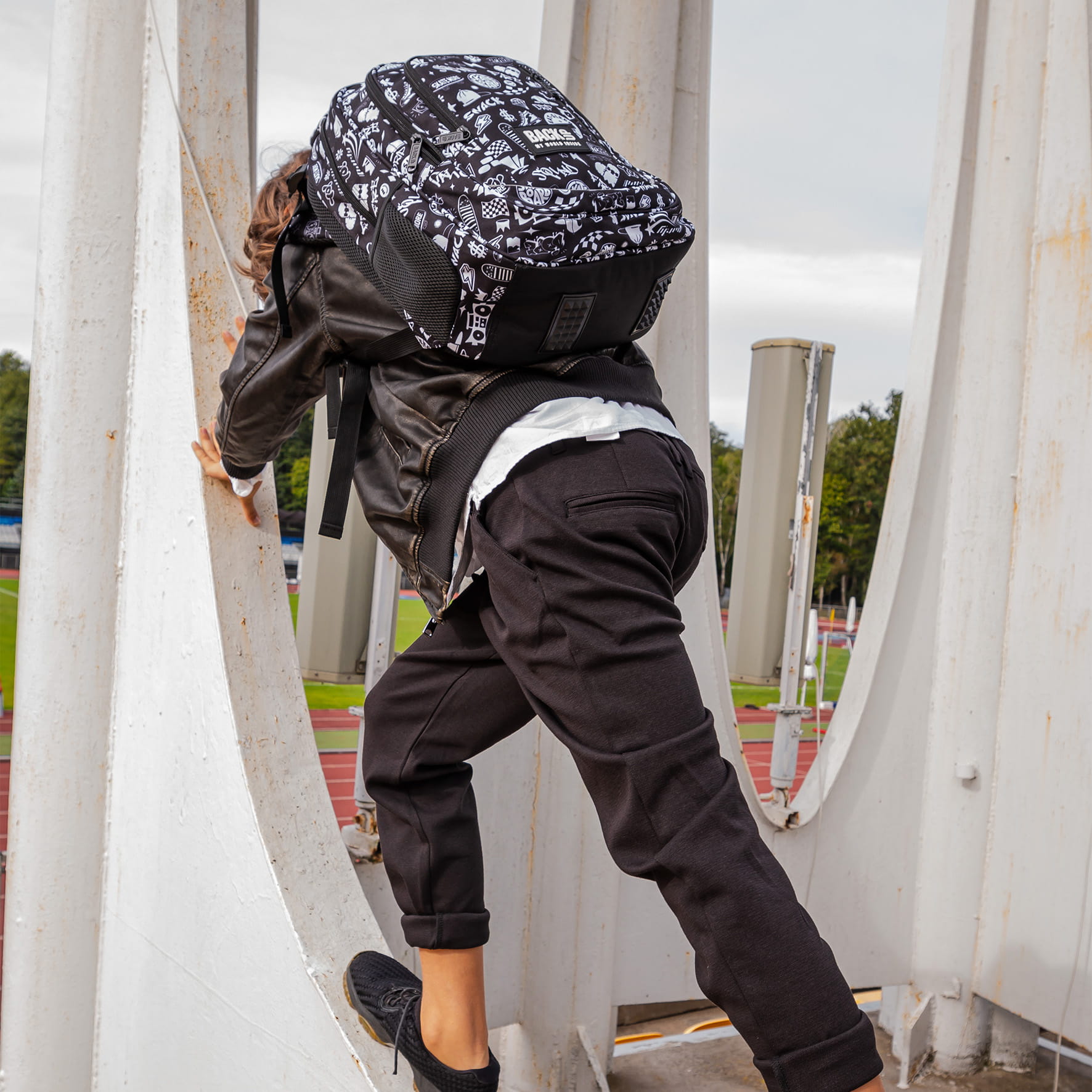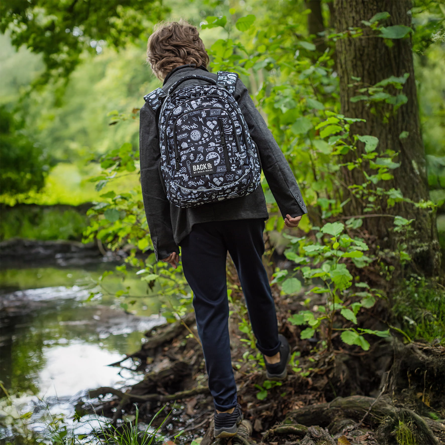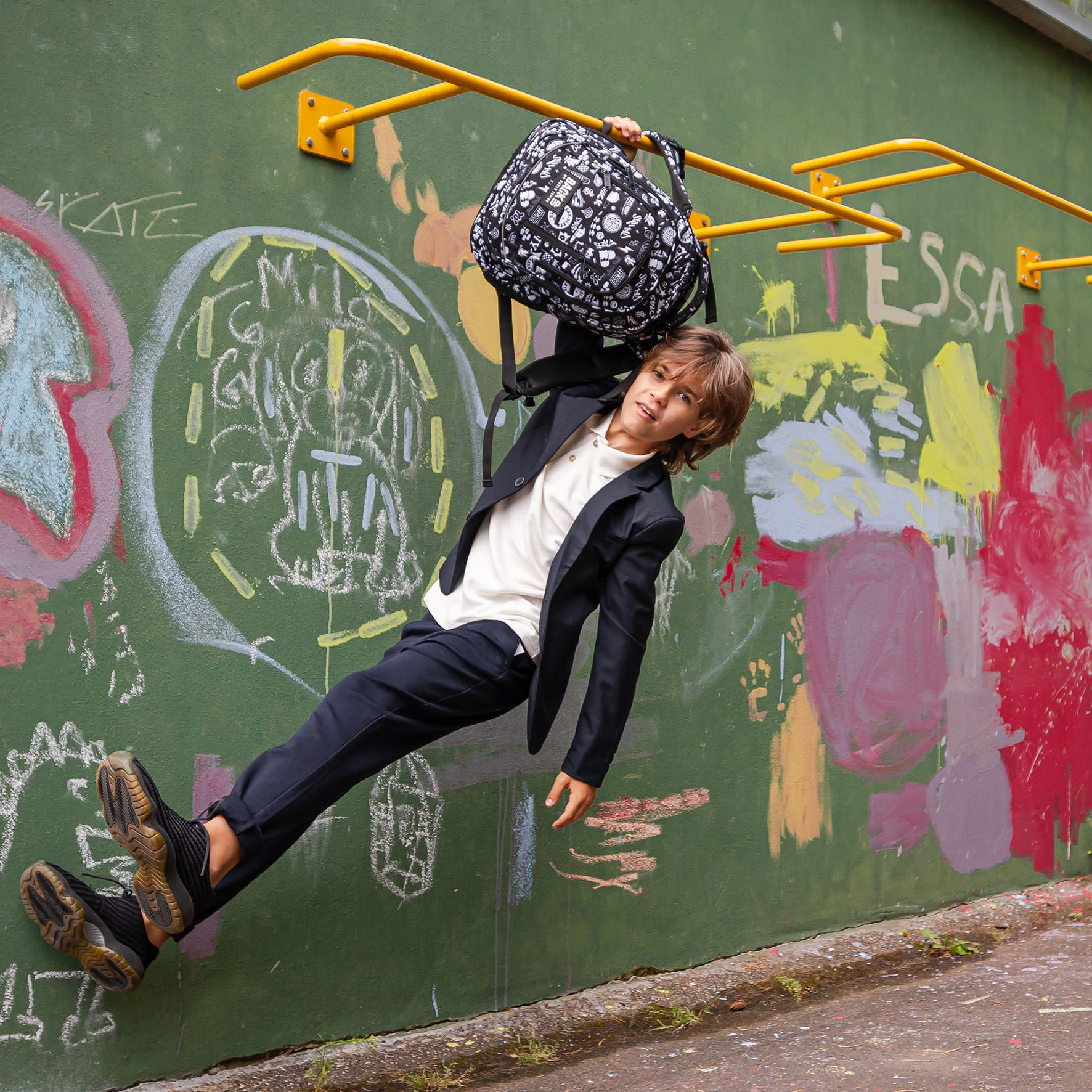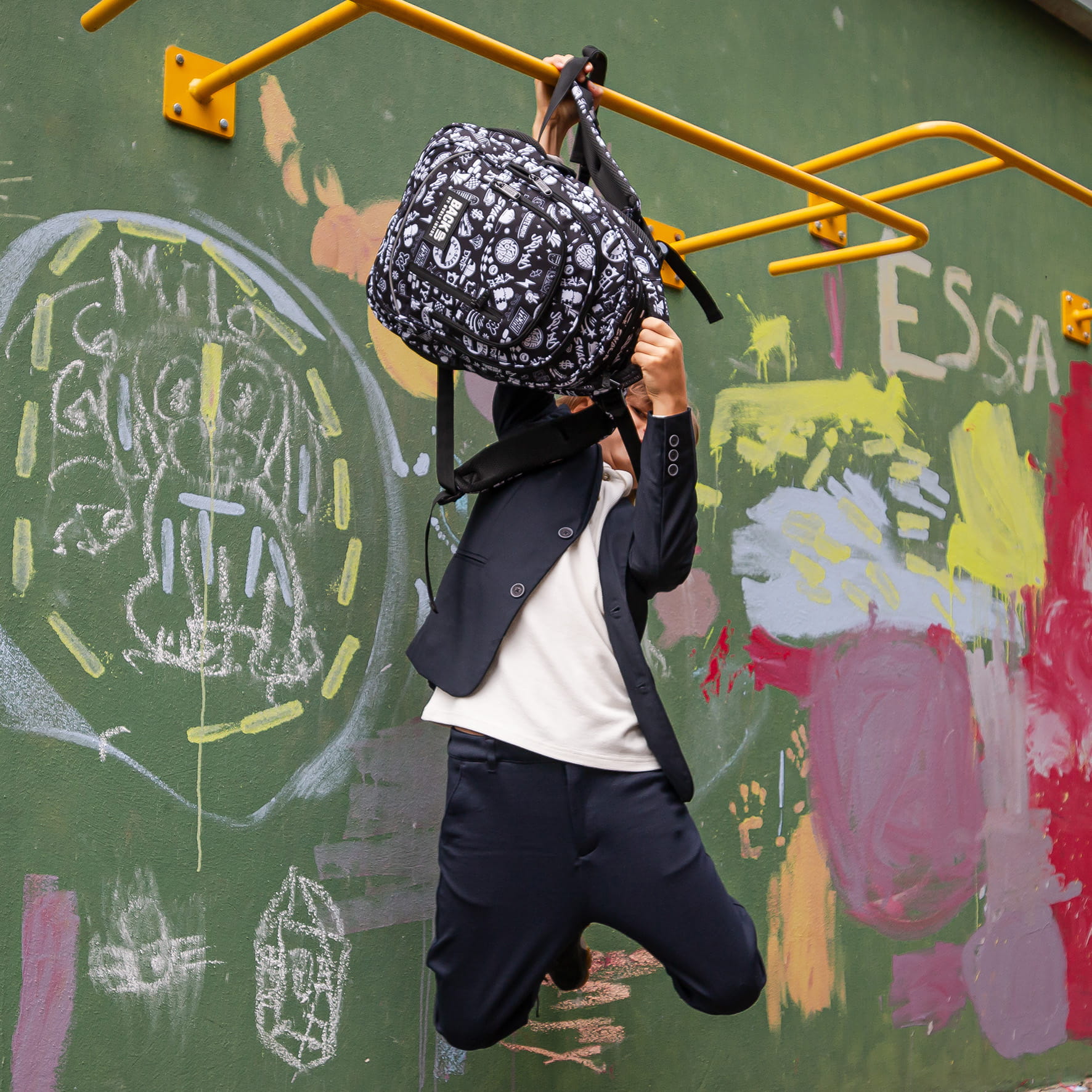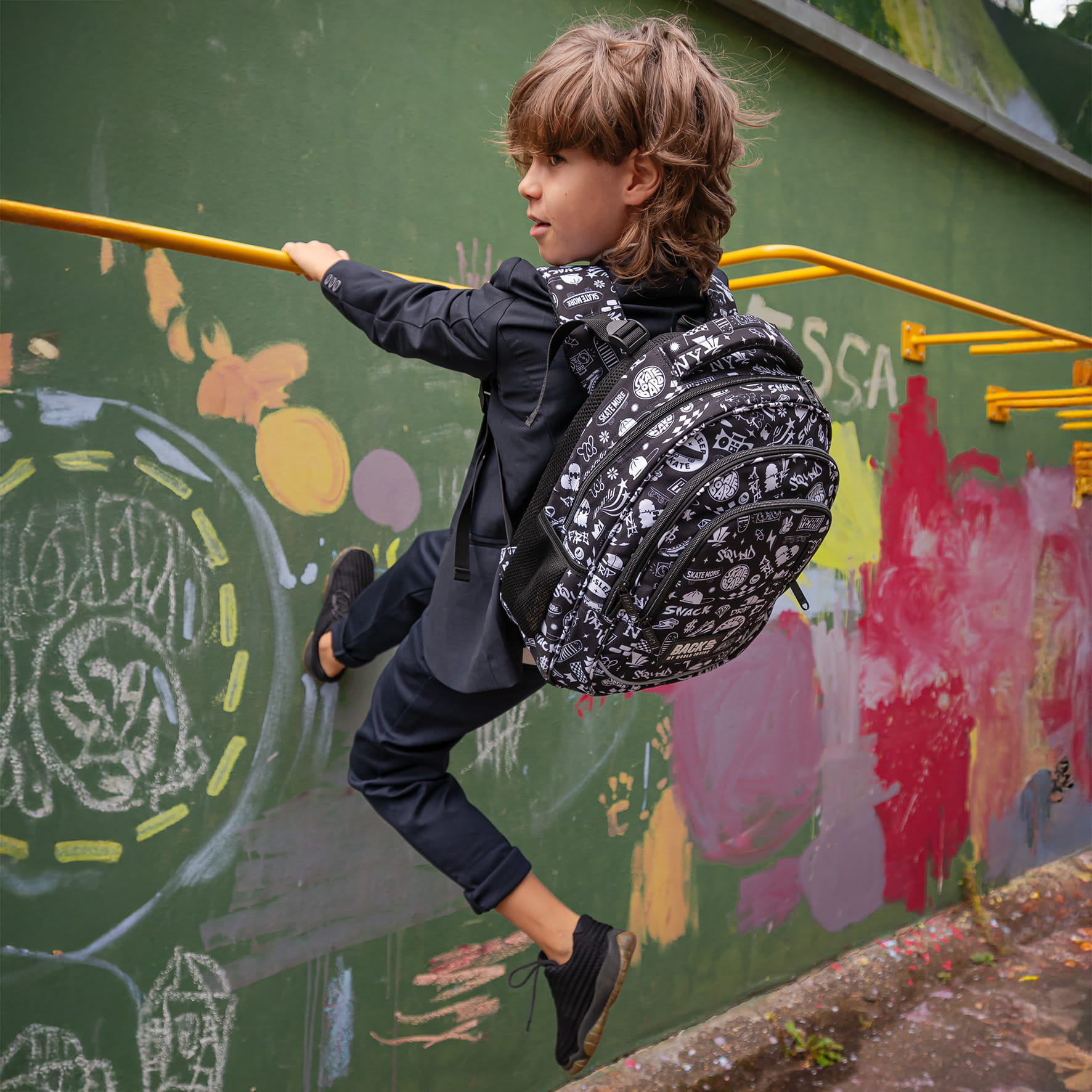 Zaprojektowany w nowoczesnym, miejskim charakterze. Z pewnością spodoba się młodym osobom ceniącym streetwearową estetykę. Mocny kontrast między tłem a grafikami sprawia, że wzór jest wyrazisty i przyciągający wzrok, jednocześnie pozostając uniwersalnym. Dzięki rozmiarom dopasowanym do drobnej postury dziecka, to idealny plecak dla pierwszoklasisty. Regulacja wysokości szelek – „grow with me” – zapewnia możliwość dostosowania plecaka do rosnącego ciała dziecka, co sprawia, że będzie służył przez długi czas.