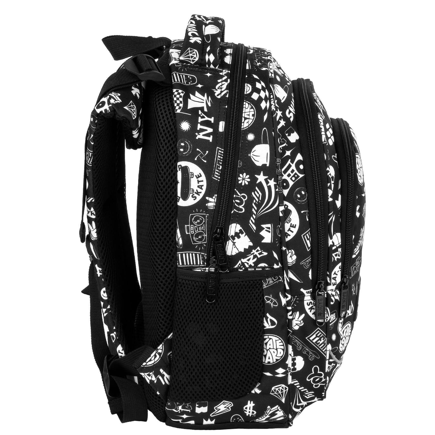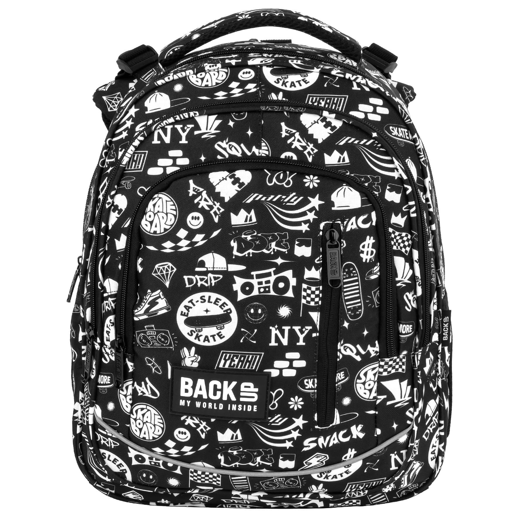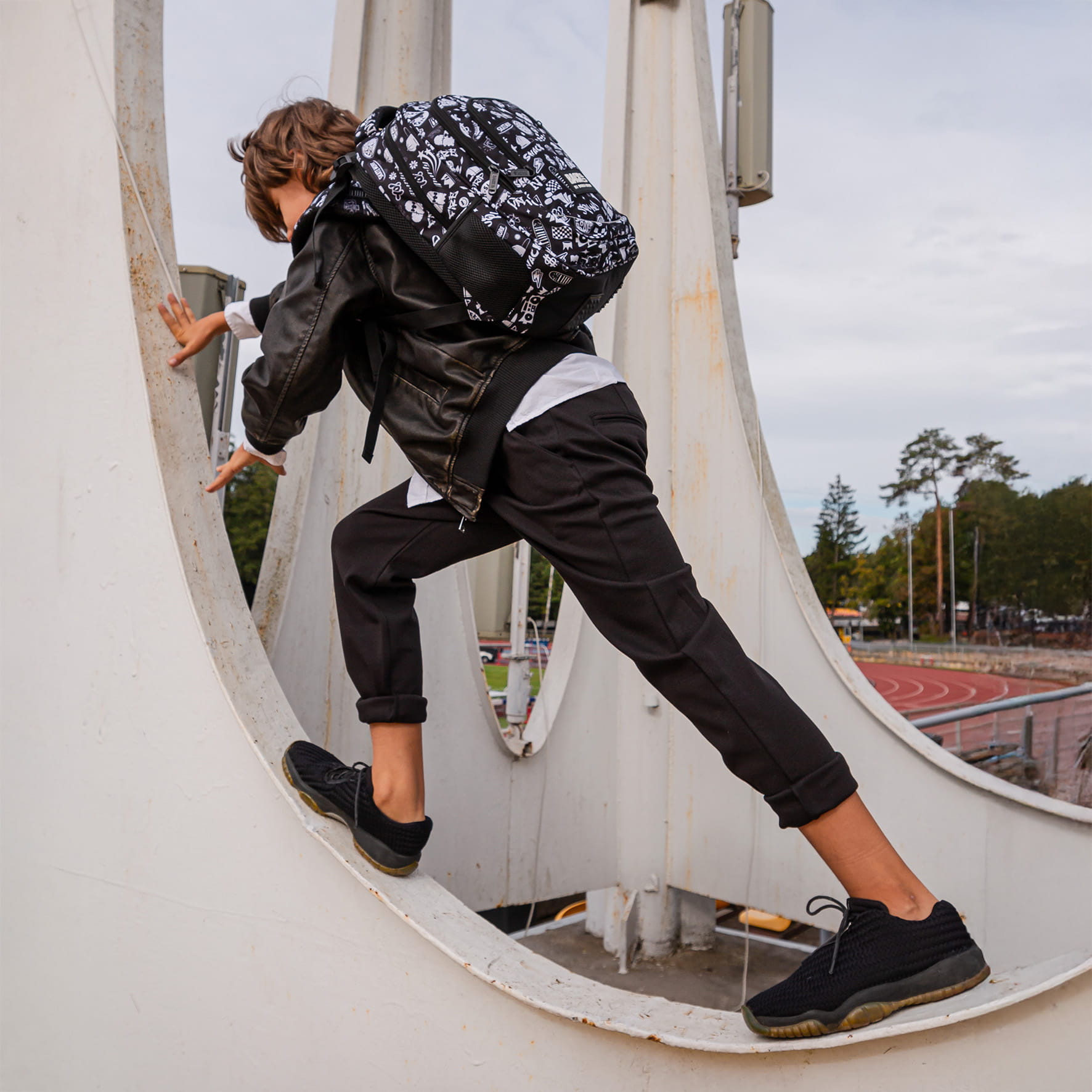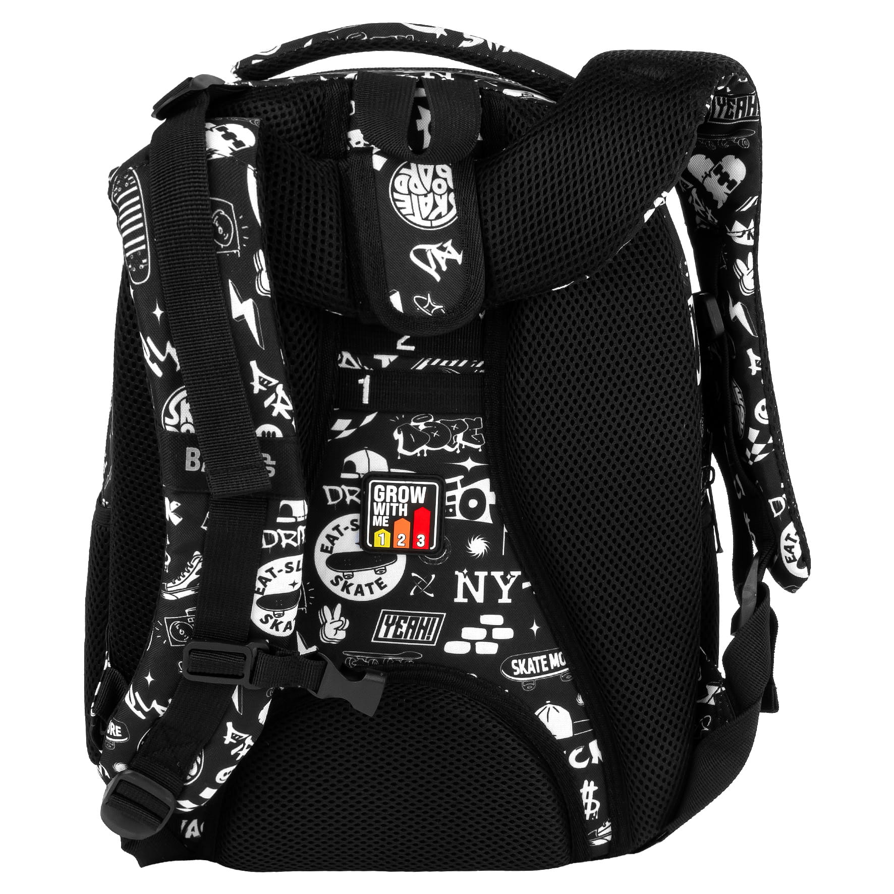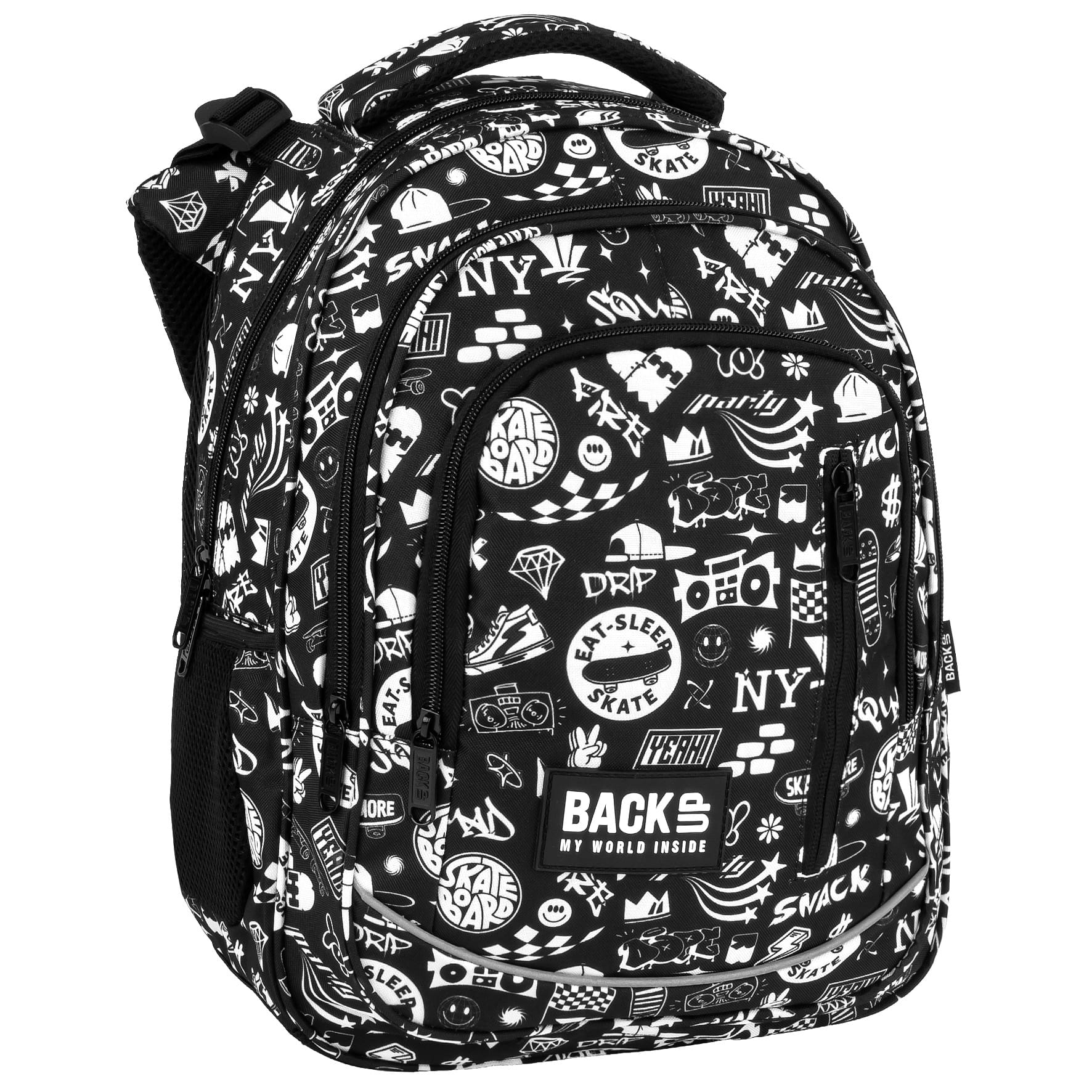 Zaprojektowany w nowoczesnym, miejskim charakterze. Z pewnością spodoba się młodym osobom ceniącym streetwearową estetykę. Mocny kontrast między tłem a grafikami sprawia, że wzór jest wyrazisty i przyciągający wzrok, jednocześnie pozostając uniwersalnym. Dzięki rozmiarom dopasowanym do drobnej postury dziecka, to idealny plecak dla pierwszoklasisty. Regulacja wysokości szelek – „grow with me” – zapewnia możliwość dostosowania plecaka do rosnącego ciała dziecka, co sprawia, że będzie służył przez długi czas.