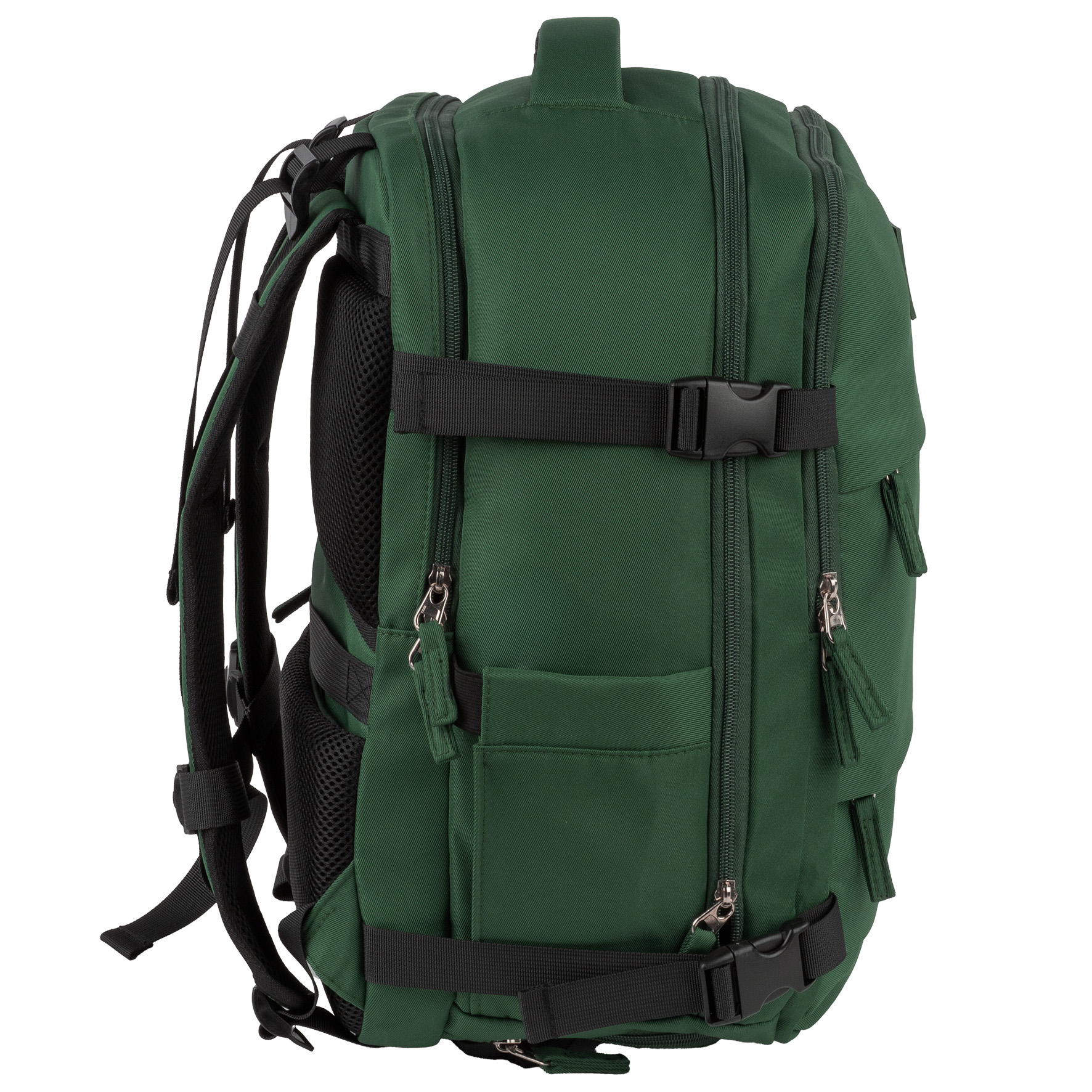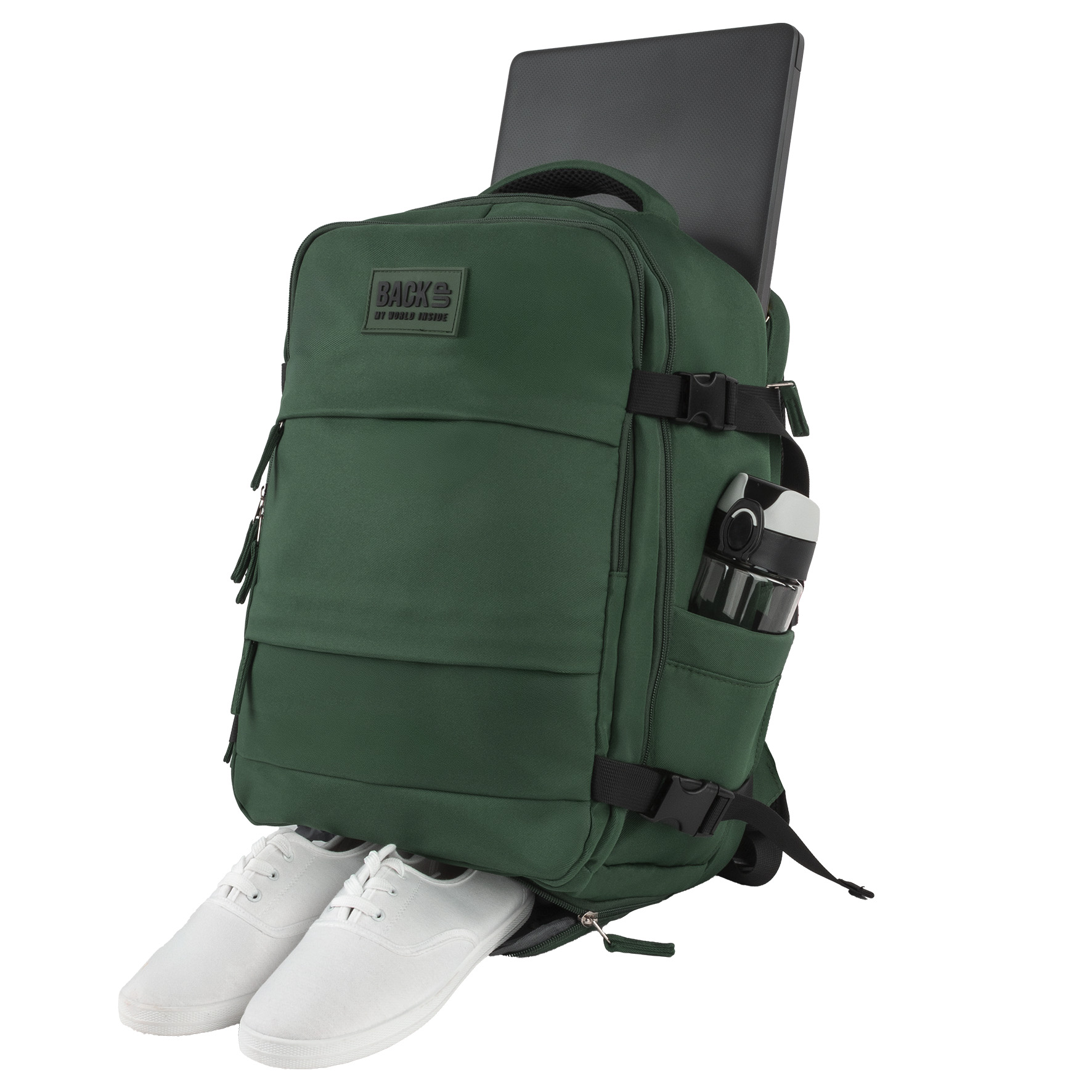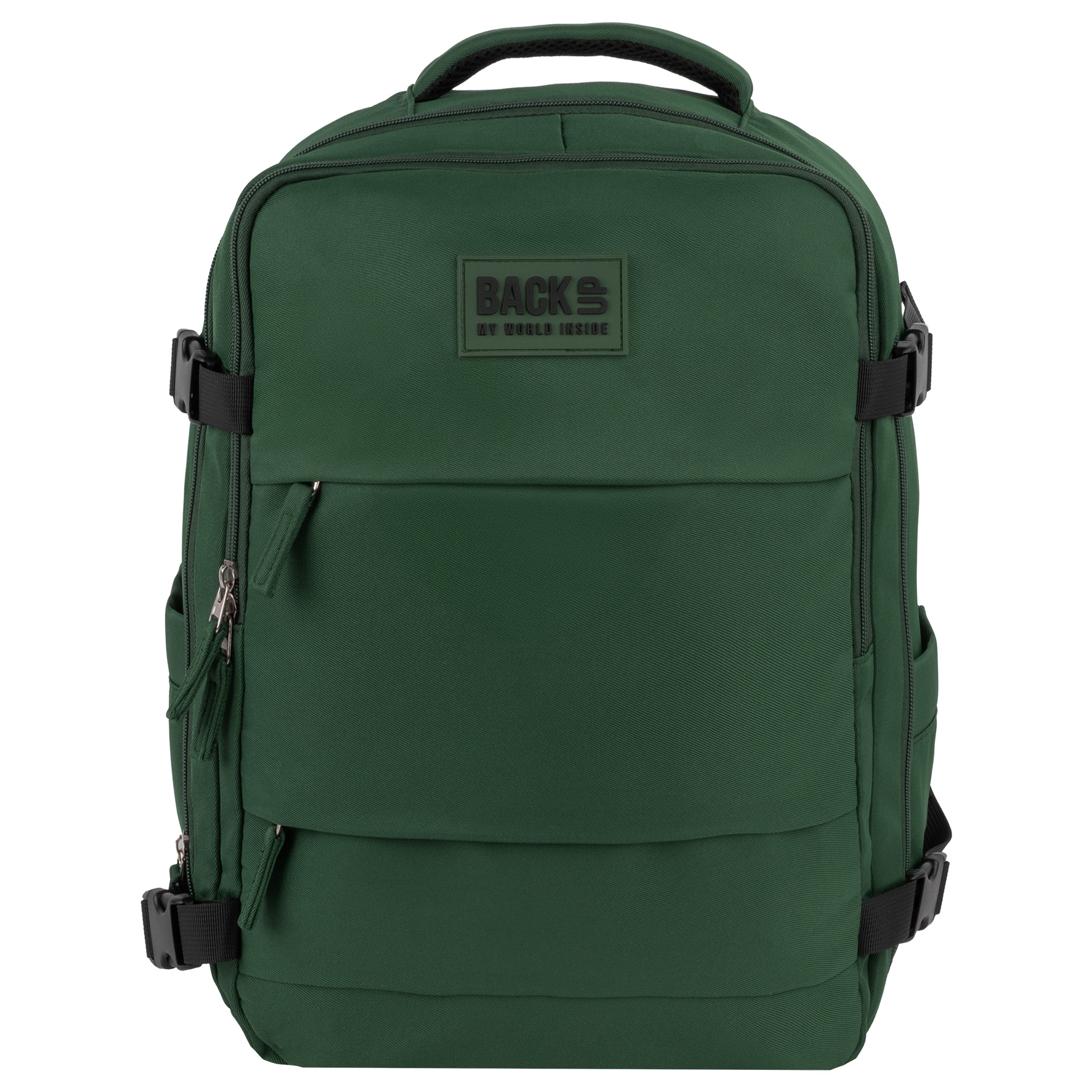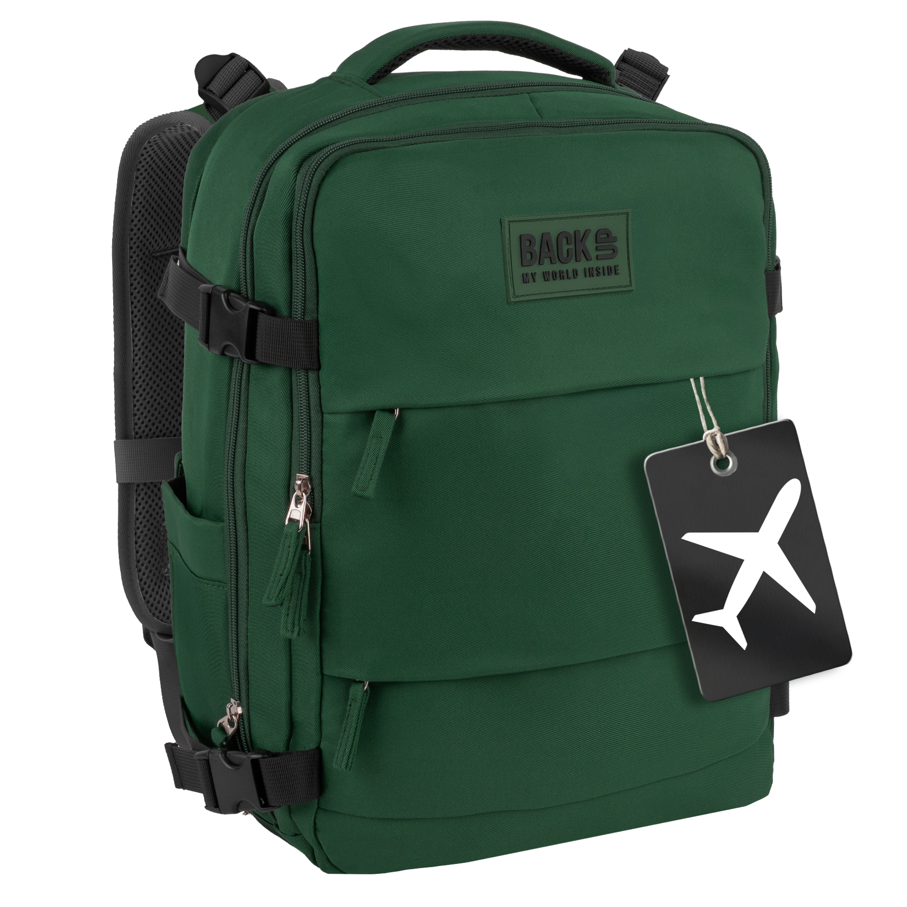 Głęboki, elegancki odcień zieleni butelkowej z kontrastującymi czarnymi akcentami (zamki, paski kompresyjne). Idealny dla mężczyzn i kobiet. Rozmiar gwarantuje, że plecak idealnie wpasuje się do miarki bagażowej. Paski kompresyjne pozwalają na zmniejszenie objętości plecaka w razie potrzeby.