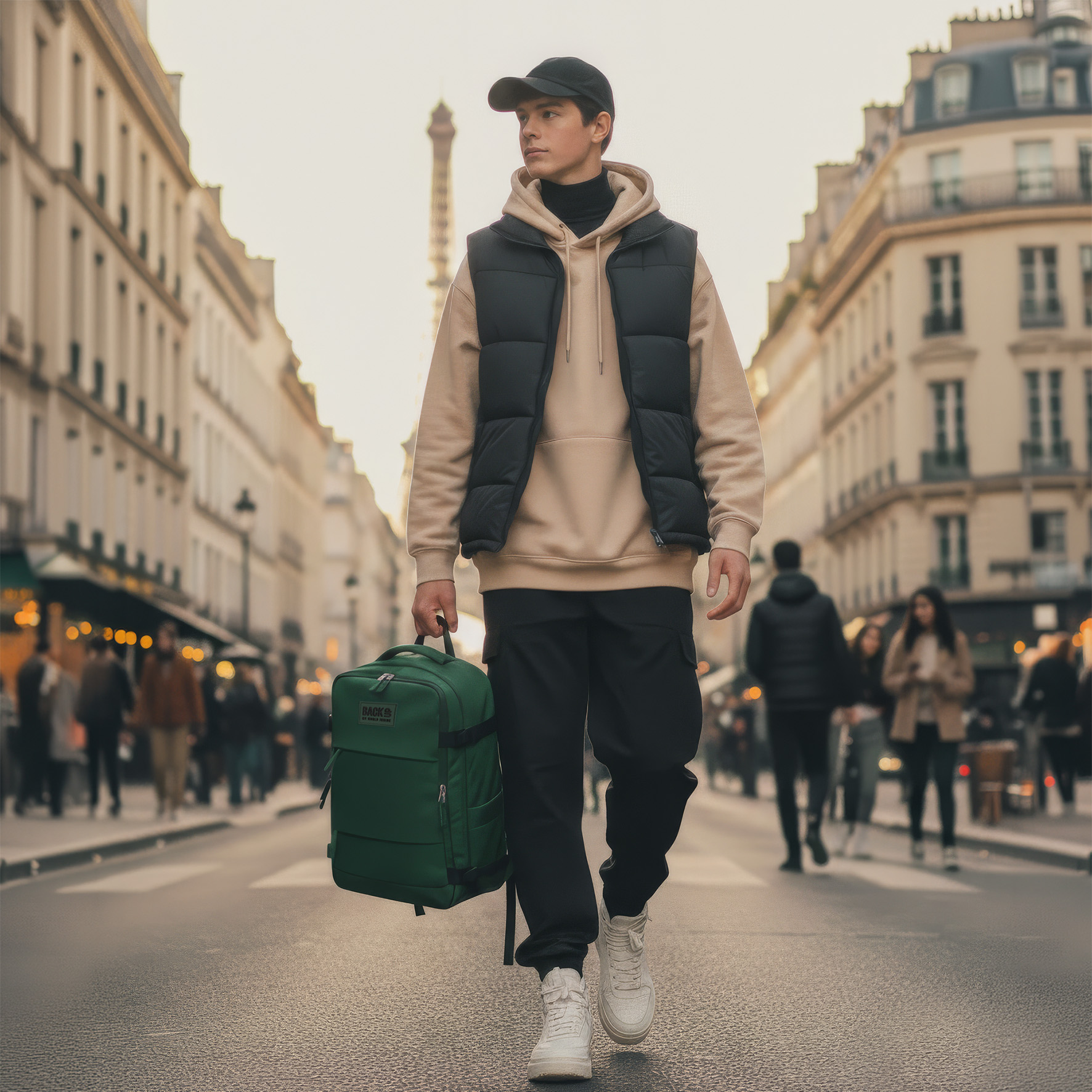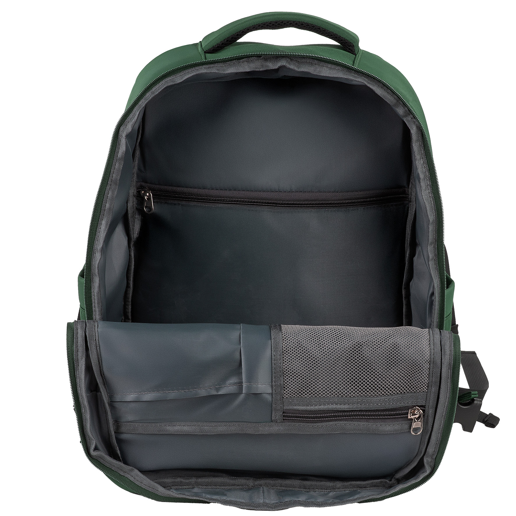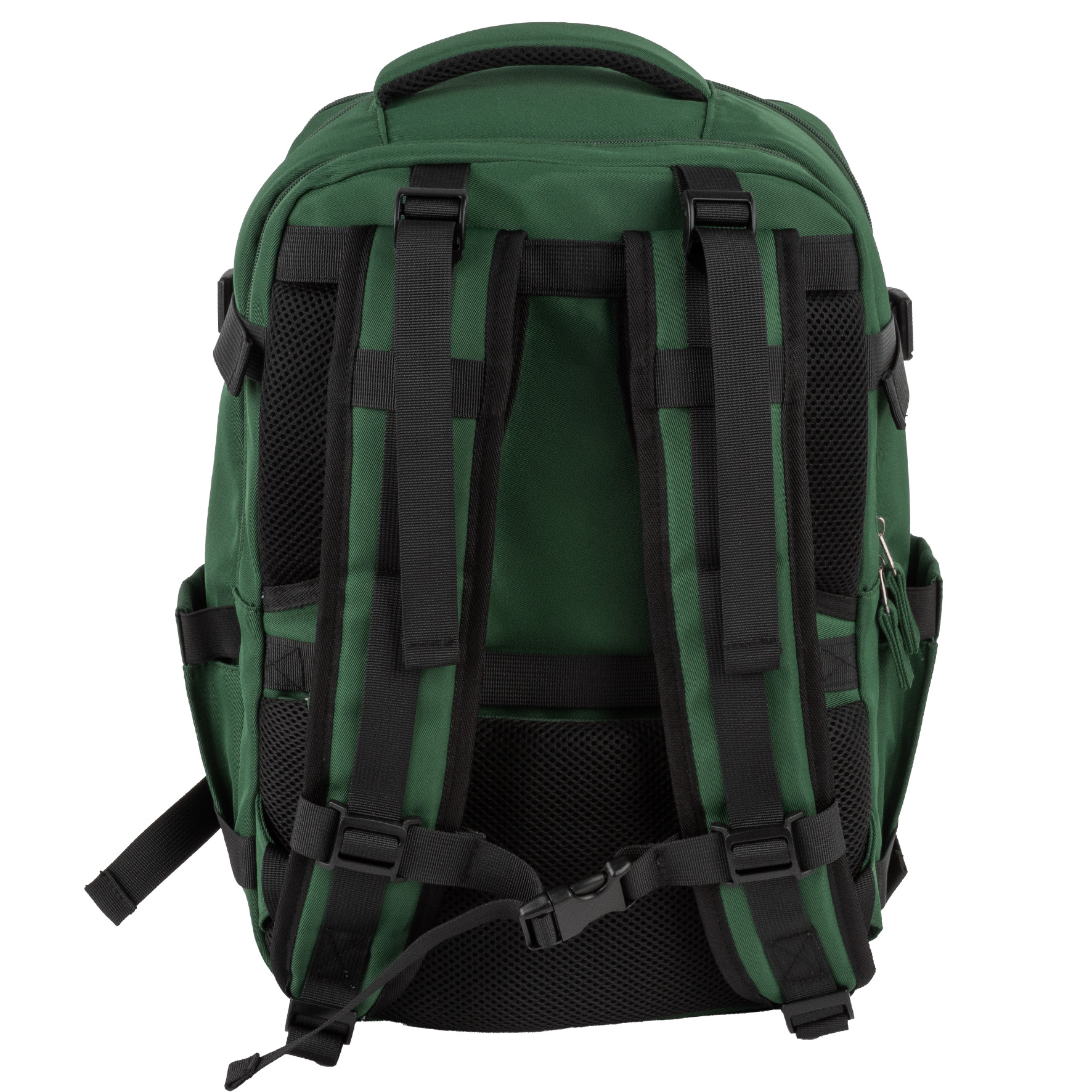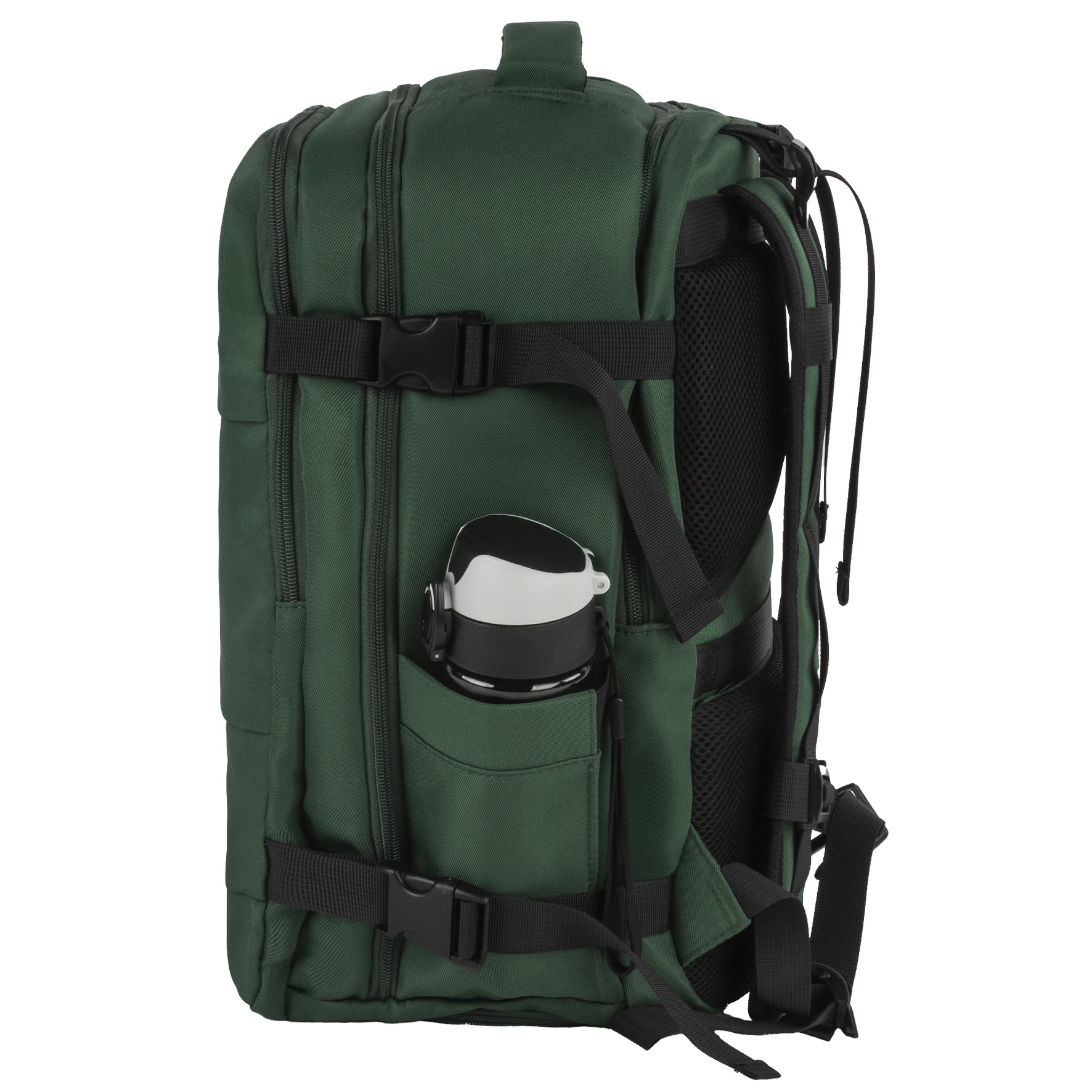 Głęboki, elegancki odcień zieleni butelkowej z kontrastującymi czarnymi akcentami (zamki, paski kompresyjne). Idealny dla mężczyzn i kobiet. Rozmiar gwarantuje, że plecak idealnie wpasuje się do miarki bagażowej. Paski kompresyjne pozwalają na zmniejszenie objętości plecaka w razie potrzeby.
