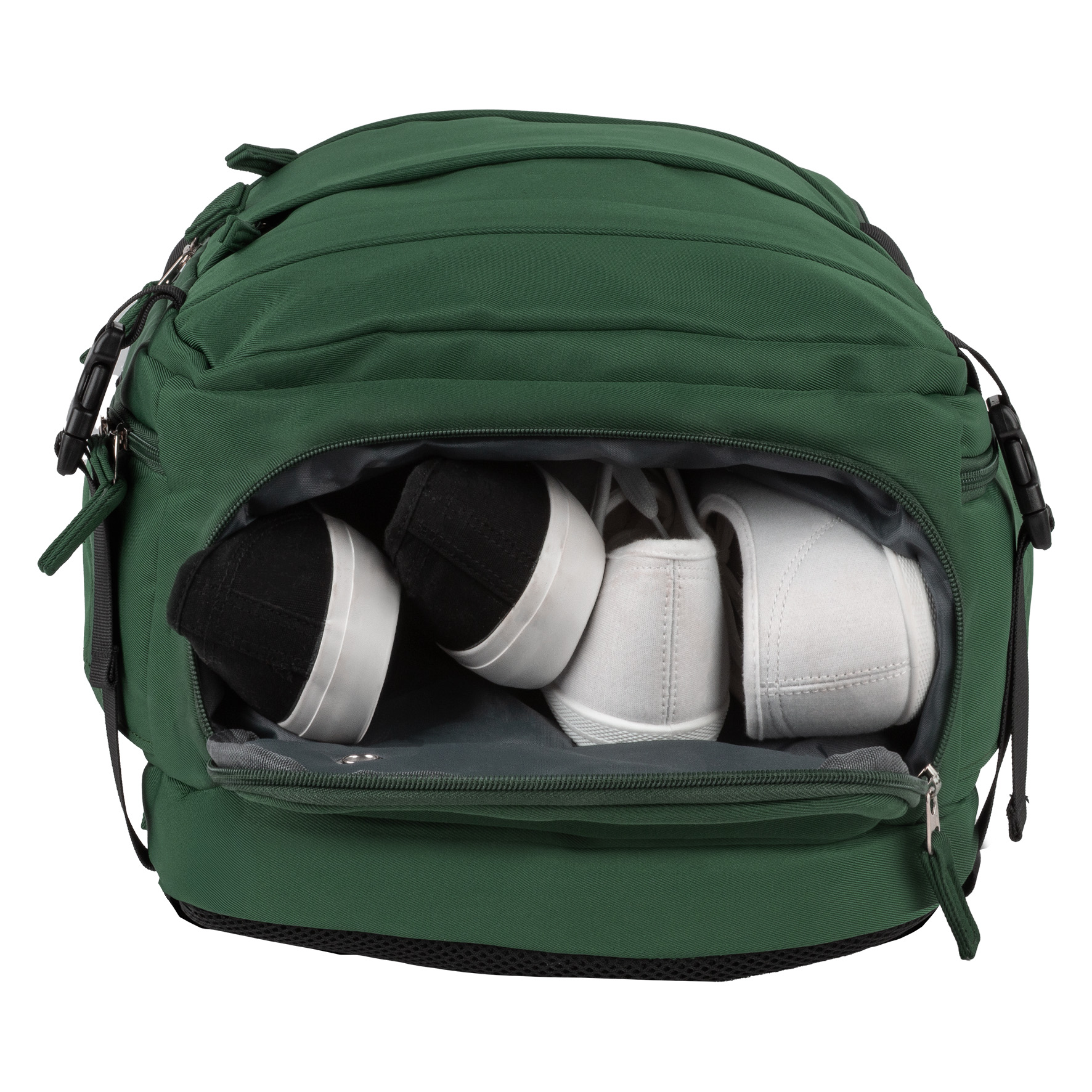 - 3 duże komory: duża główna, dolna na buty z wentylacją oraz przednia z kieszeniami