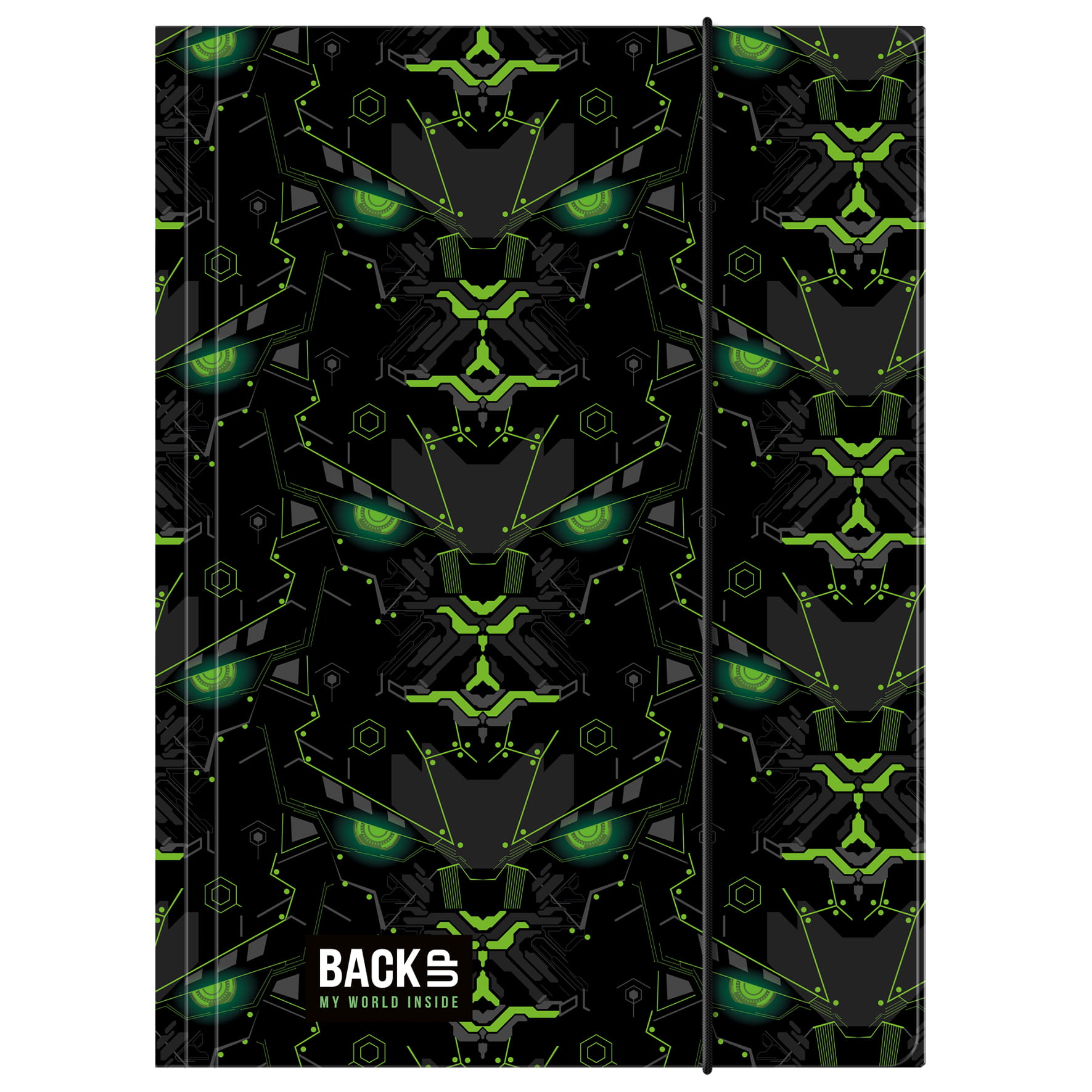 Błyszczące, szmaragdowe oczy spoglądają złowieszczo z czarnego materiału. Mechaniczne twarze robotów zdobią teczkę z gumką, dodając jej tajemniczego wyglądu. Zieleń robotycznych elementów odznacza się na klasycznej czerni i przykuwa wzrok. Teczka A4 przypadnie do gustu każdemu nastolatkowi zafascynowanemu światem fantastyki, robotów i supebohaterów. Zamykana gumką z wewnętrznymi klapami teczka A4 posiada dwustronny nadruk i zapewnia doskonałą jakość oraz trwałość produktu. Z łatwością pomieści wszystkie klasówki, kartkówki i prace plastyczne.