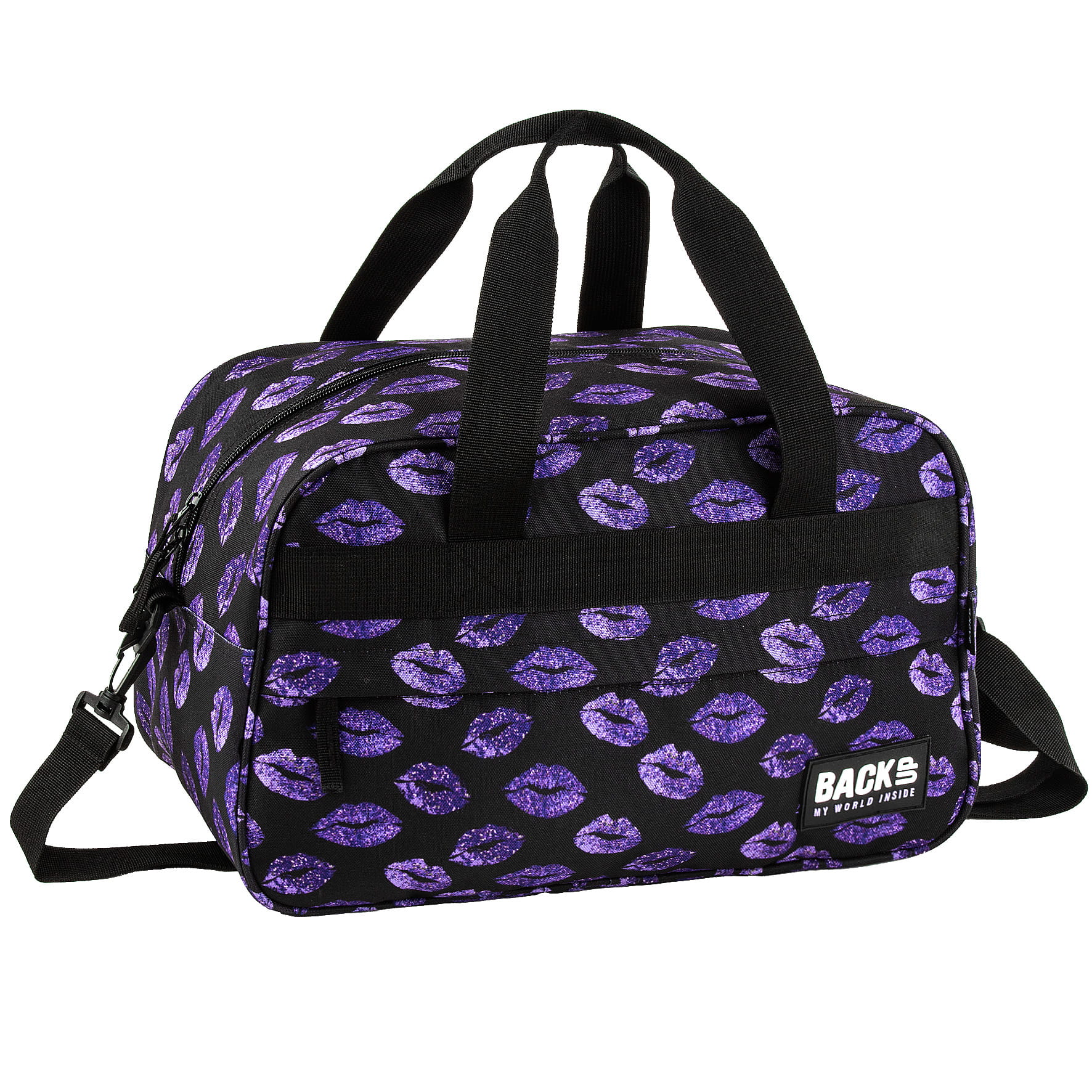Fioletowe, błyszczące usta na intensywnej czerni. Przypominają odciski całusów. Ich powierzchnia mieni się brokatowym blaskiem tworząc niesamowity efekt. Czarne zamki dopełniają całość, dodając torbie subtelnej elegancji i nowoczesności. Ten wyjątkowy design łączy w sobie młodzieżowy charakter z odrobiną glamour.