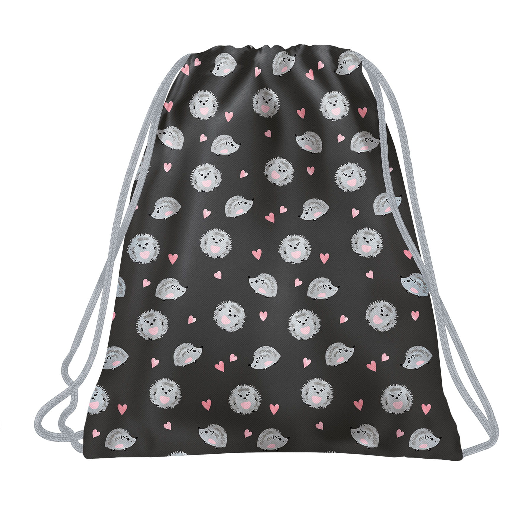 Dokąd tupta jeż? Prosto na worek BackUP! Urocze jeżyki są już gotowe na pierwsze szkolne przygody. Ciemnoszary materiał worka usłany jest nimi po brzegi, a różowe serduszka dodają małym milusińskim jeszcze więcej uroku.