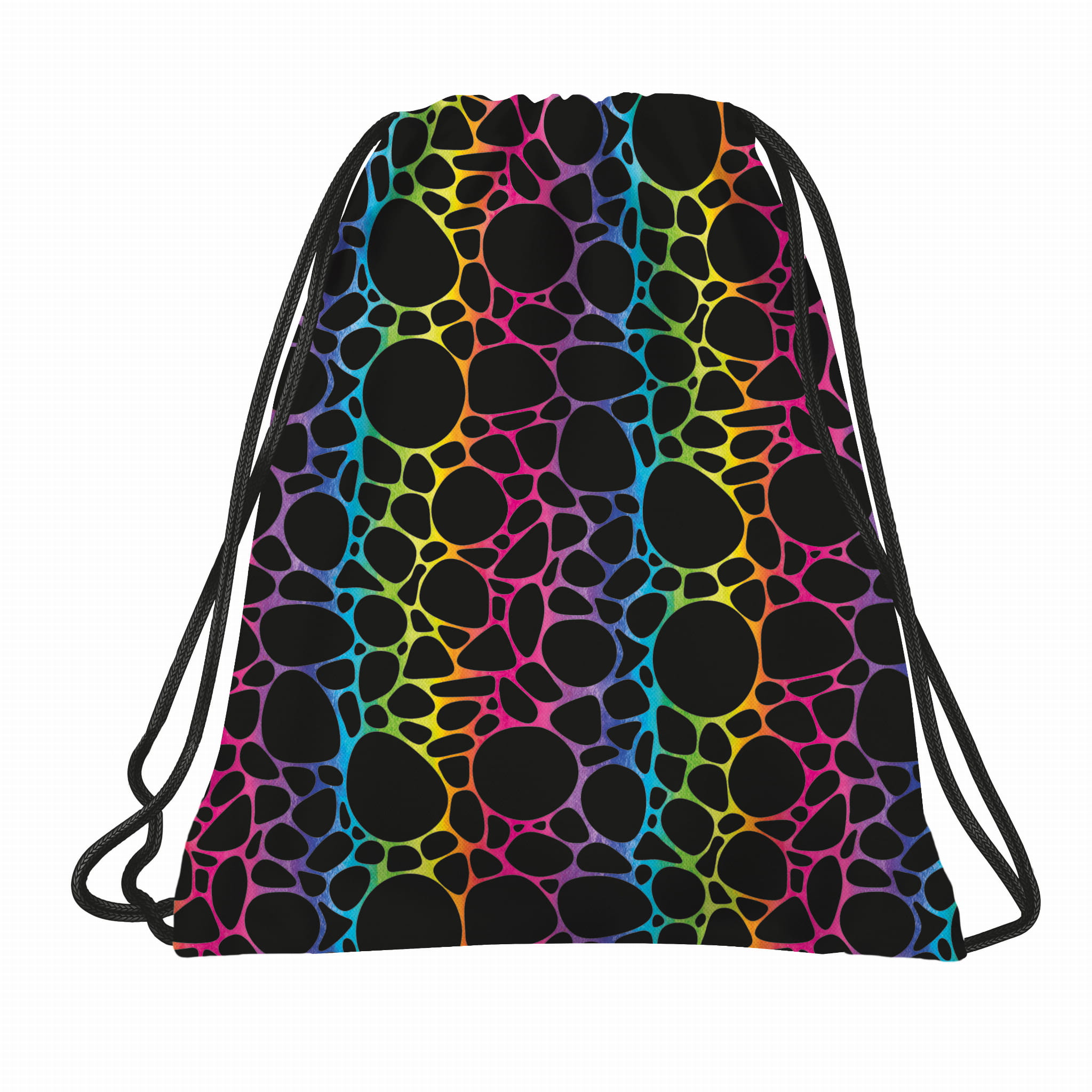 Fuzja kolorów. Posiada czarne tło, które doskonale kontrastuje z unikalnym wzorem bąbelków. Układają się w dynamiczny, kolorowy motyw, tworząc przyciągający wzrok efekt tęczy - gradient odcieni: od słonecznej żółci, przez energetyczną zieleń, chłodny błękit, aż po wyrazisty róż.