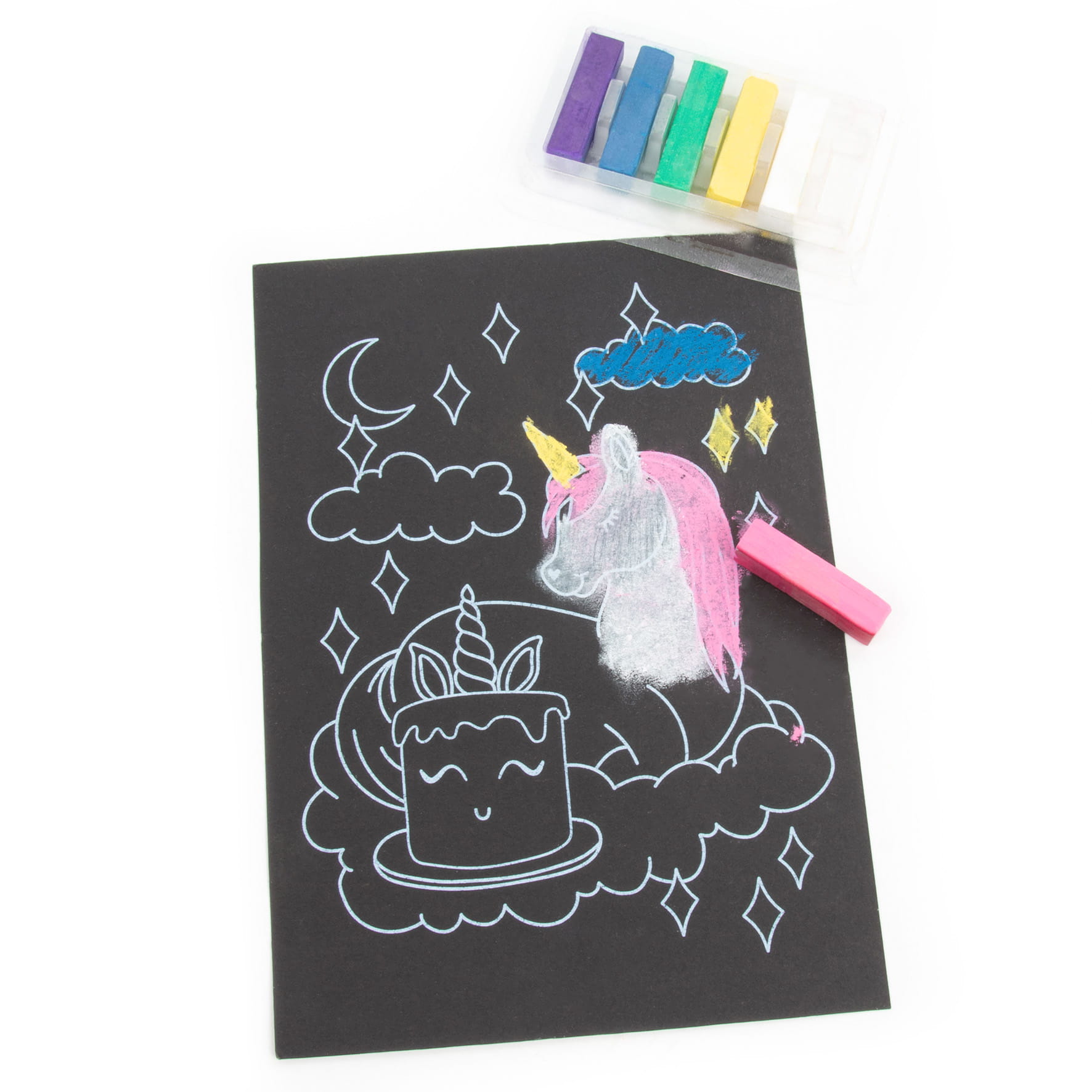 Pastele suche dla dzieci z 6 arkuszami z obrazkami z jednorożcem do pokolorowania. 6 pasteli w kolorze różowym, białym, zielonym, niebieskim, fioletowym oraz żółtym intensywnie odznacza się na czarnych arkuszach papieru. Pastele miękko rozprowadzają się po powierzchni kartki i z łatwością można je rozcierać aby mieszać ze sobą różne kolory lub wykonać cieniowanie. Po skończonym kolorowaniu wystarczy odwrócić arkusz i stworzyć własne dzieło na pustej stronie. To idealny prezent dla dziecka, które rozpoczyna swoja przygodę z techniką rysowania pastelami.