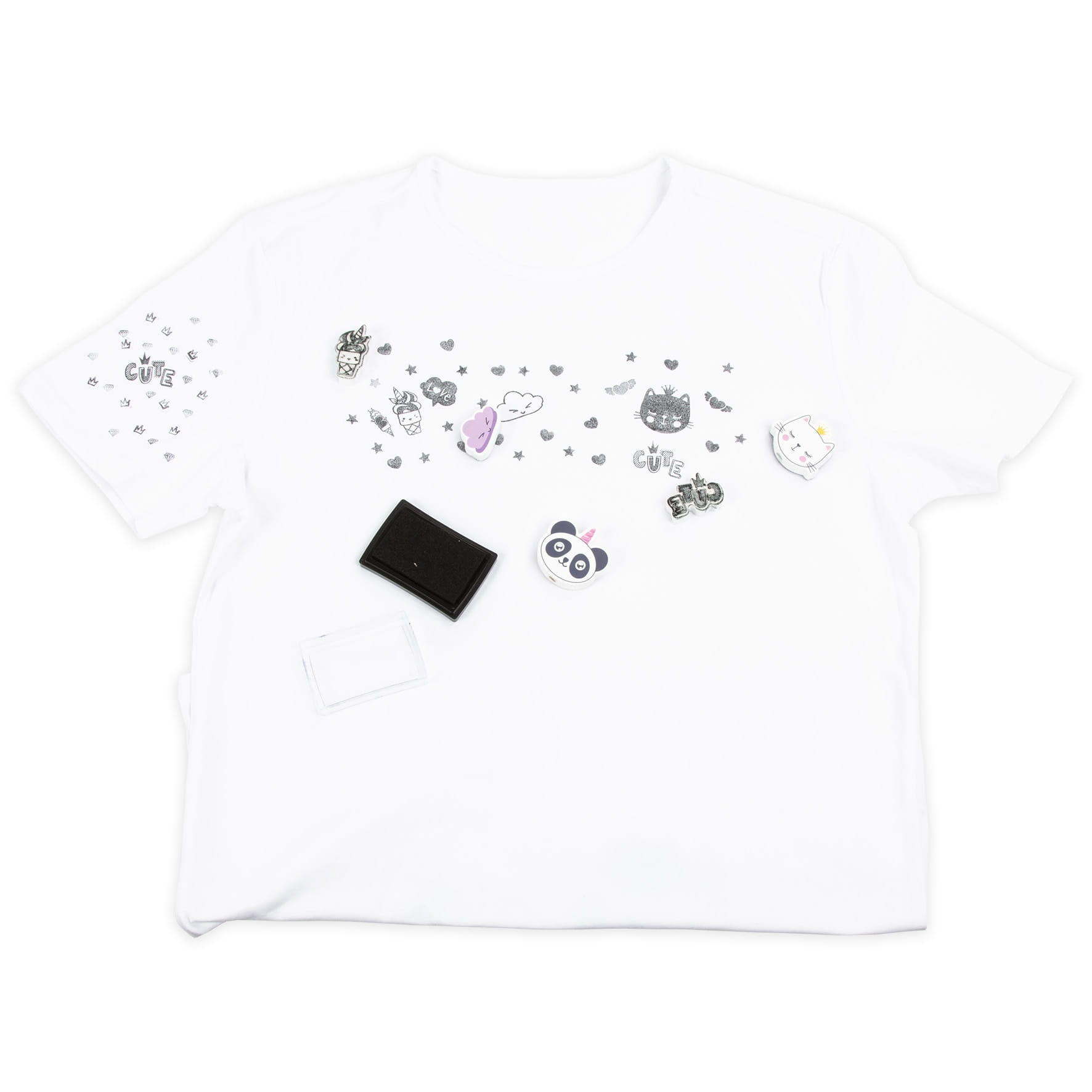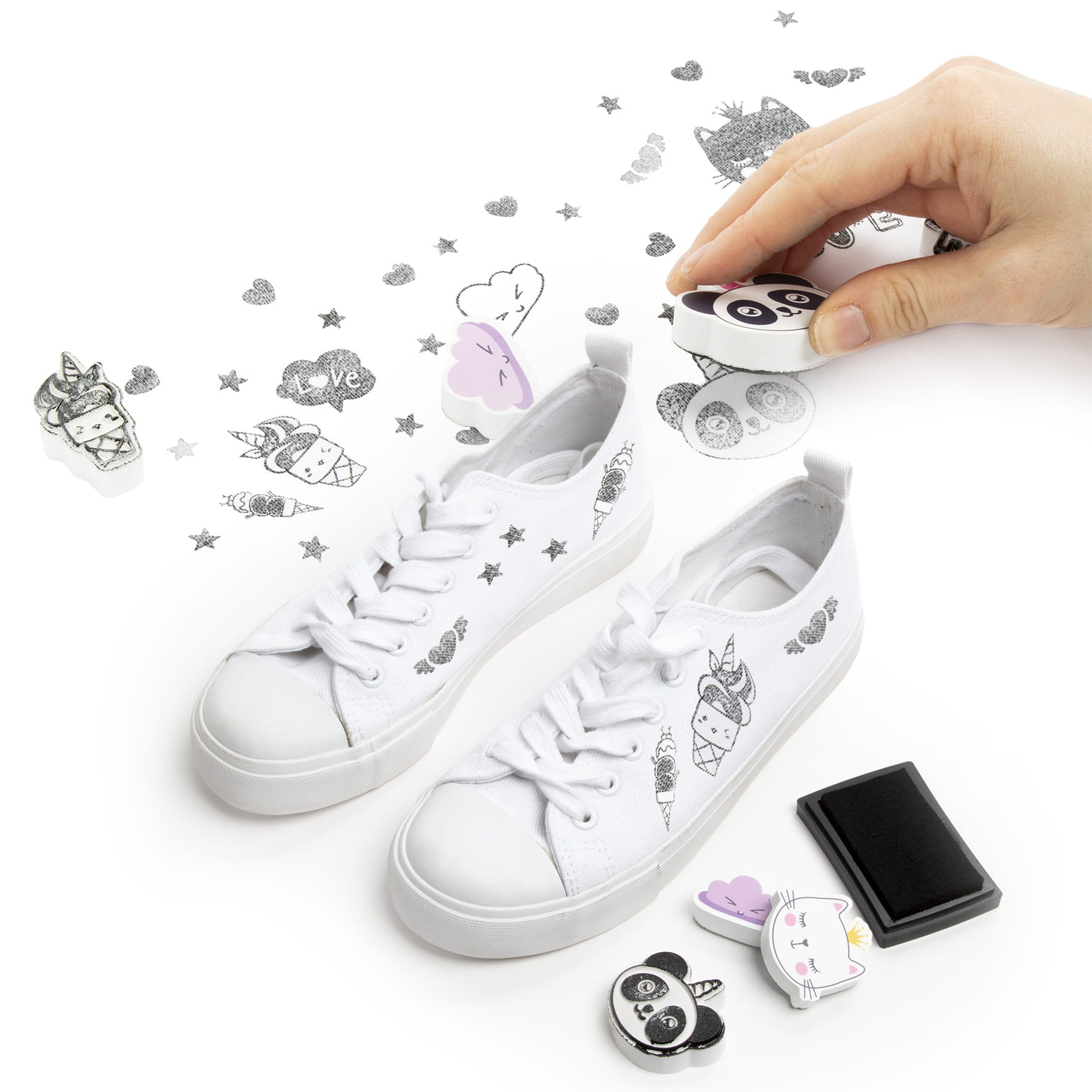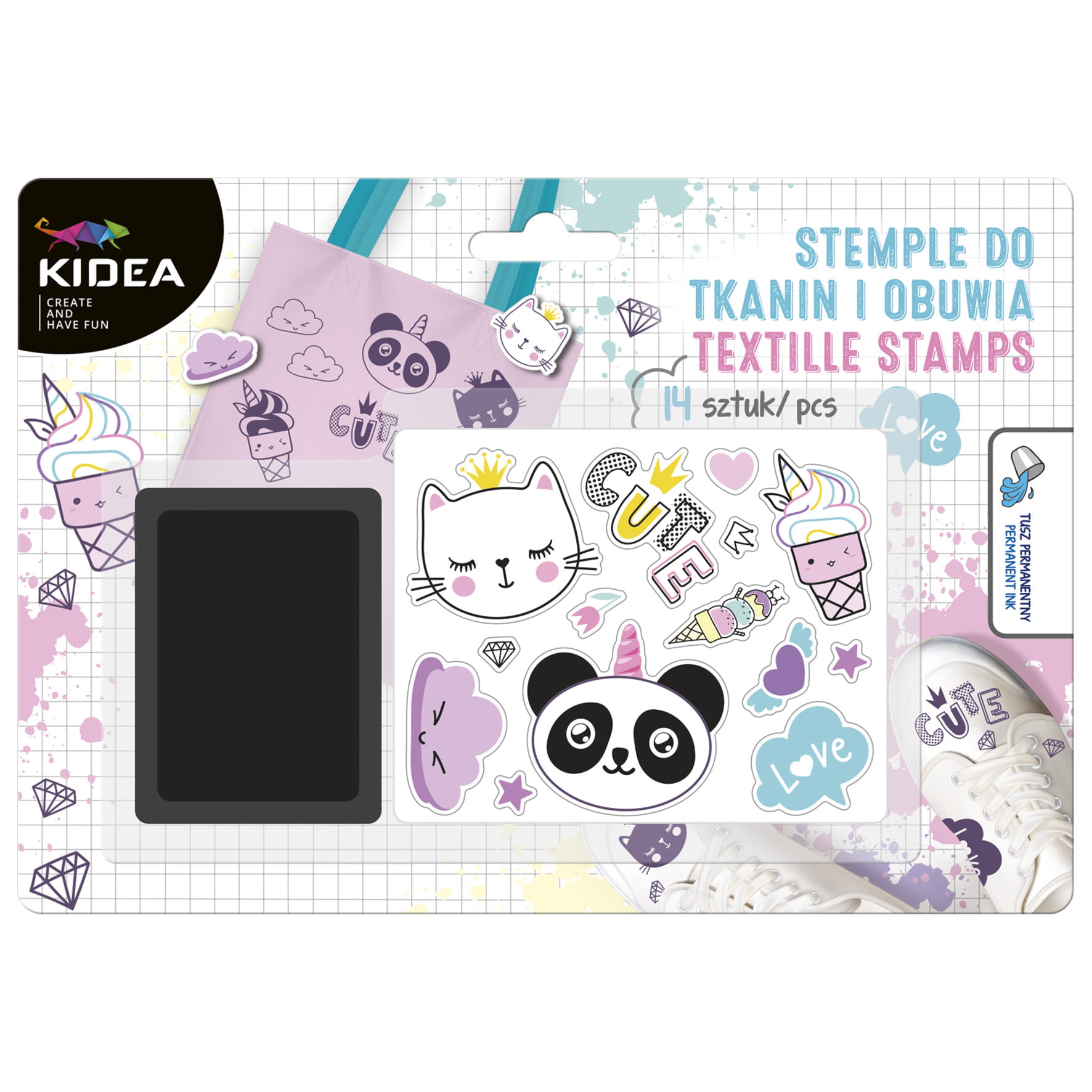 Zestaw stempli do dekoracji tkanin i obuwia z tuszem permanentnym od Kidea. Gumowe stempelki w aż 14 różnych kształtach mogą posłużyć do dekoracji zarówno koszulek czy spodni, jak i obuwia lub materiałowych toreb. Pieczatki precyzyjnie odbijają sie na materiale, a po zaprasowaniu i upływie 24 godzin, nie spierają sie podczas prania w 30°. Duża poduszka z czarnym tuszem ułatwia aplikacje produktu i jest niezwykle wydajna, pozwalając tym samym na dekoracje wielu tkanin. Różnorodność wzorów pozwala na stworzenie wielu oryginalnych, kreatywnych i jedynych w swoim rodzaju stylizacji.